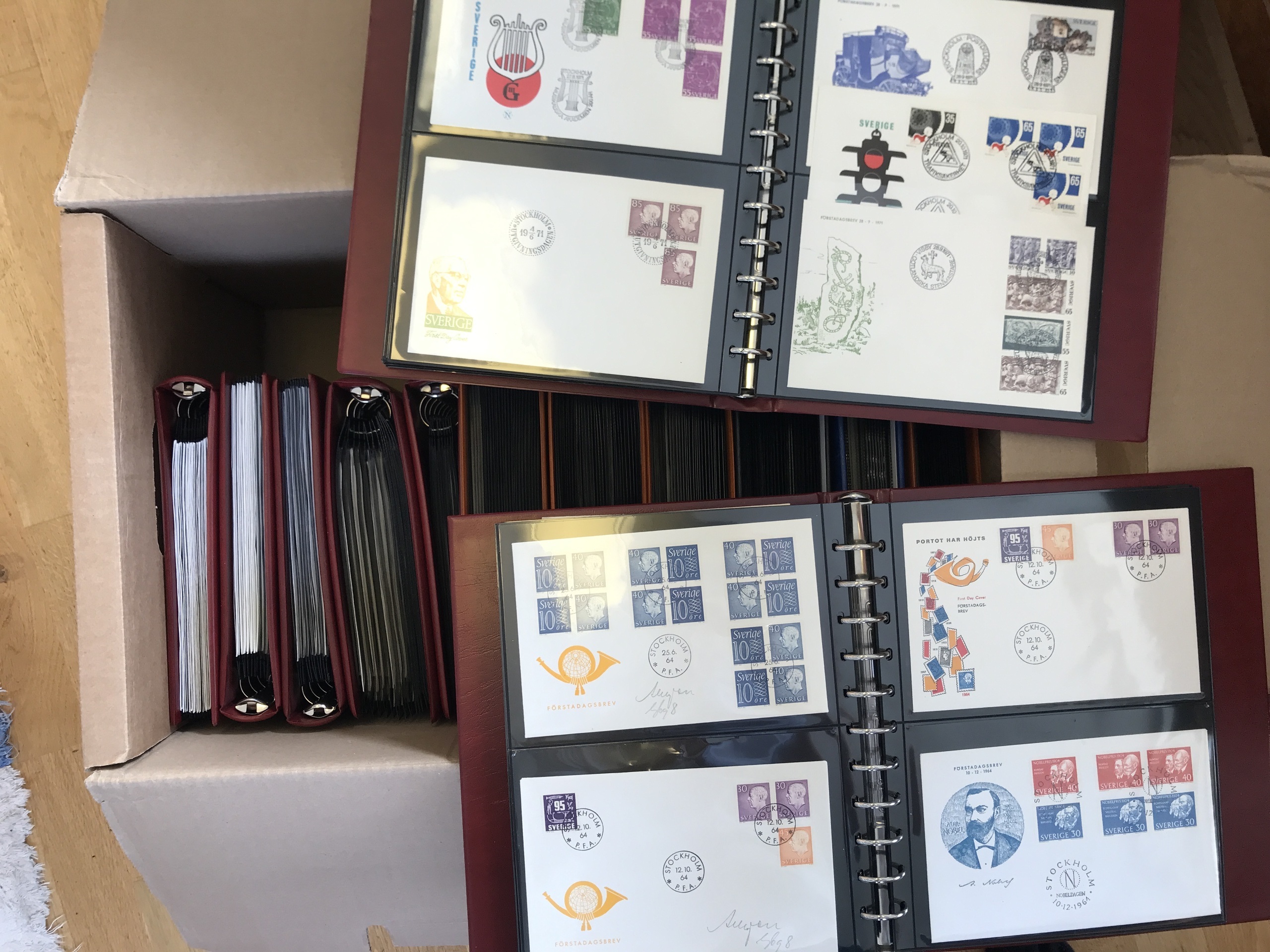 Sweden. FDCs. Collection ca 1940-99 incl. dupl. in 14 binders, e.g. many with vignettes. Also some others. Approx. 24 kg.