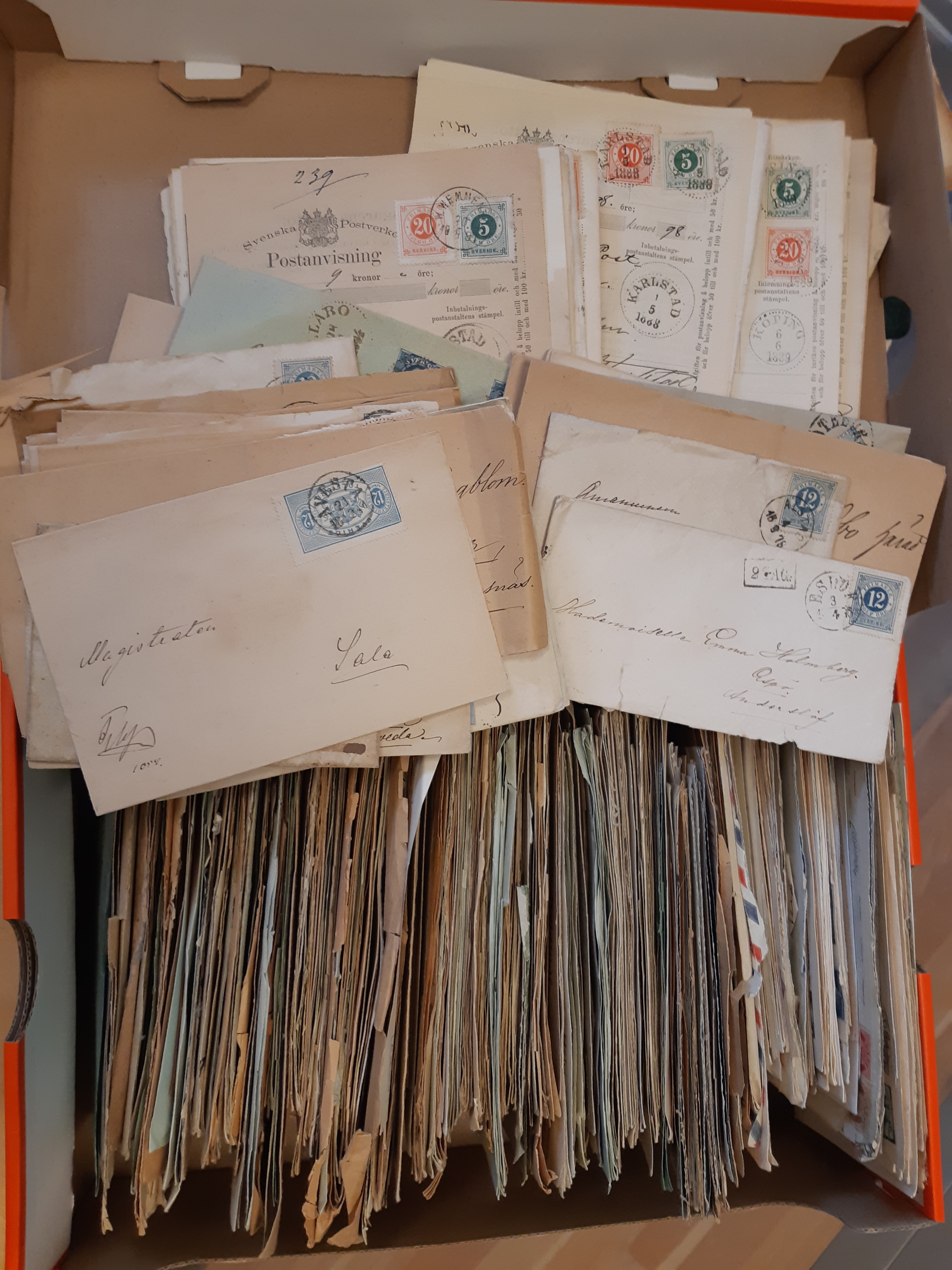 Sweden. Accumulation covers mostly 1890s–coil stamps in shoe box. Incl. 66 money orders franked with CT ph, many registered covers, etc. Also some foreign covers incl. several sent to Sweden. (300)