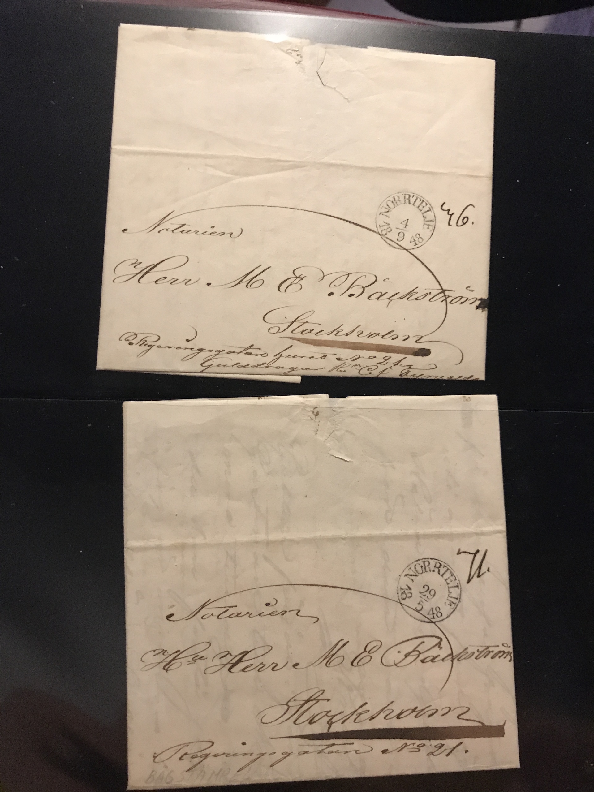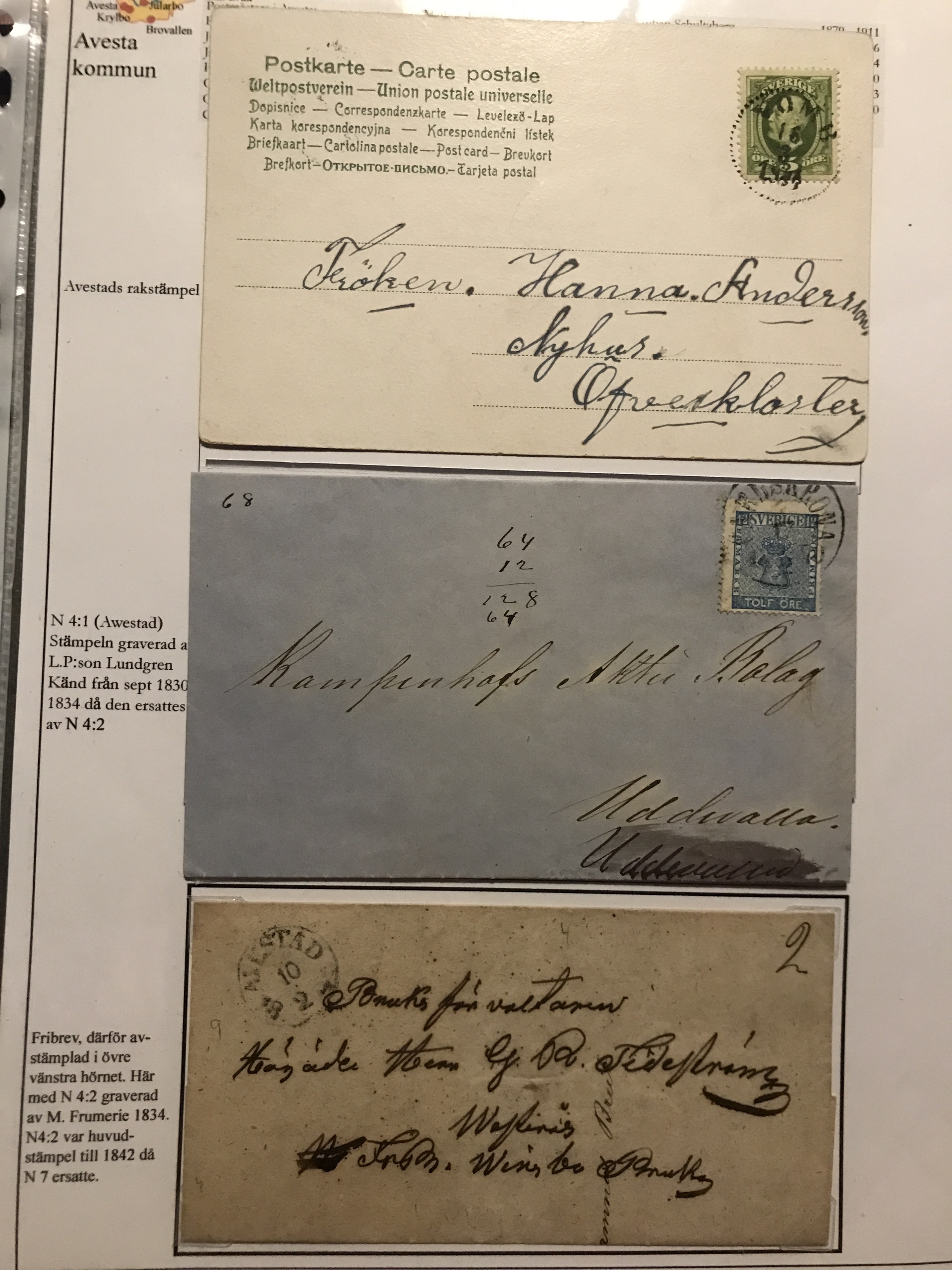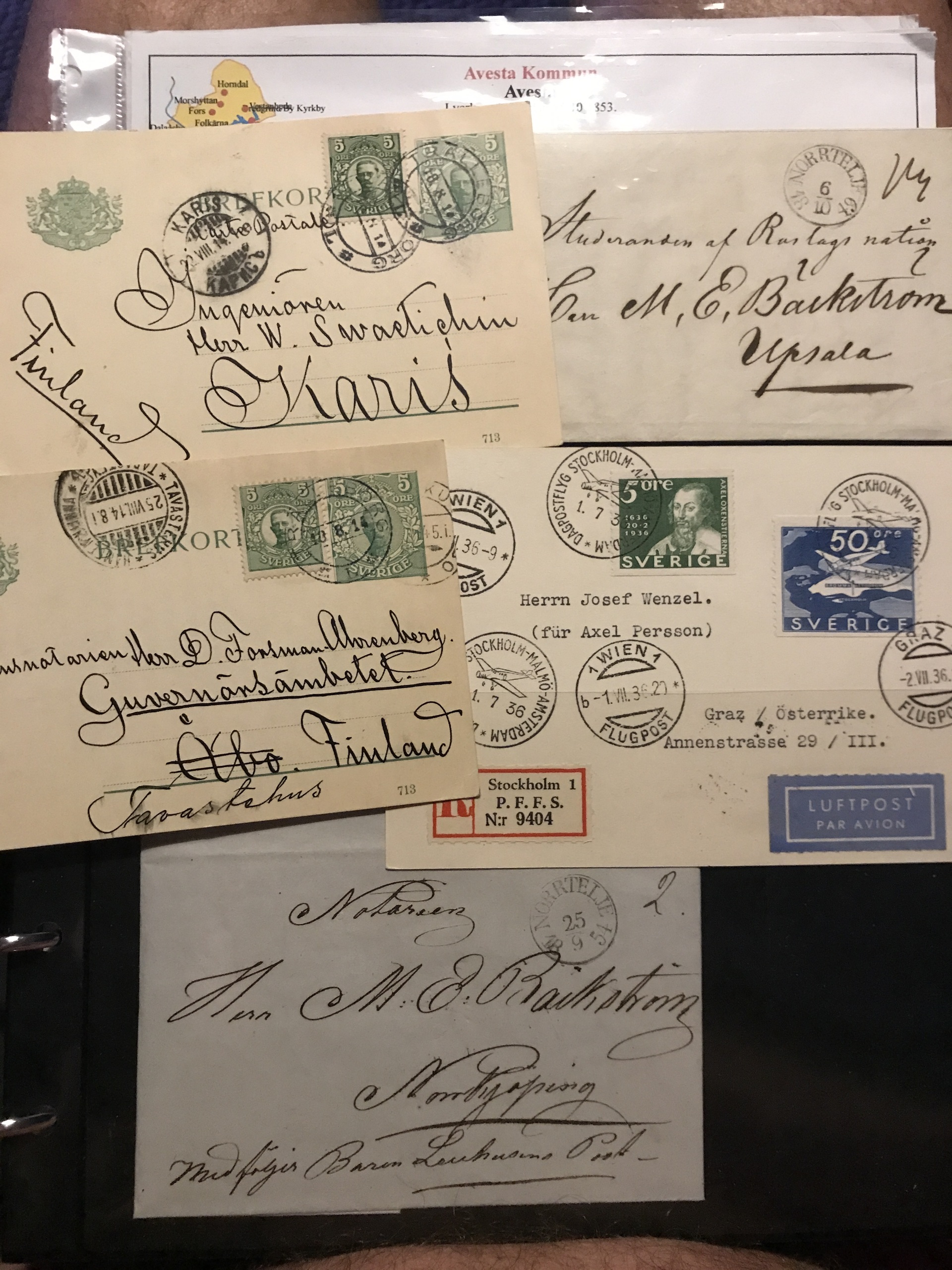 Sweden. Covers. Binder with about 65 covers and cards prephil-1940´s incl. letter dated "Fiholm 29 Juny 1749" sent to Westervik, six Norrtelje Arc postmarks, canc. Vomb on Oscar 1904 etc. Please see a selection of scans at www.philea.se.