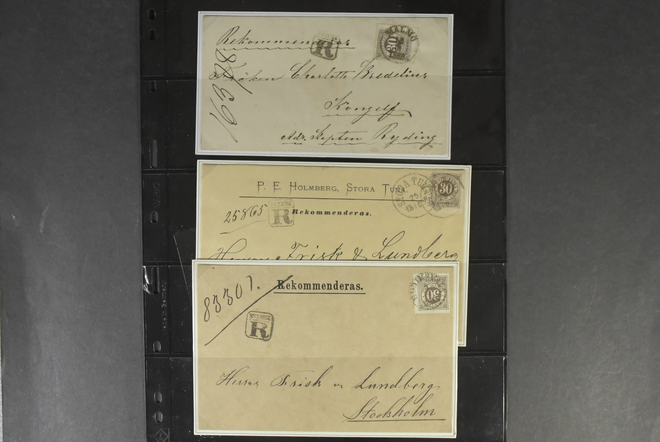 Sweden. Lot covers 1887–1891. Three very fine registred letters with single franking, 30 öre circular type perf. 13 with ph, all exhibition mounted. Fine quality.