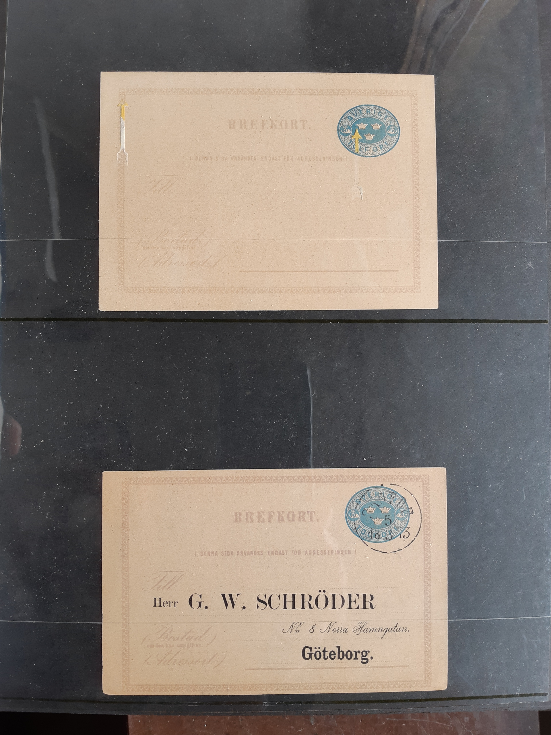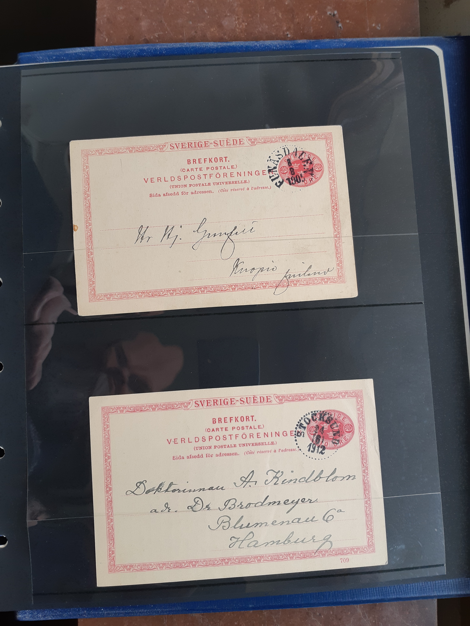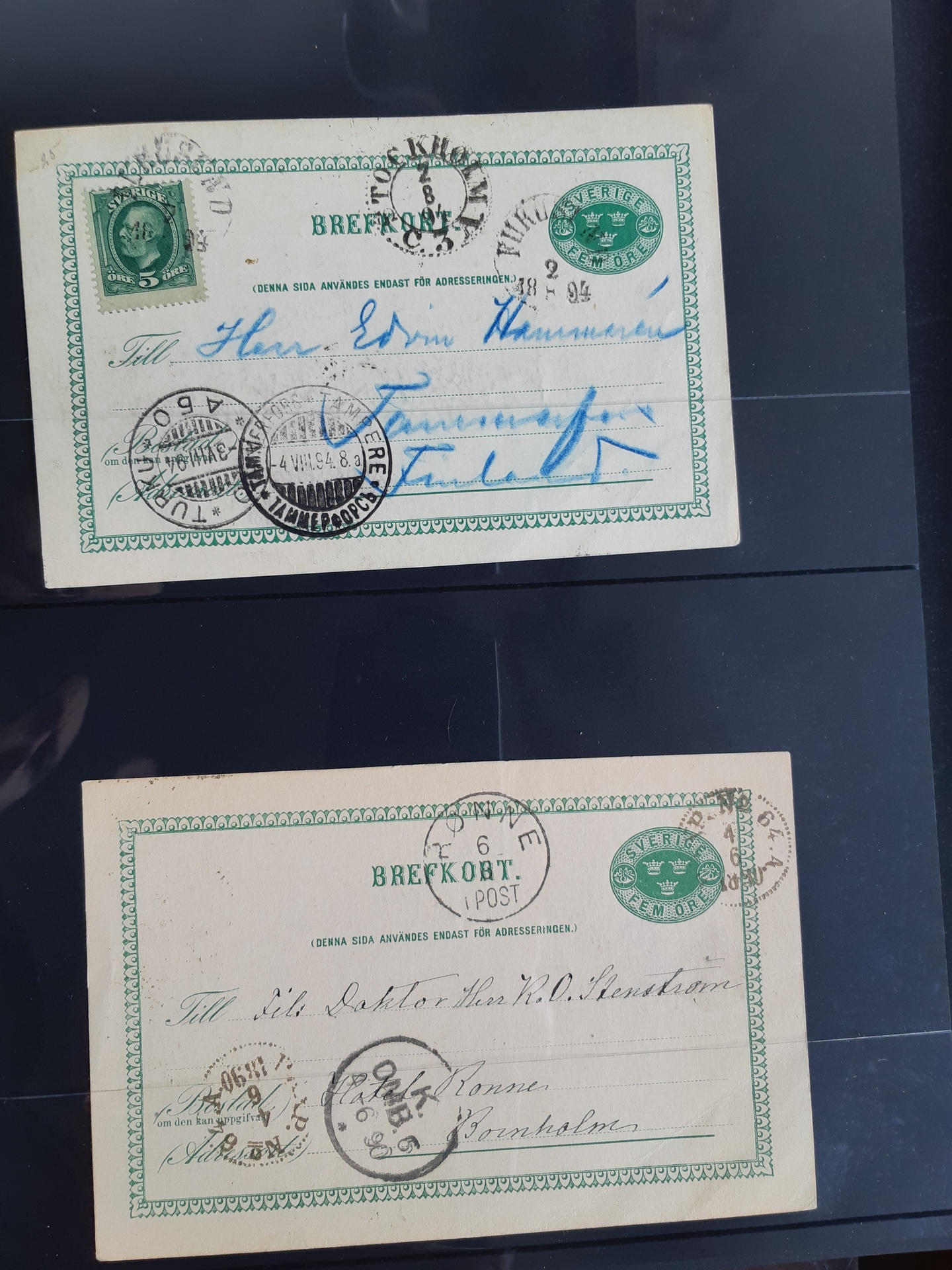 Sweden. Postal stationery, collection 1872–1940s in three visir albums. Single cards and reply-paid cards, unused and used incl. e.g. types, shades, date figures, a few additional franked, usages to abroad, censor, cancellations, etc. Approx. 7 kg. (300)
