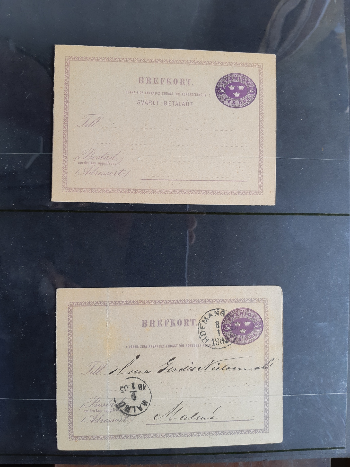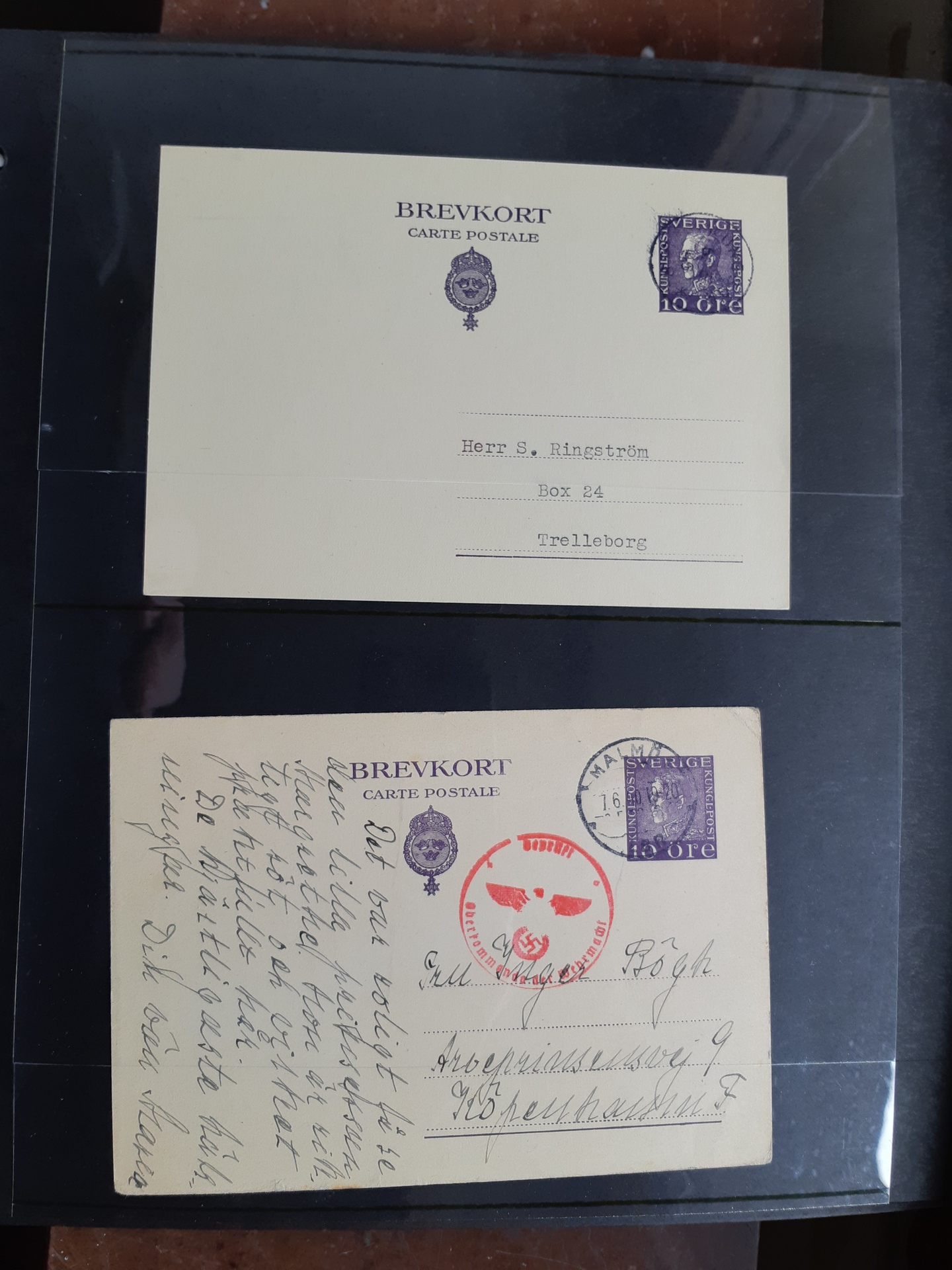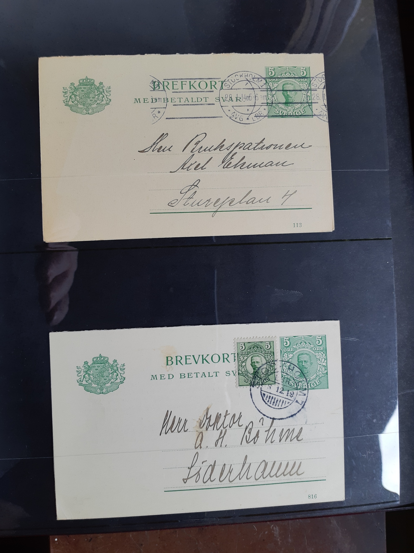 Sweden. Postal stationery, collection 1872–1940s in three visir albums. Single cards and reply-paid cards, unused and used incl. e.g. types, shades, date figures, a few additional franked, usages to abroad, censor, cancellations, etc. Approx. 7 kg. (300)