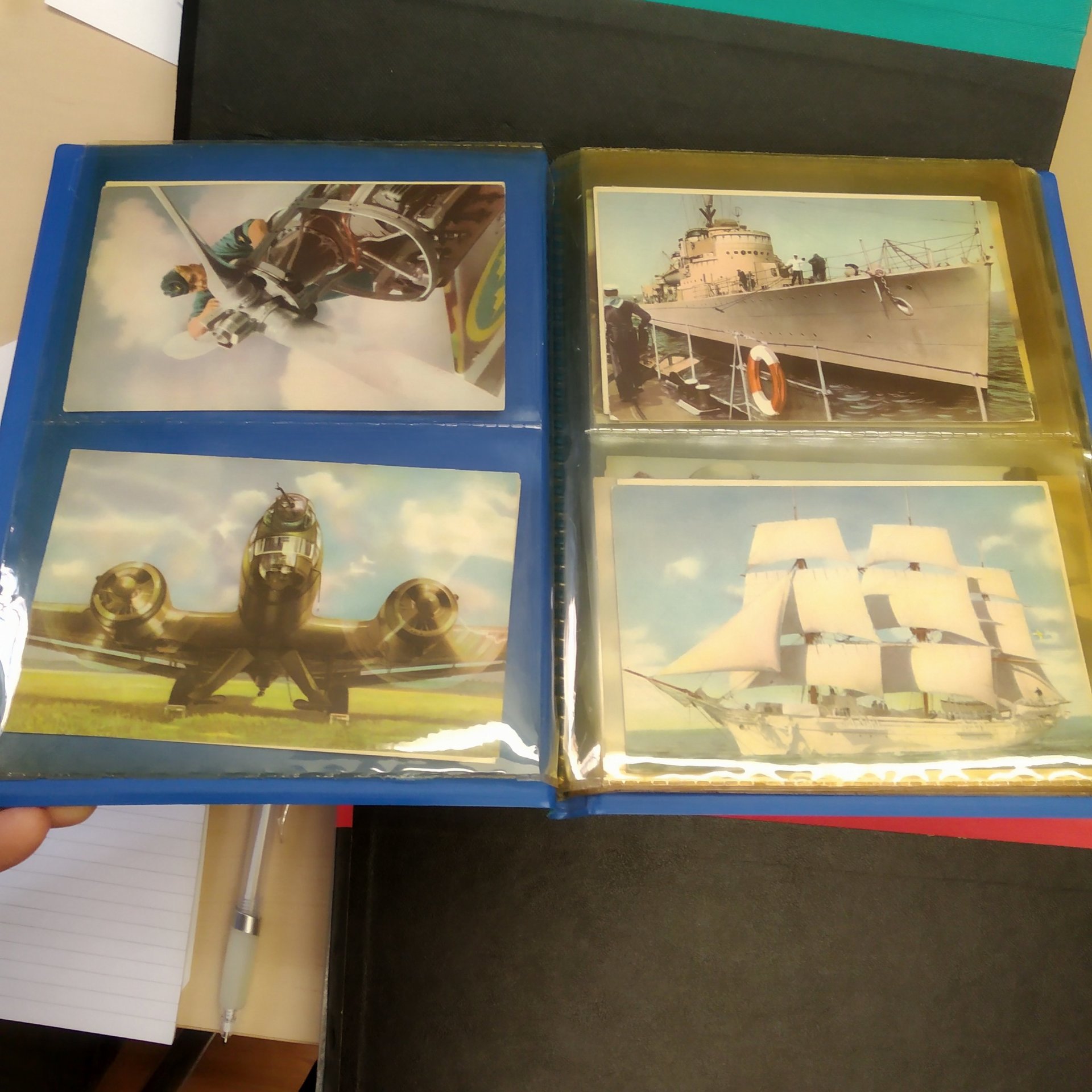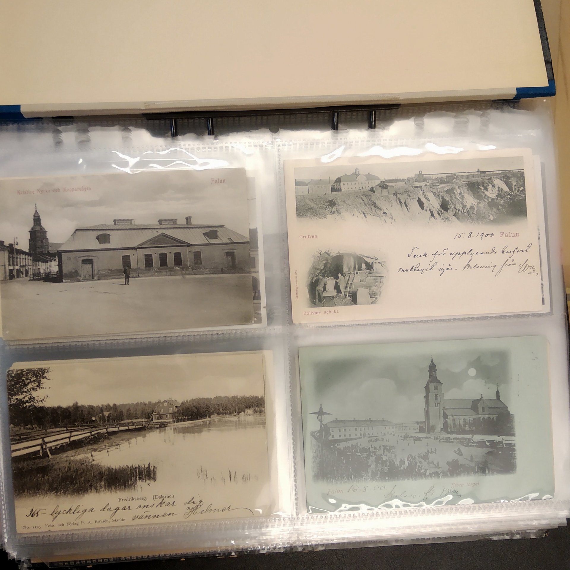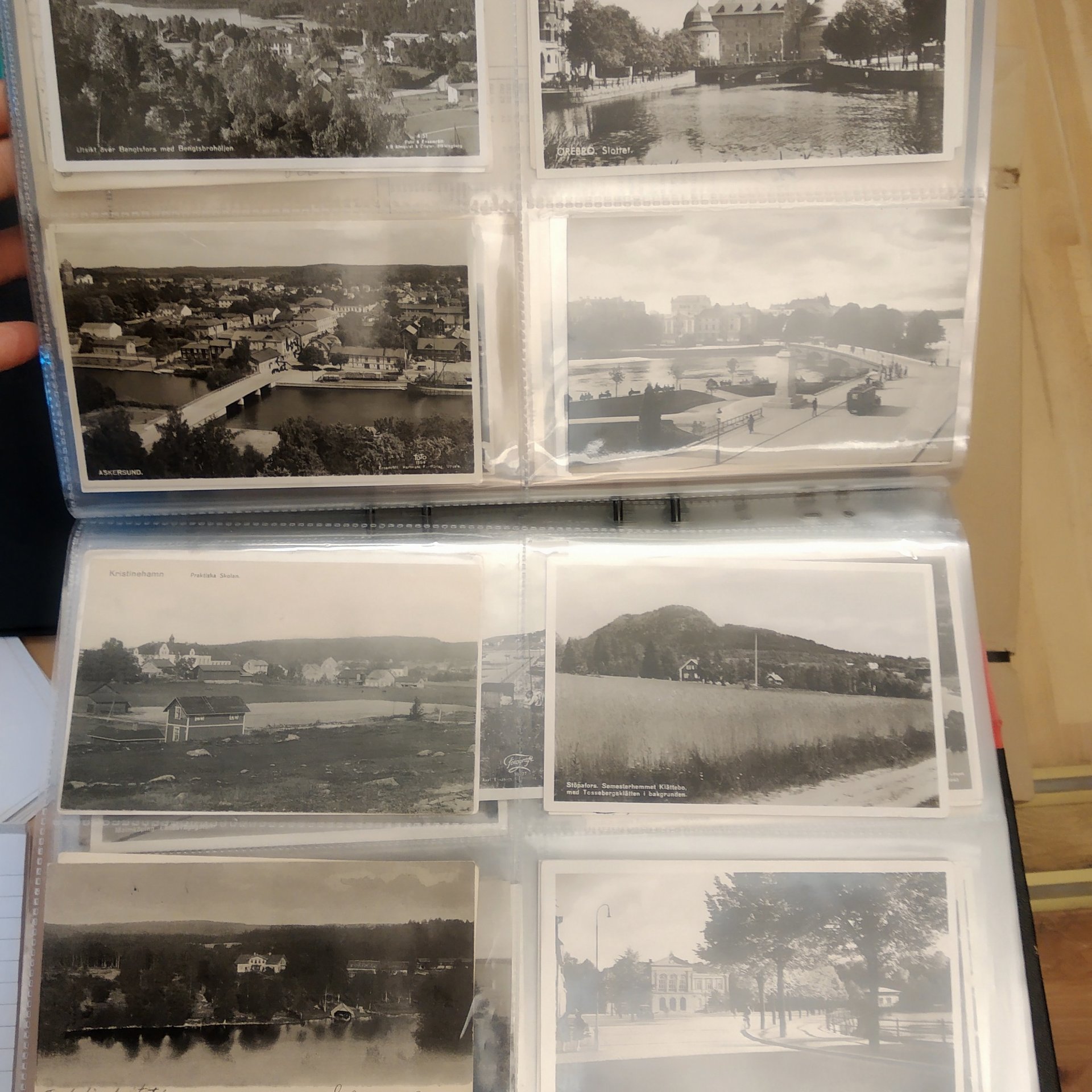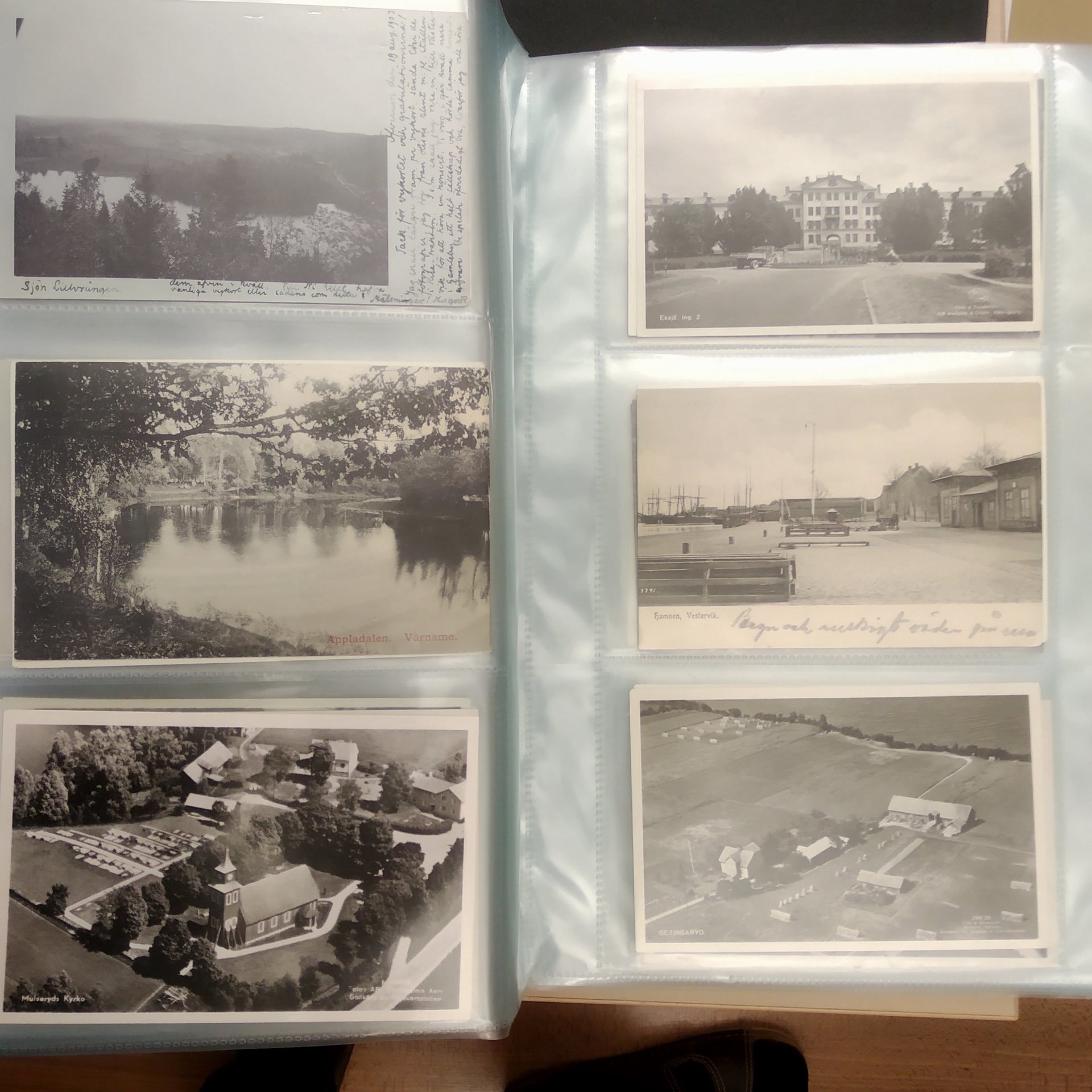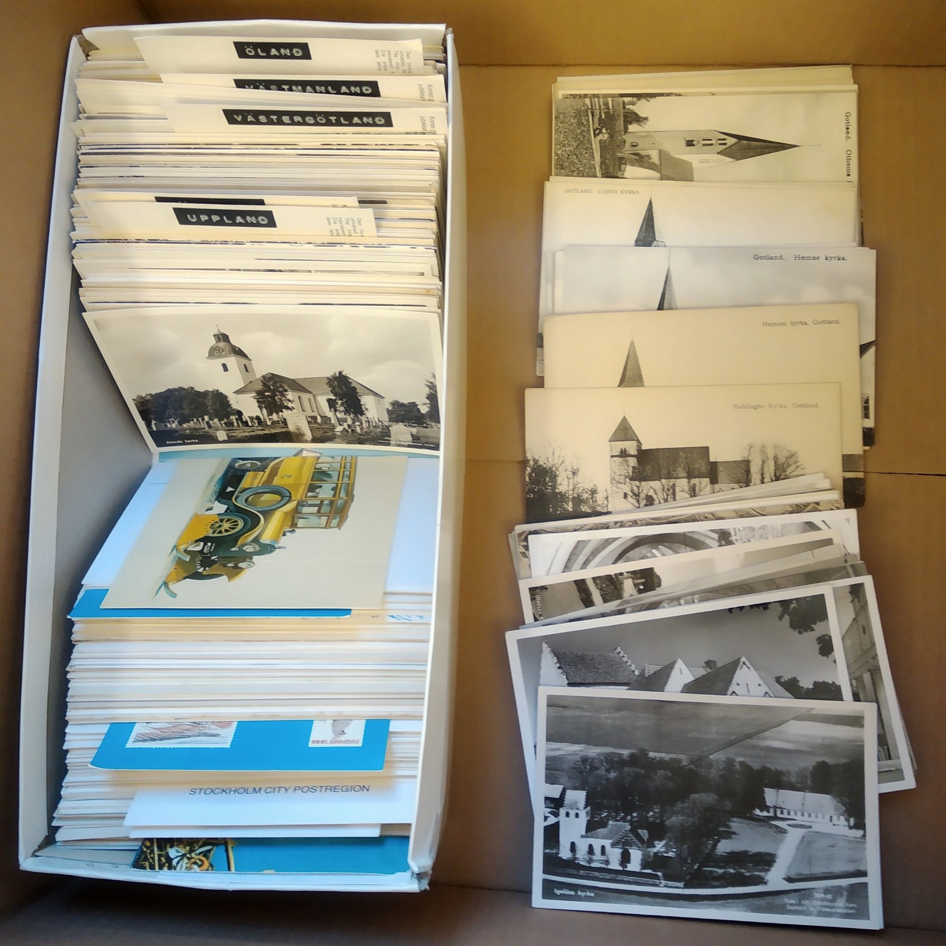 Sweden. Picture postcards, collection old–1950s in box. Topo mixed Sweden in two albums, mostly 1930–1950s (468) + shoebox churches and small album military (arme-, marin- and Flygfilm) (20). Good quality. Approx. 7 kg. (approx. 1000)