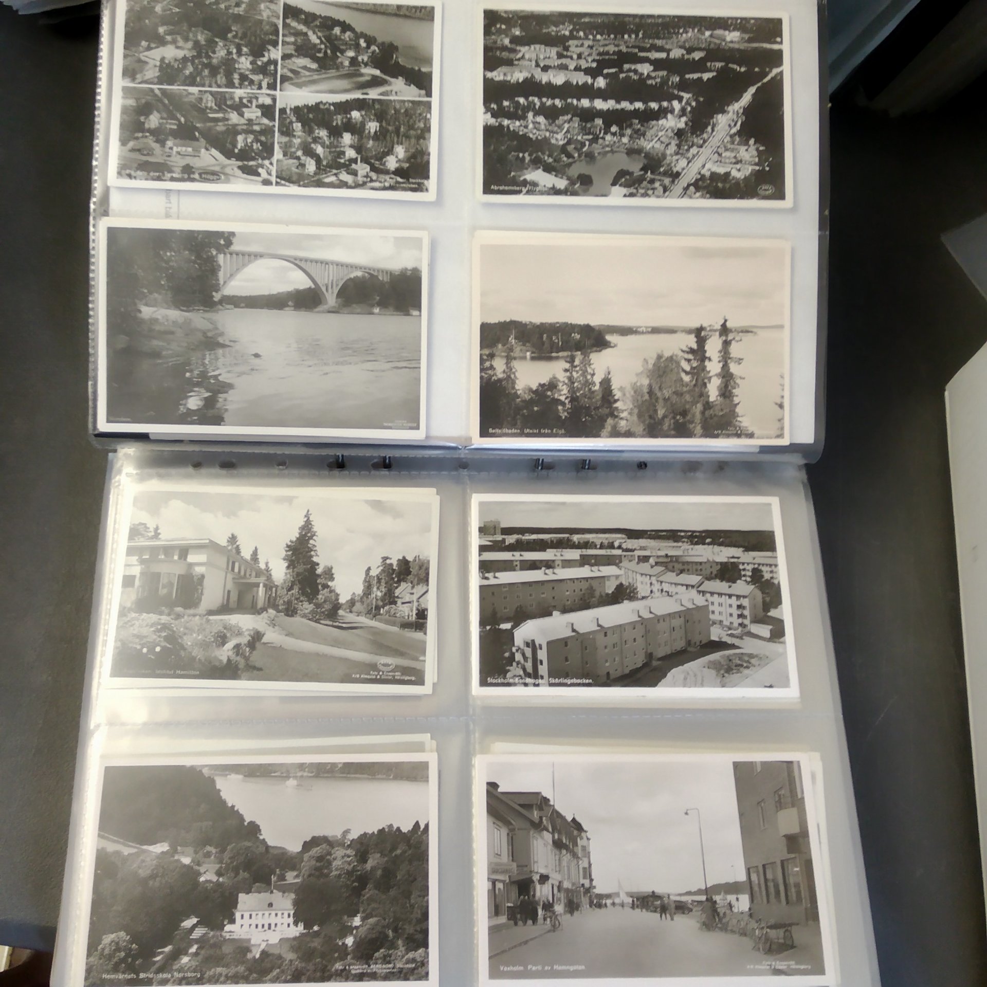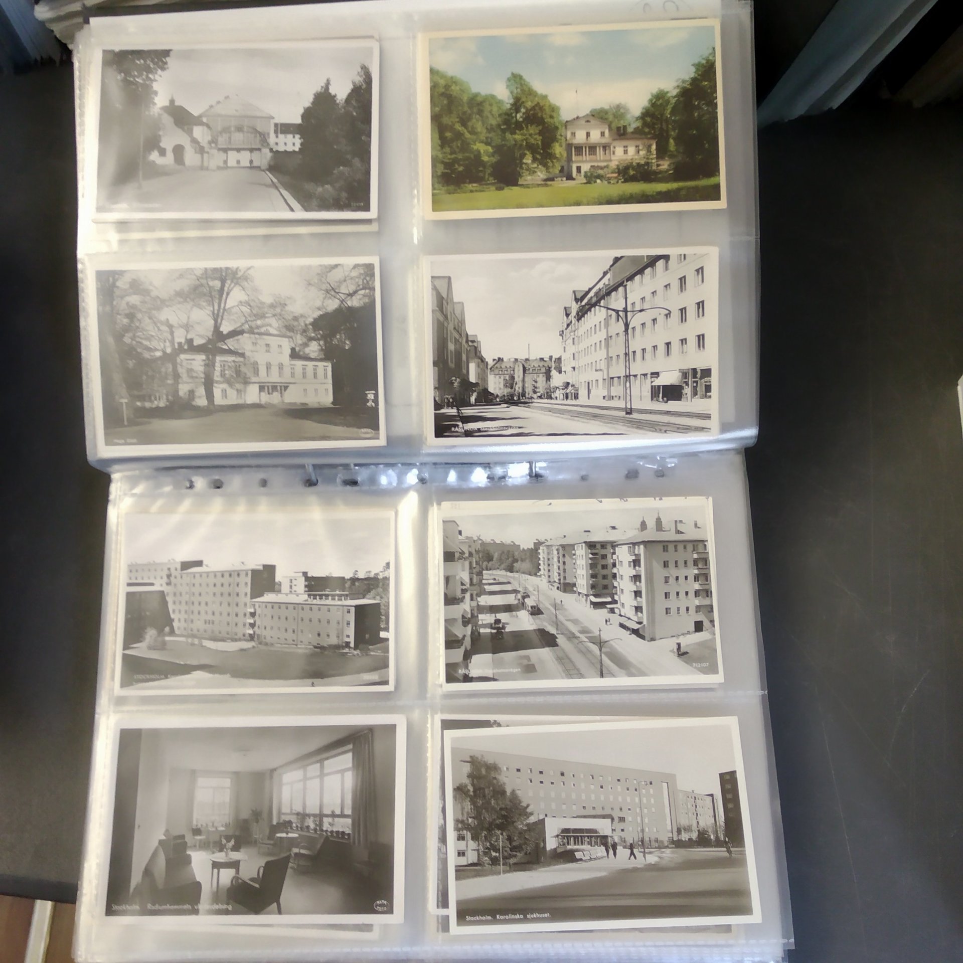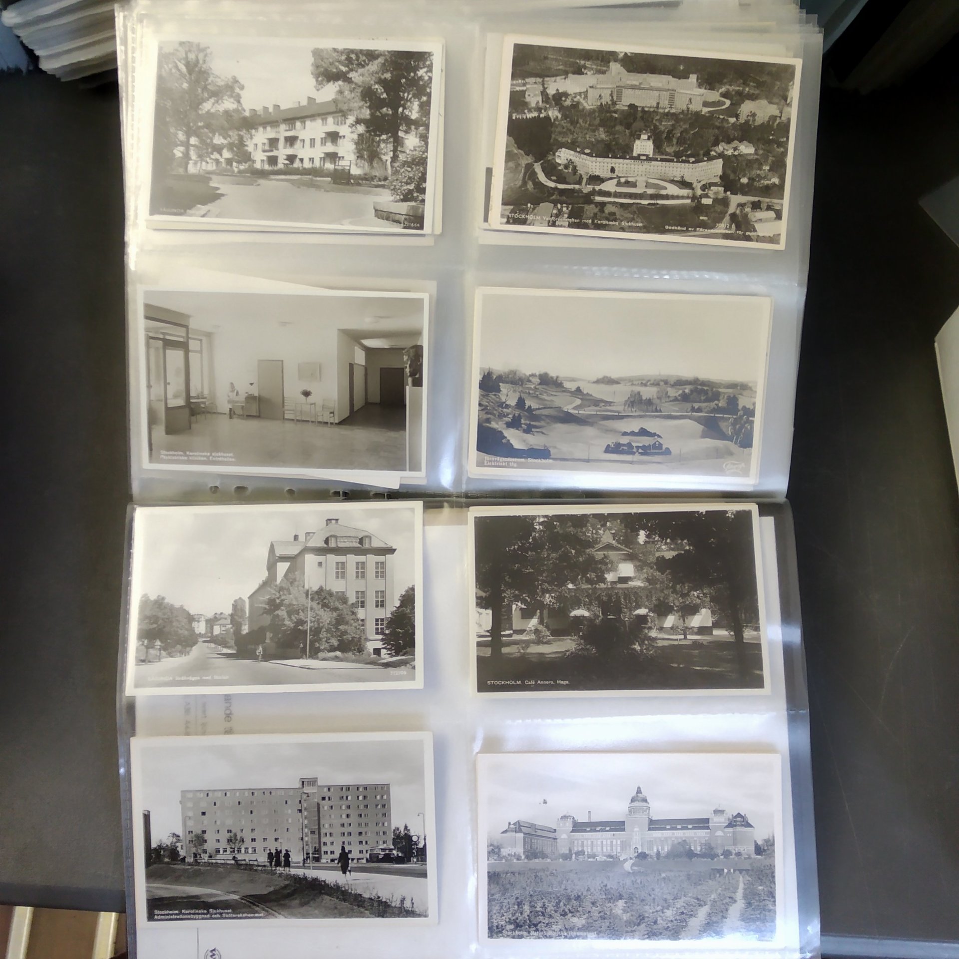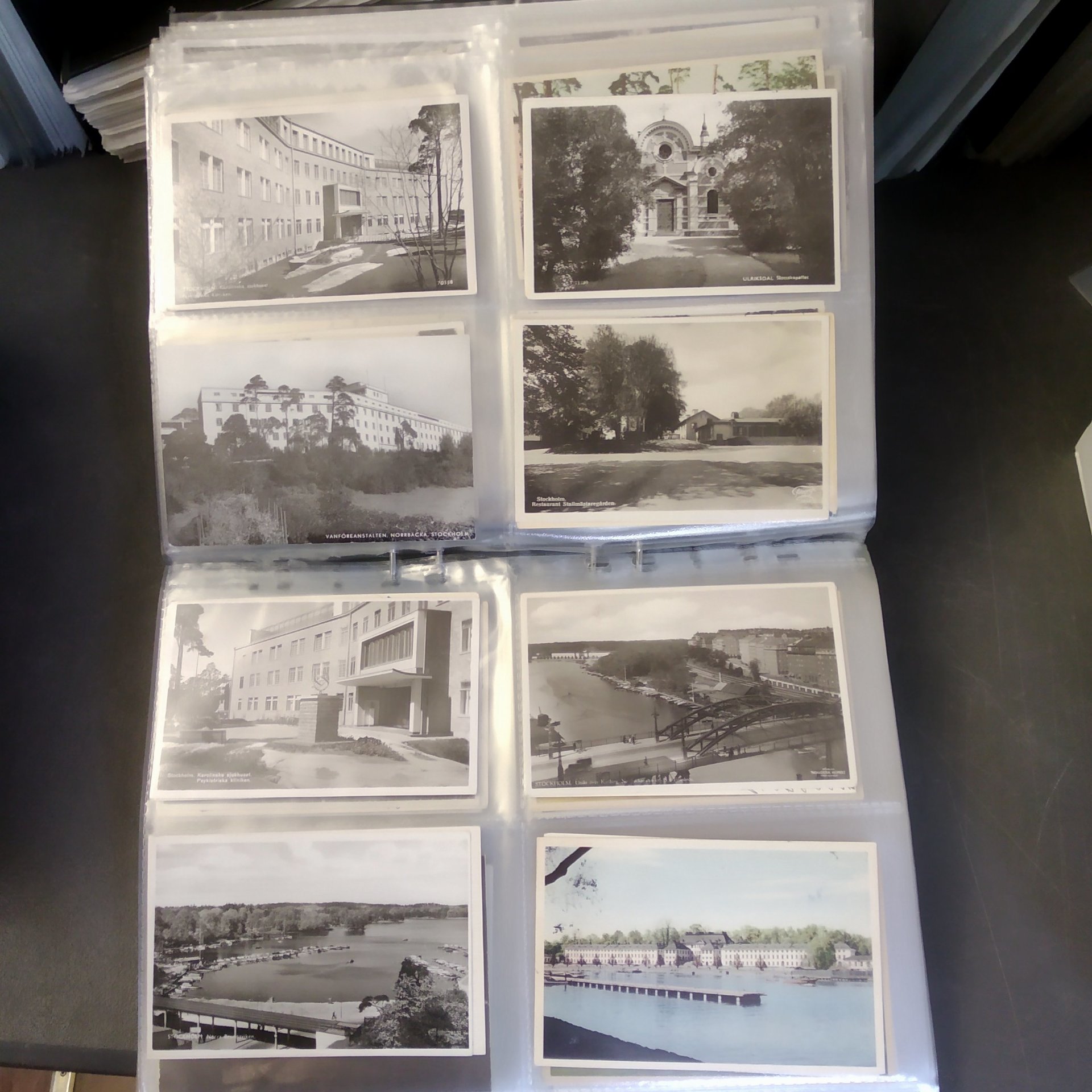 Sweden. Picture postcards, collection/accumulation 1900–1950s. Stockholm Surroundings, all in small size, in three binders with plastic pockets. Mostly good quality. Approx. 7 kg. (900–1000)