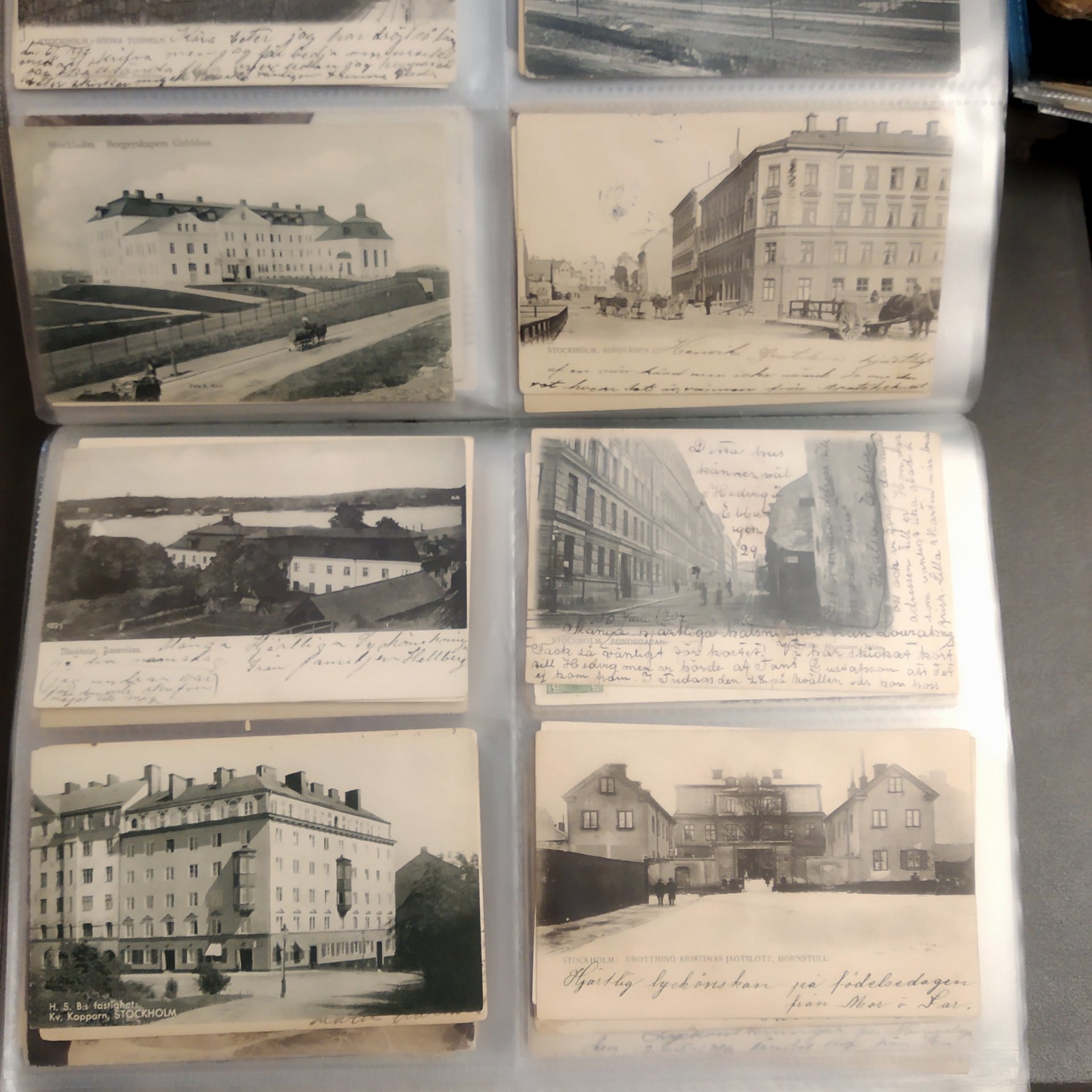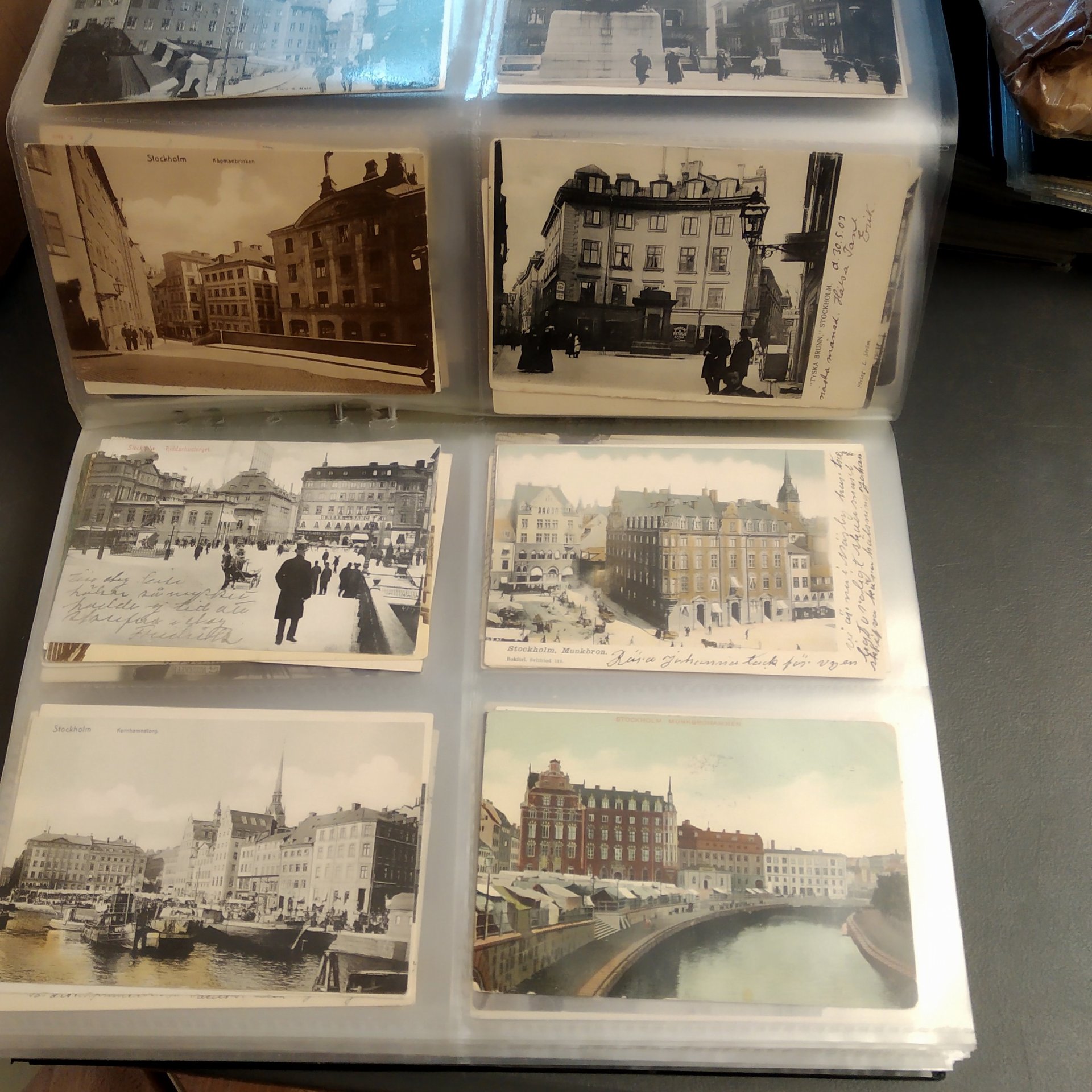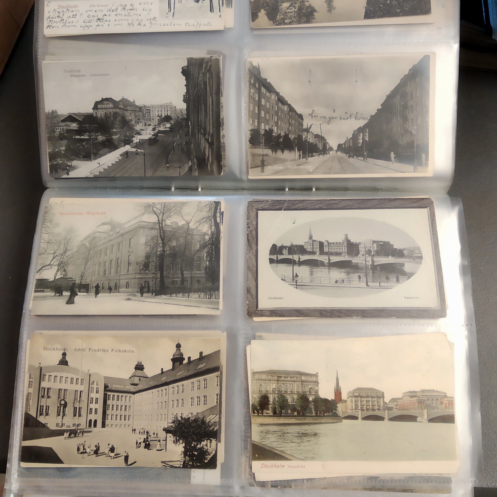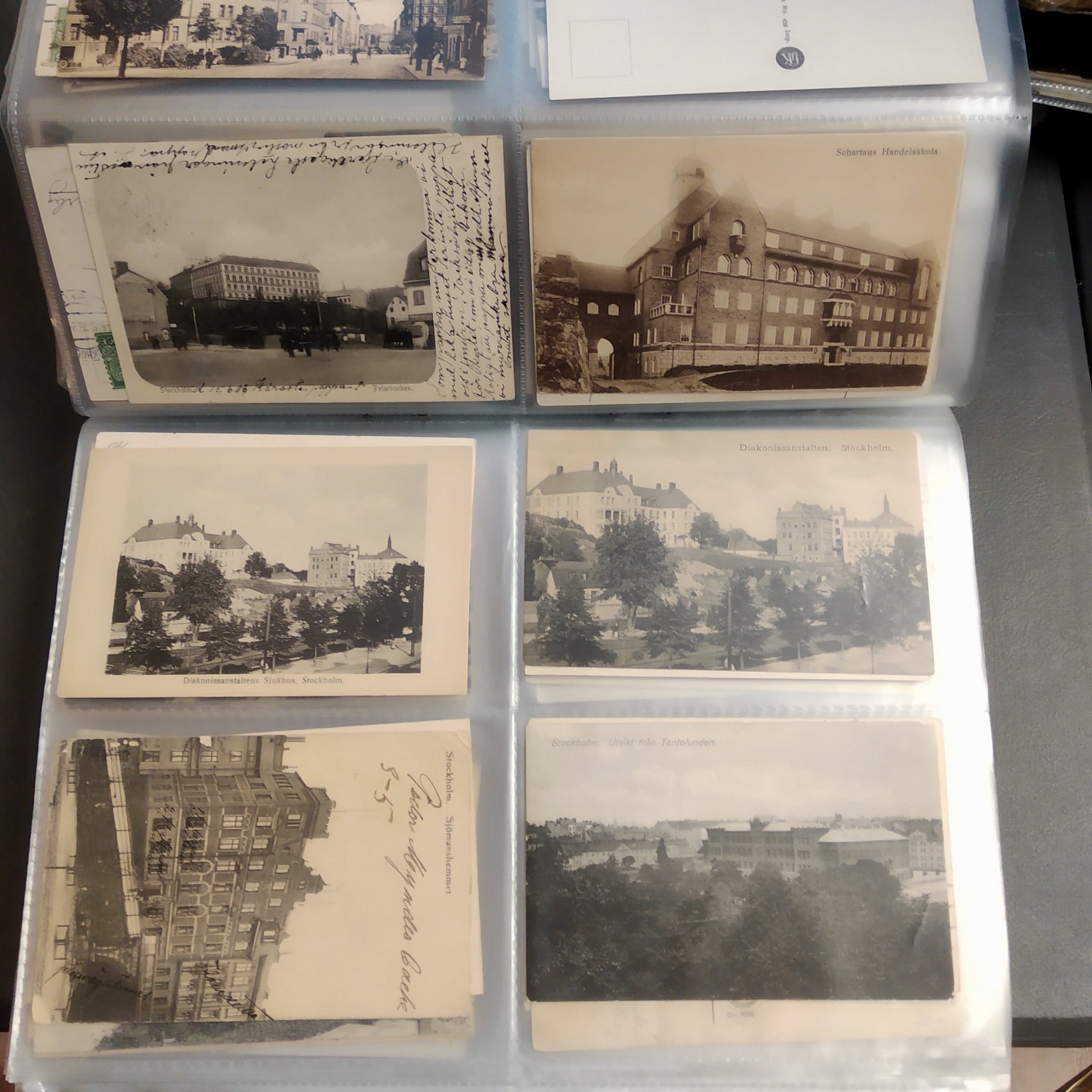 Sweden. Picture postcards, in removal box. Stockholm, incl. Vasastan, Kungsholmen, Södermalm and Gamla stan, 1900–1920s in six binders with plastic pockets. Mostly good quality. Approx. 12 kg. (1500+)