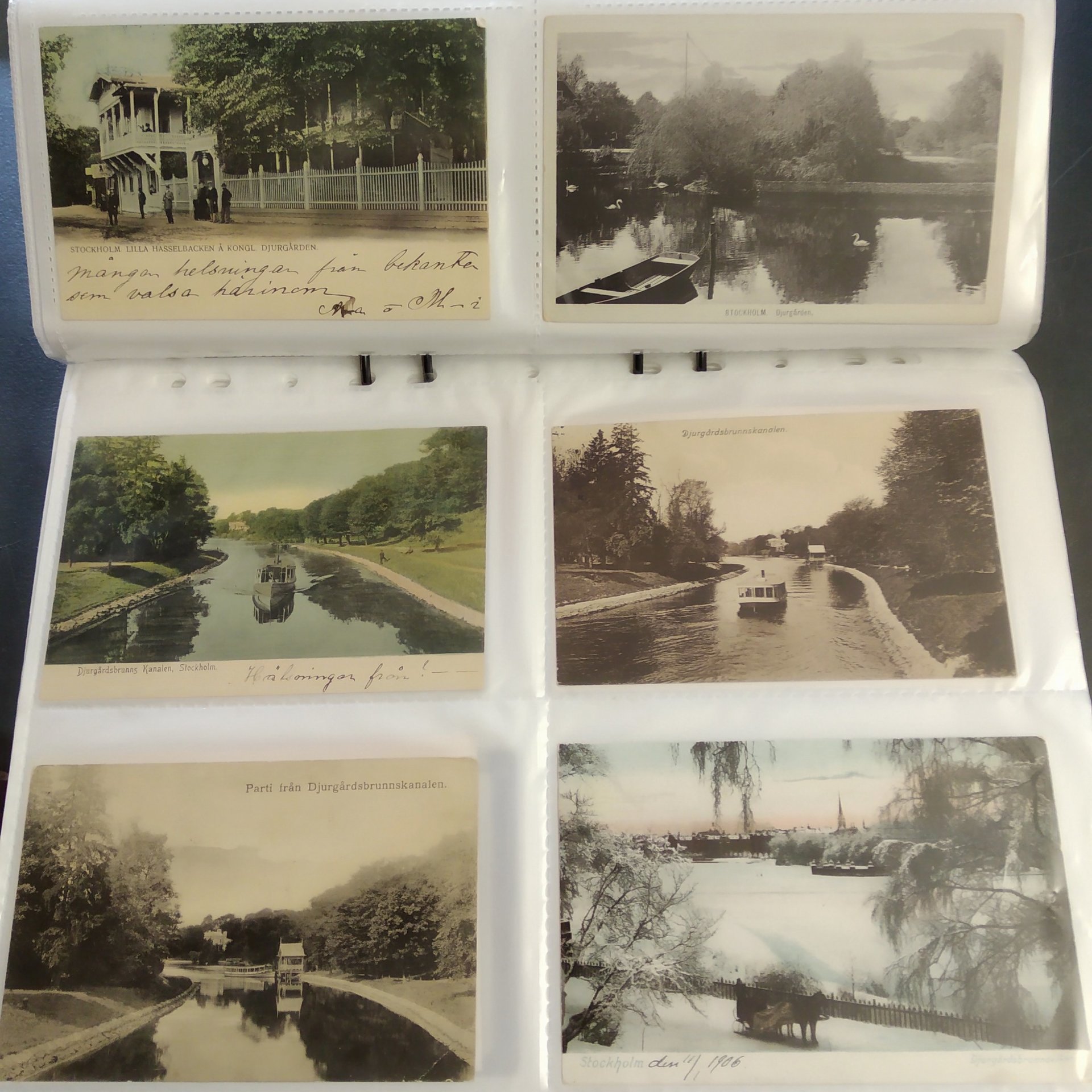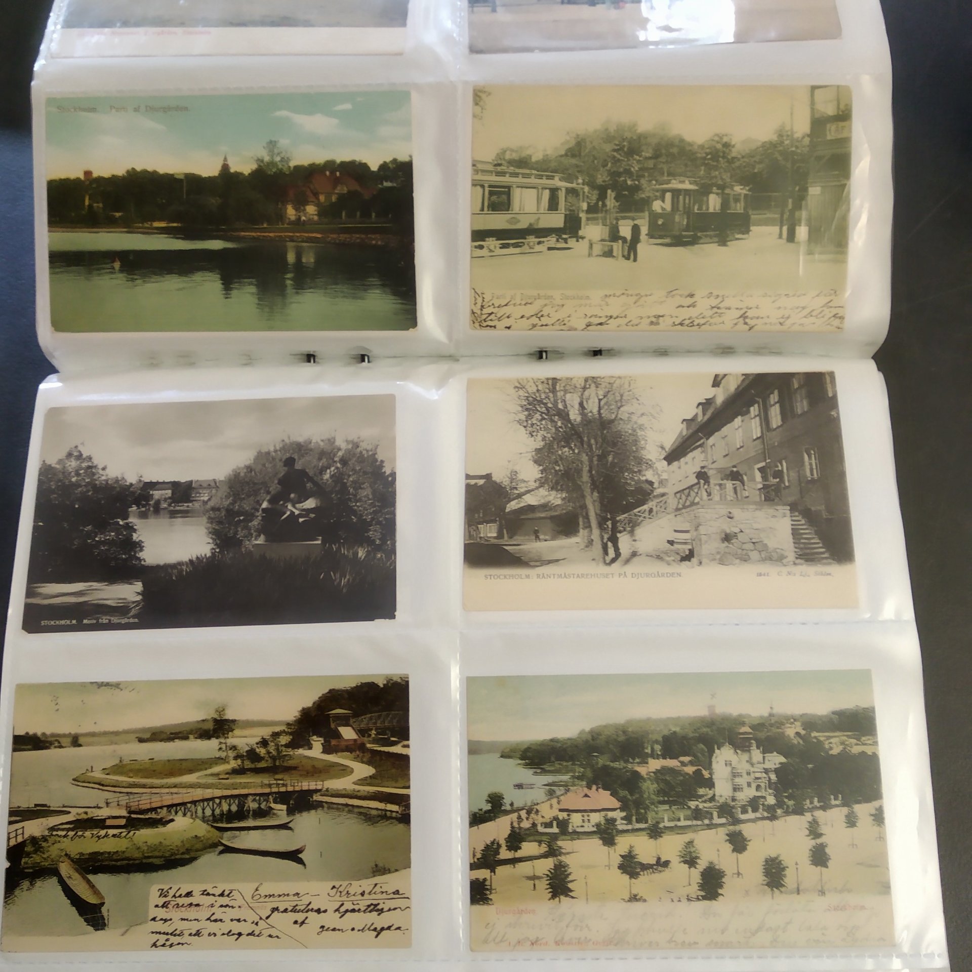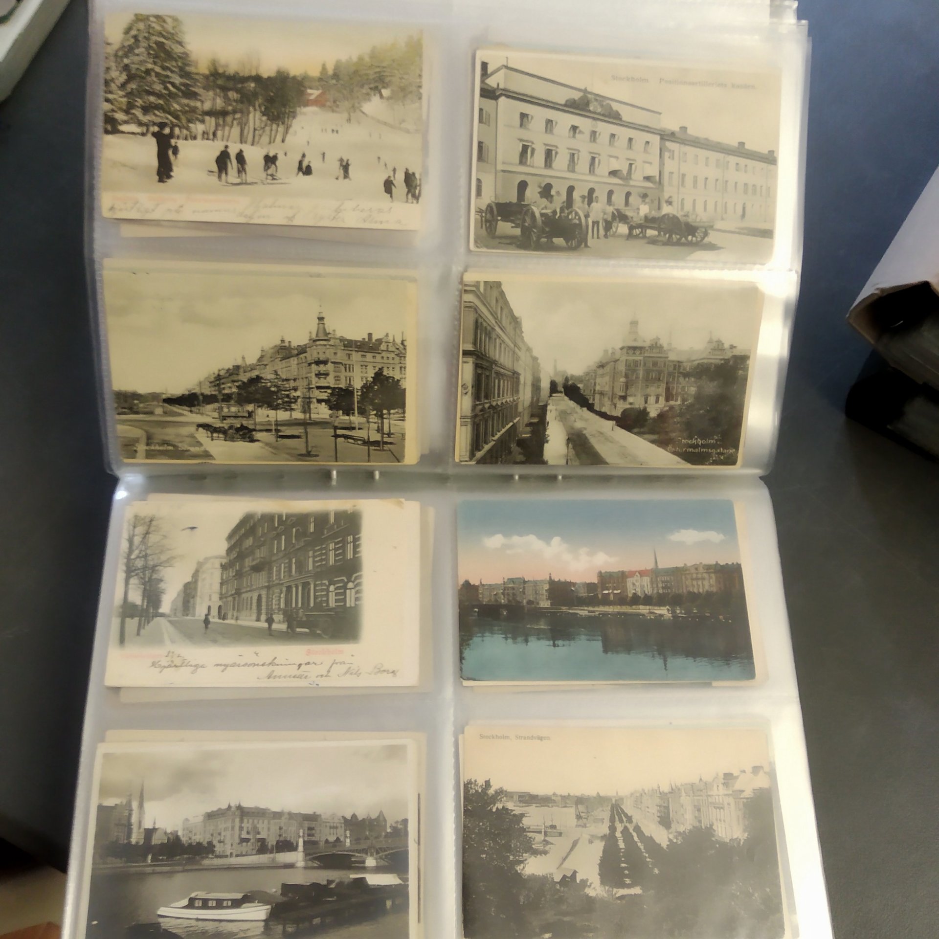 Sweden. Picture postcards, in removal box. Stockholm, incl. Östermalm, Djurgården and Skansen, mostly 1900–1920s, in seven binders with plastic pockets. Mostly good quality. Approx. 18 kg. (2000+)