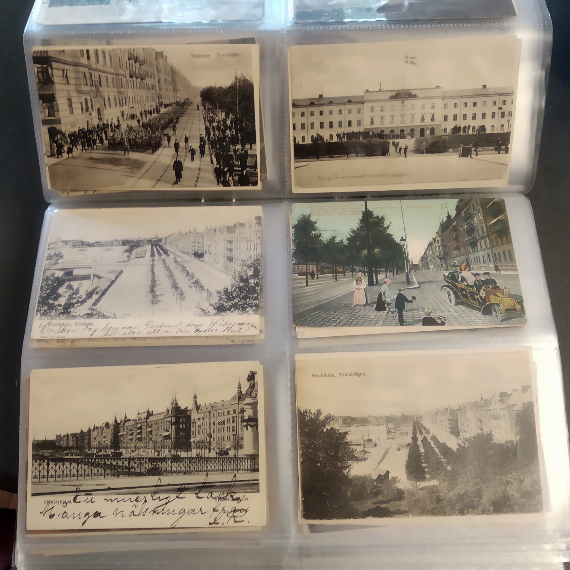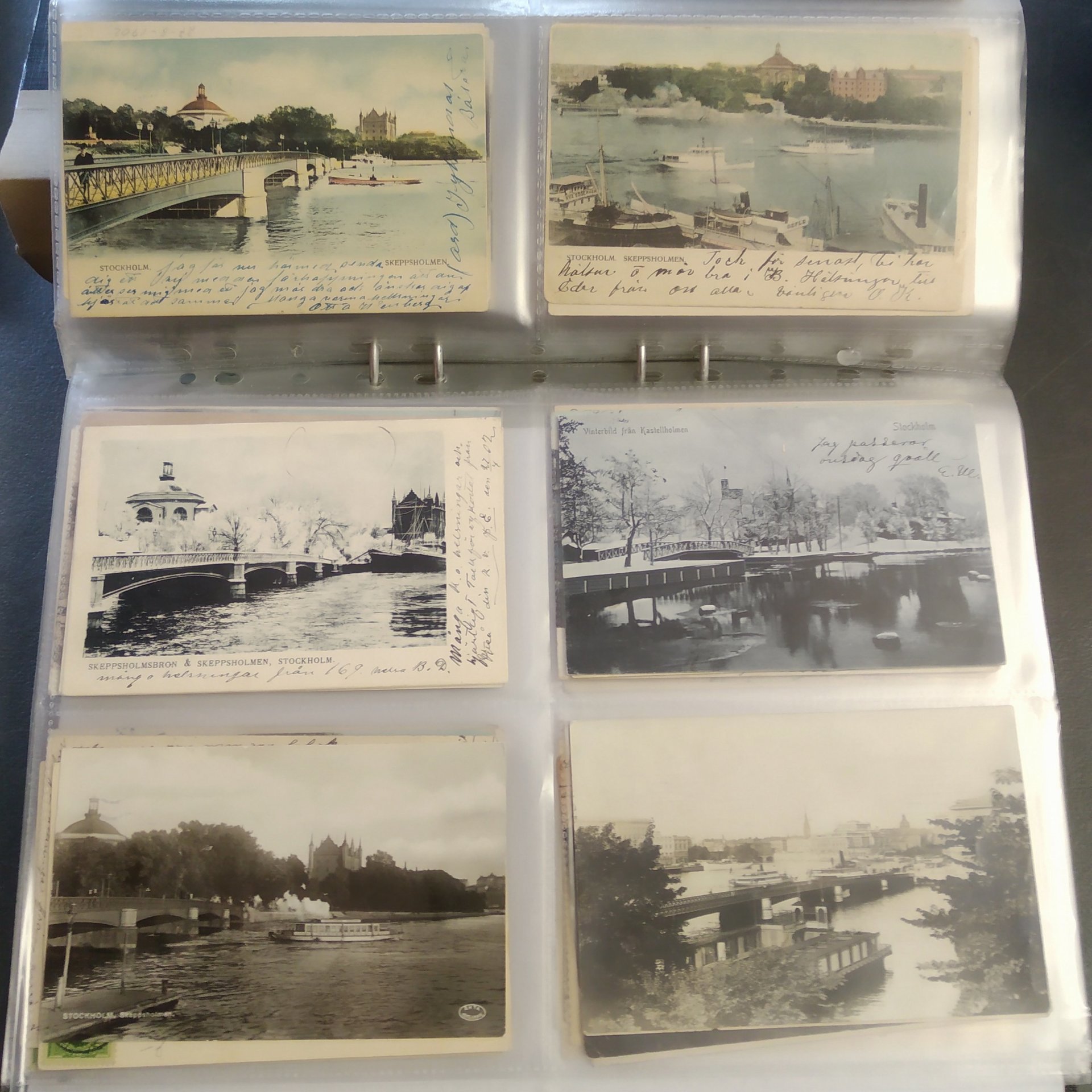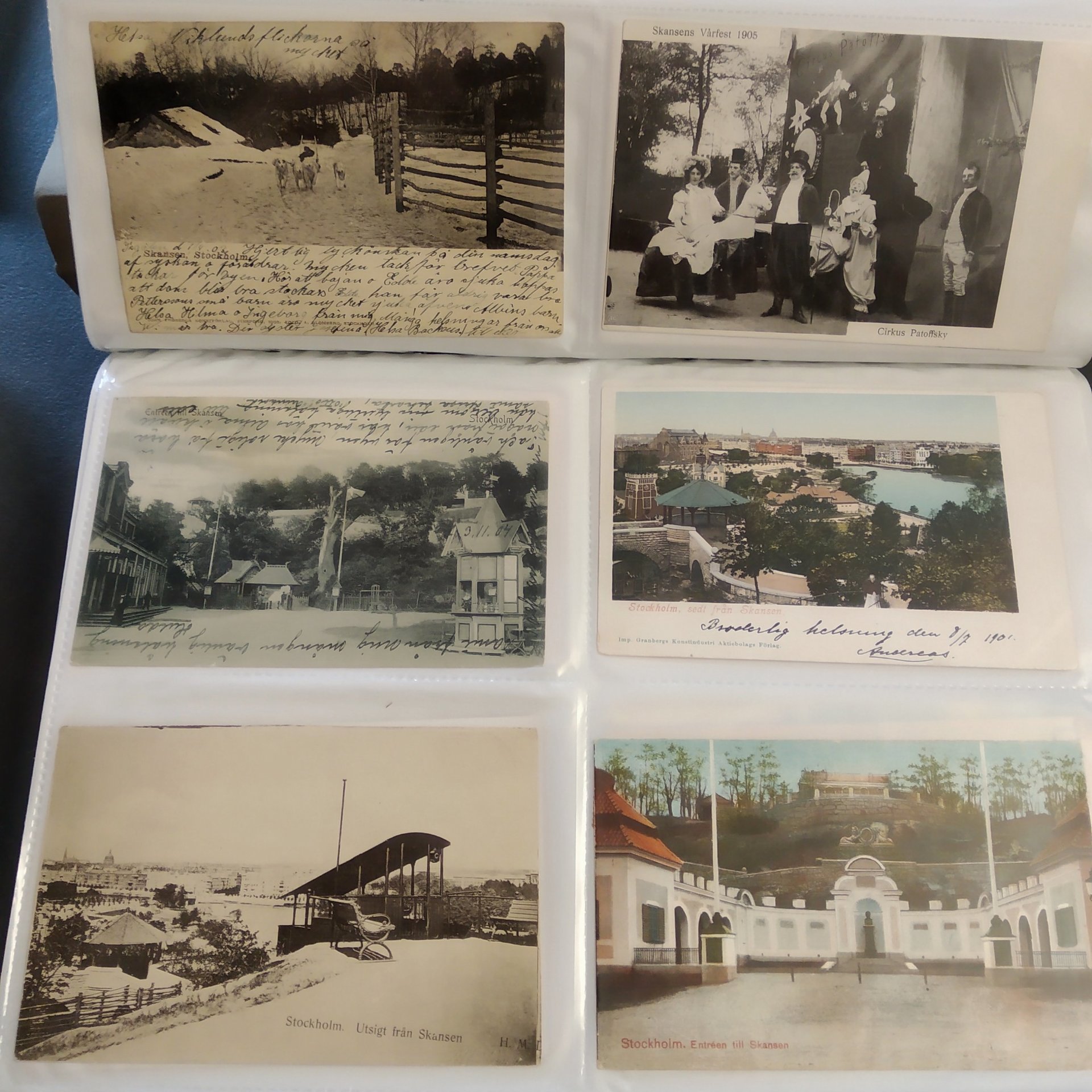 Sweden. Picture postcards, in removal box. Stockholm, incl. Östermalm, Djurgården and Skansen, mostly 1900–1920s, in seven binders with plastic pockets. Mostly good quality. Approx. 18 kg. (2000+)