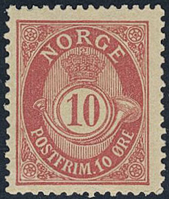Norway. Facit 57 ★★, 1894 Posthorn in Roman 10 øre rose, perf 14½ × 13½. Fair centering. SEK 14000