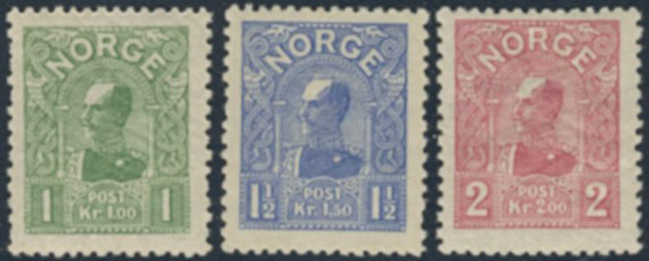 Norway. Facit 90–92 ★★, 1907 Haakon VII profile I SET (3). 1.50kr signed Moldenhaer. Slightly dried gum on all 3,. SEK 8600