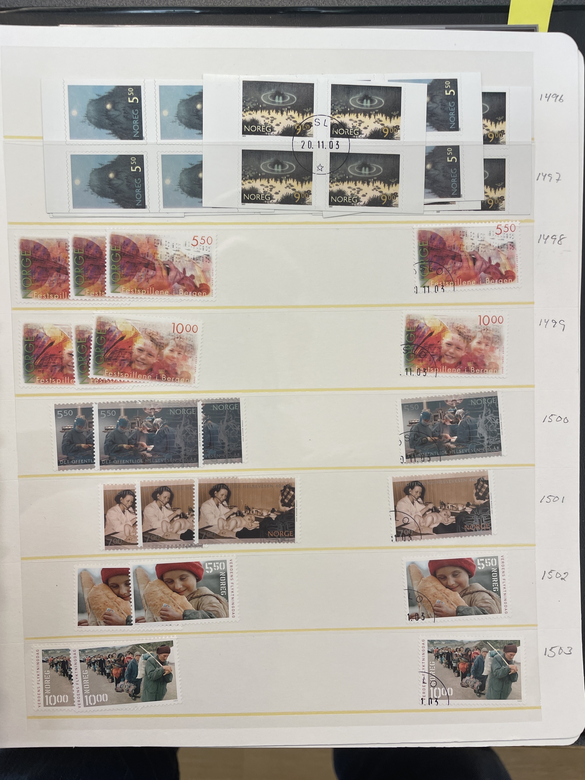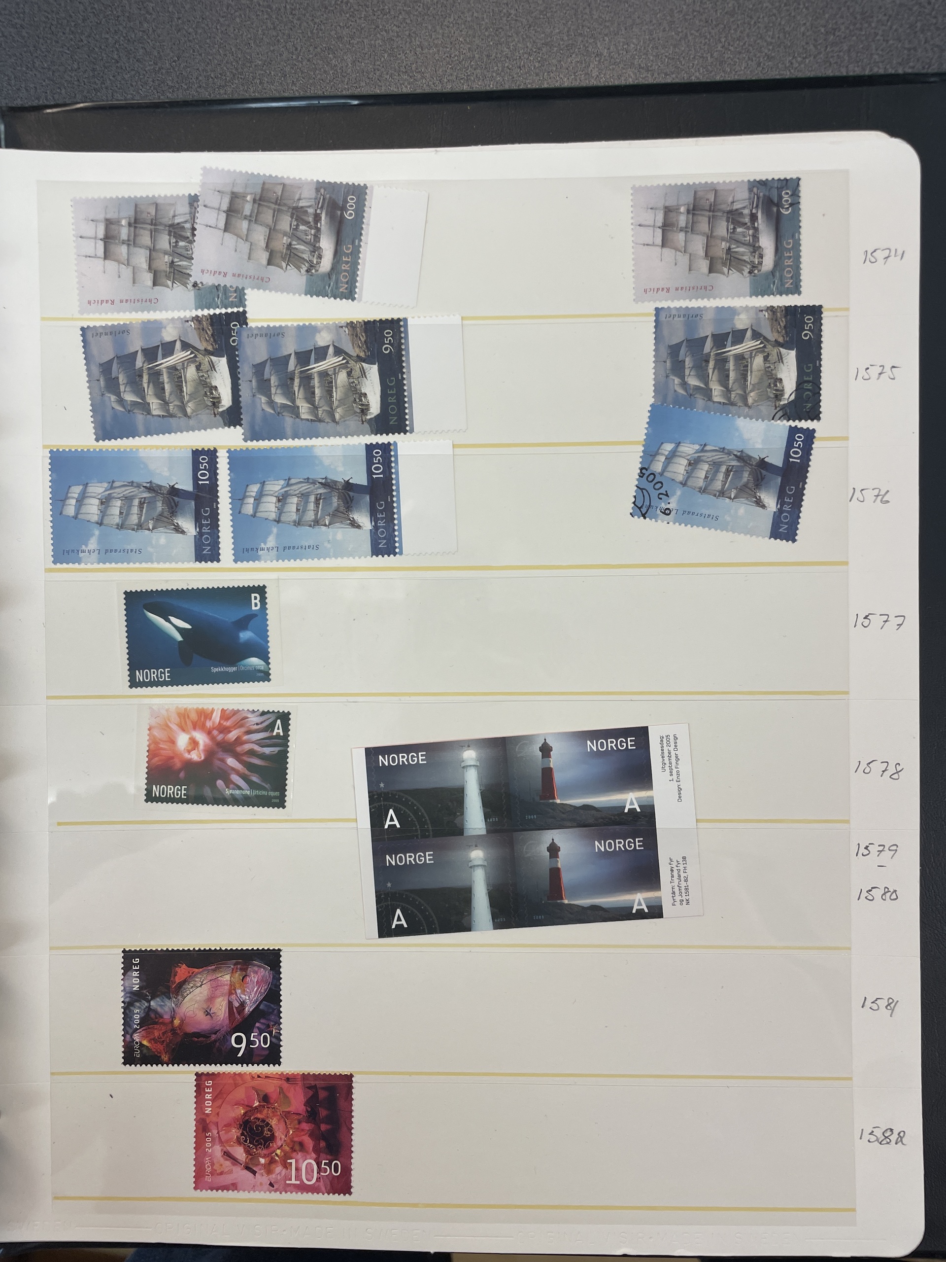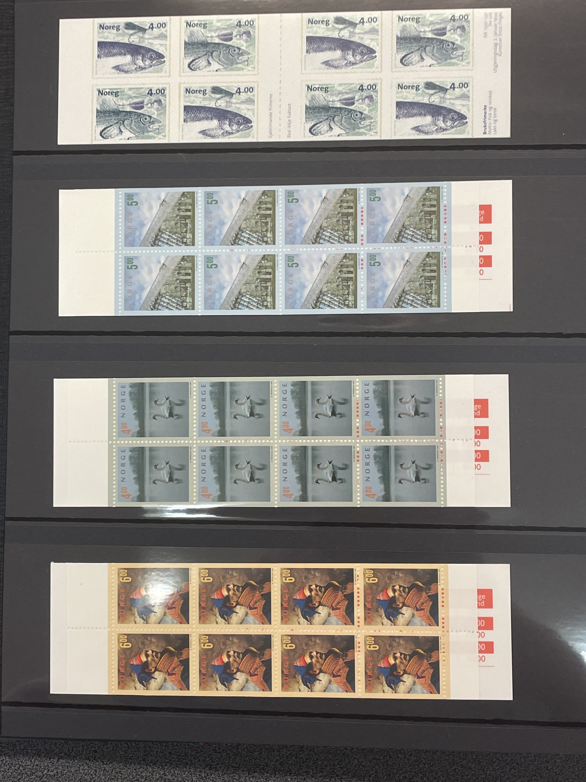 Norway. Accumulation ★★/⊙ 1980s–ca. 2005 in box. Face value 13000 NOK in two visiralbums and one booklet stockbook including many used stamps and sets. Please see a selection of scans at www.philea.se. Good quality. Approx. 8 kg. (1000s)