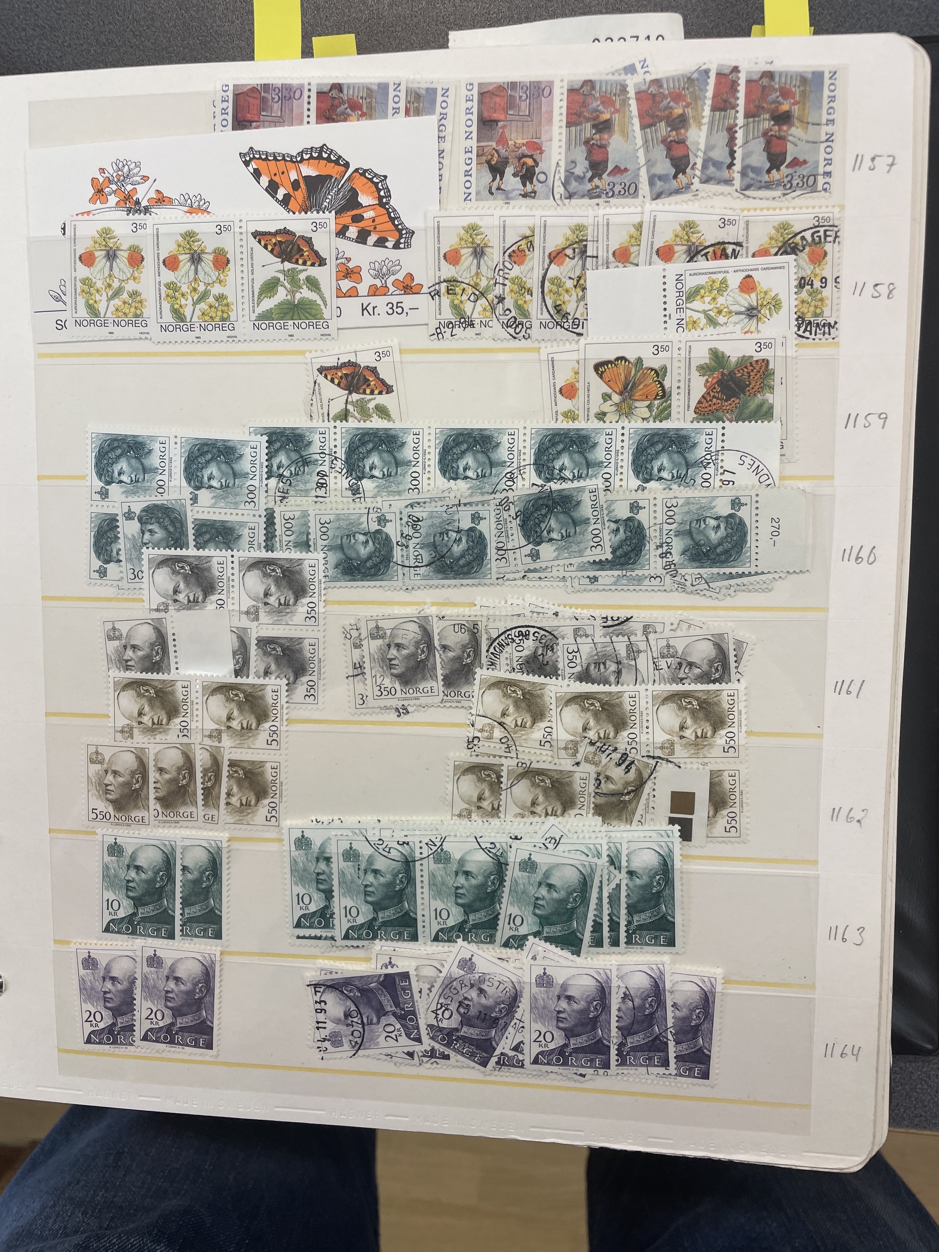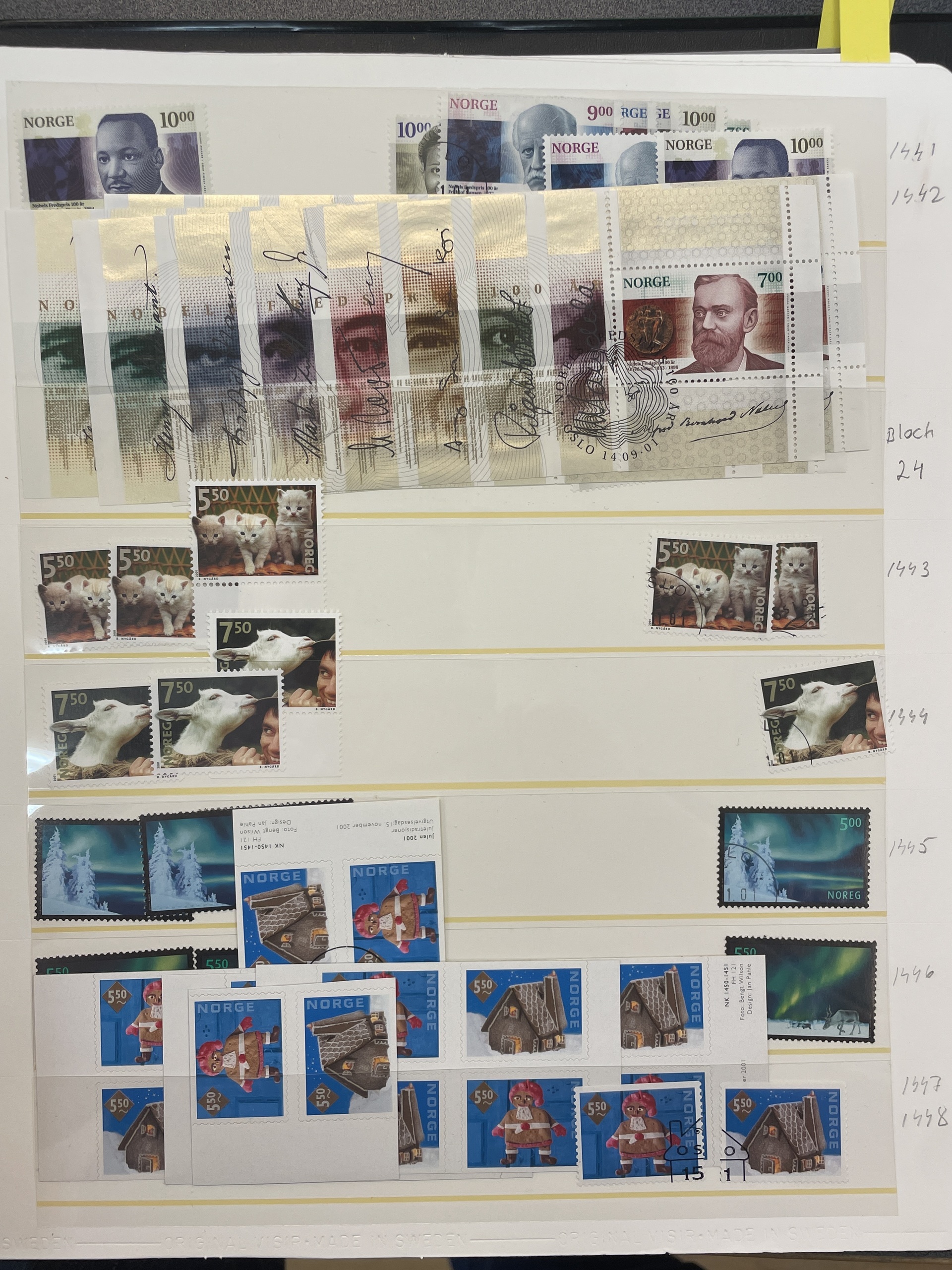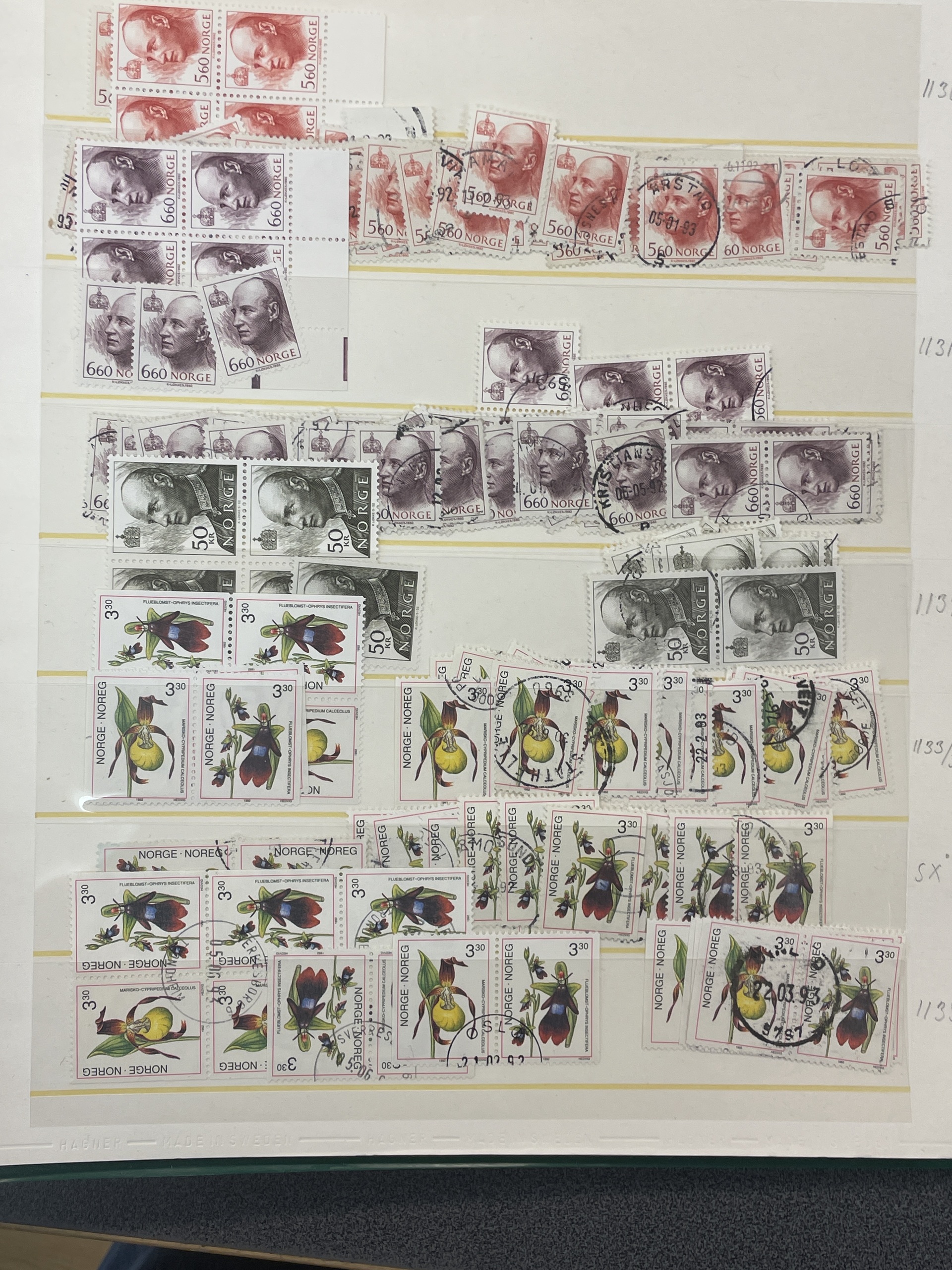 Norway. Accumulation ★★/⊙ 1980s–ca. 2005 in box. Face value 13000 NOK in two visiralbums and one booklet stockbook including many used stamps and sets. Please see a selection of scans at www.philea.se. Good quality. Approx. 8 kg. (1000s)