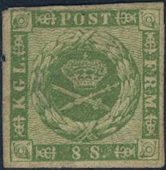 Denmark. Facit 8 ★, 1858 Imperforate. Wavy-line spandrels 8S green. A bit unfresh. SEK 7000