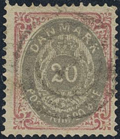 Denmark. Facit 34a v used, Bicoloured type, perf 14 x 13 1/2, 20 öre, with thick regular frame. SEK 4000