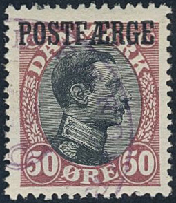Denmark. Ferry Facit PF5 used, 1920 POSTFÆRGE overprint on King Christian X 50 øre black/wine-red. SEK 2500
