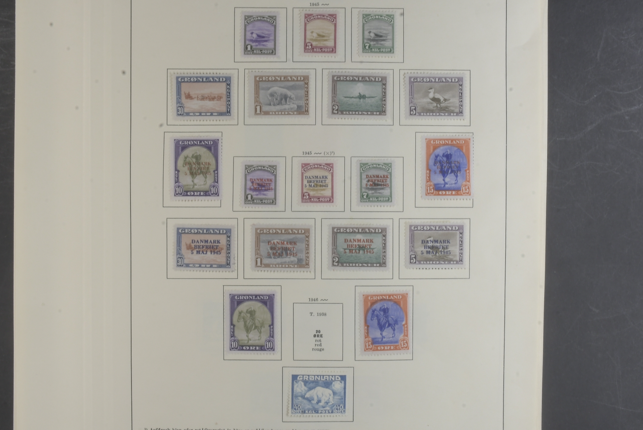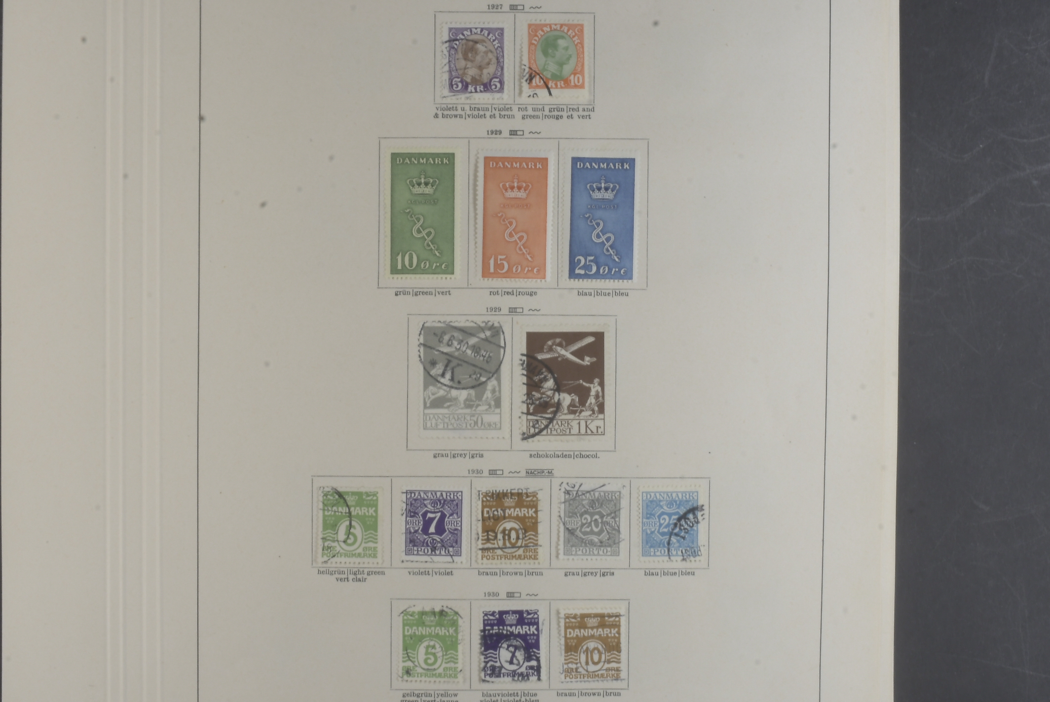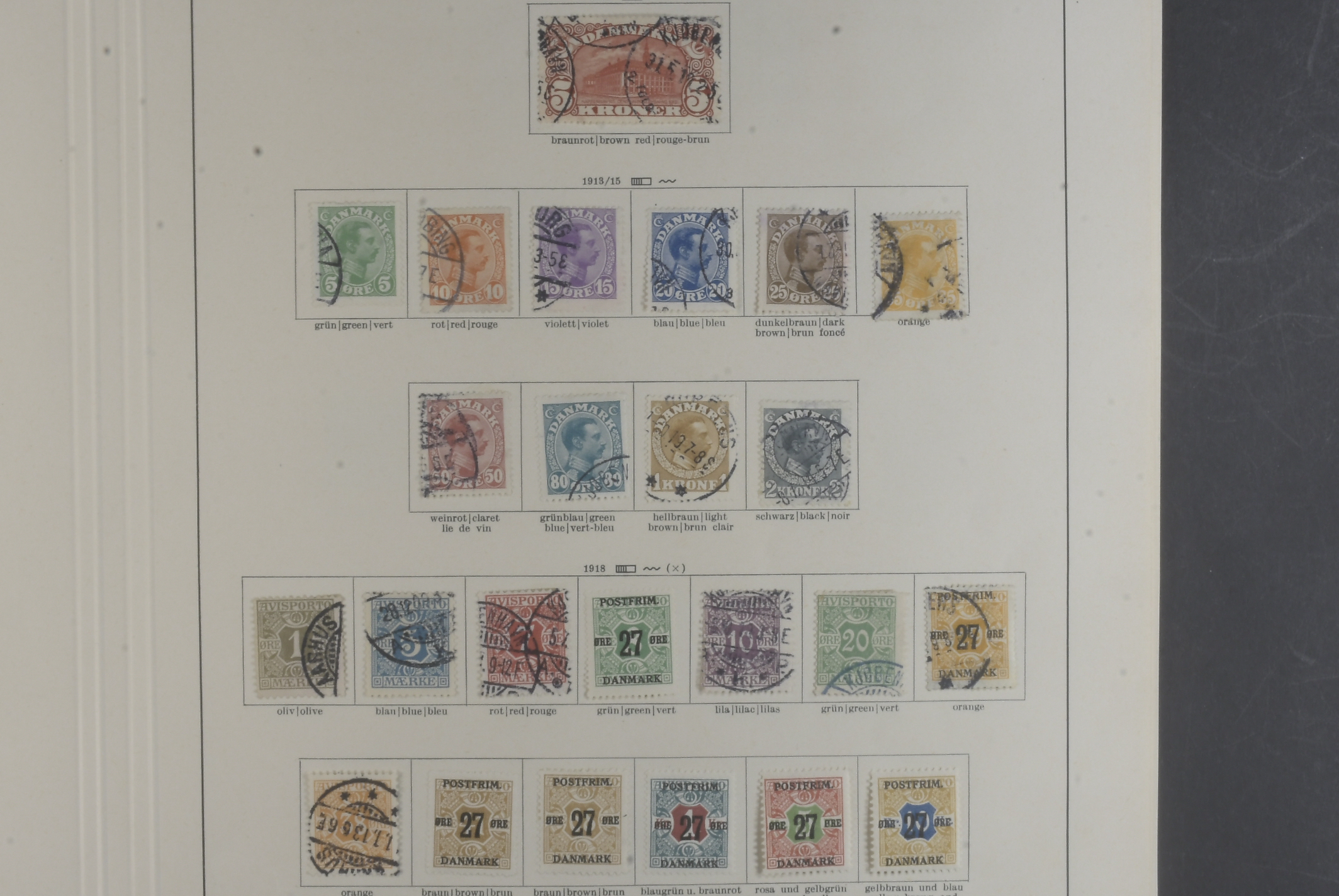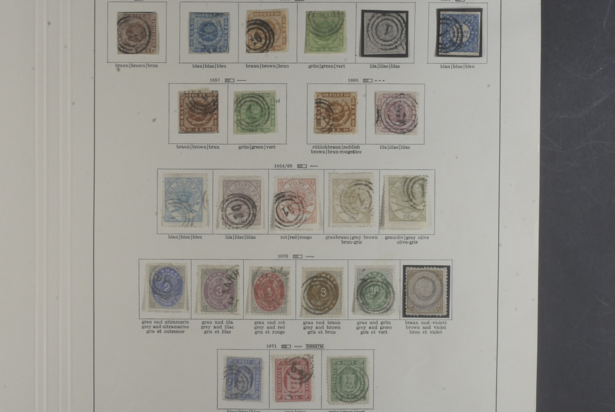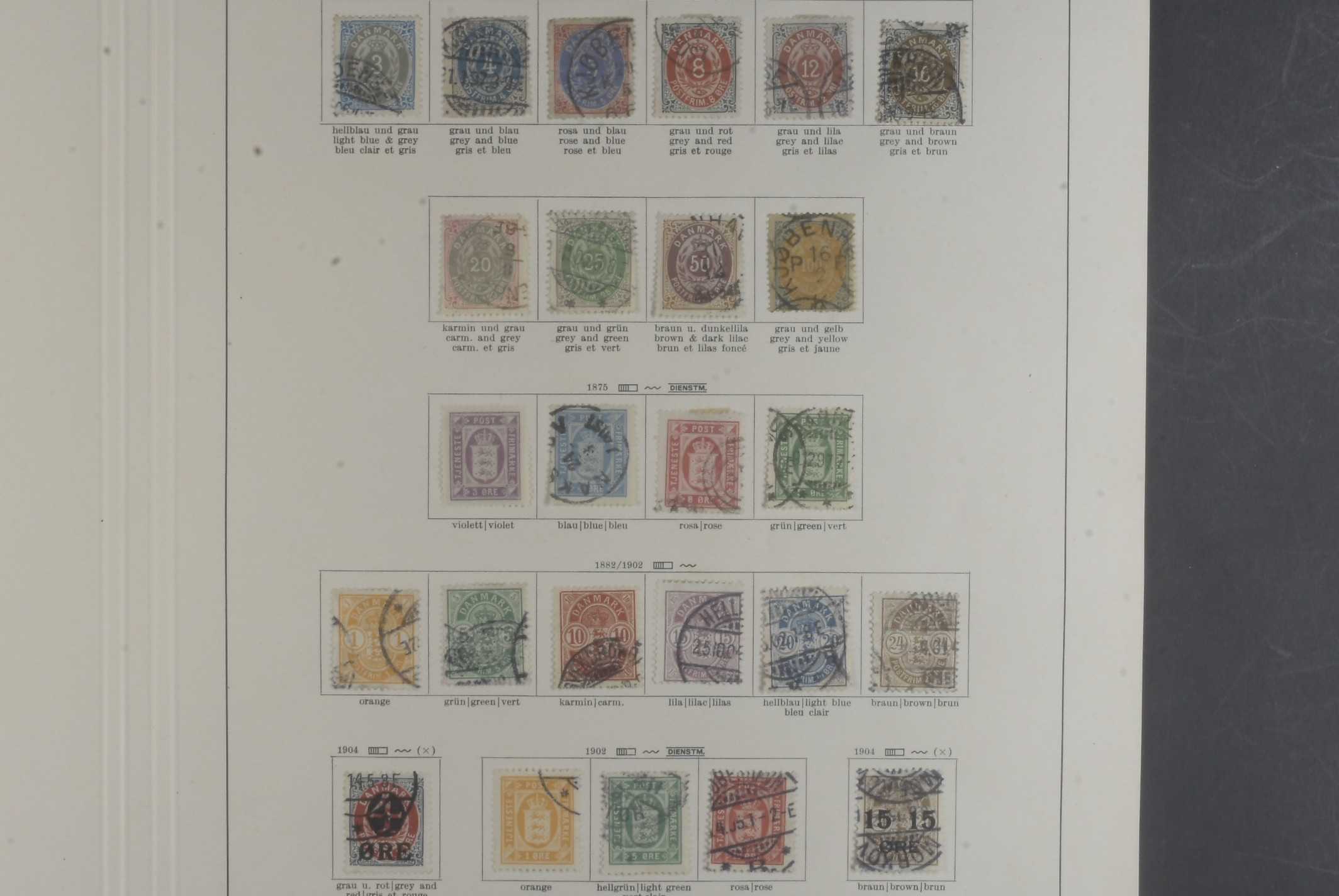 Denmark. Collection ★/⊙ 1851-1955 on Schaubek leaves. Including Faroe Islands and Greenland. Complete in main numbers with e.g. all skilling values with very fine 2 sk 1851, 2 øre on 5 øre Faroe Islands cancelled KLARSVIG 17.1.1919 on piece, Greenland DANMARK BEFRIET * and much more. Please see a selection of scans at www.philea.se. Somewhat mixed quality.