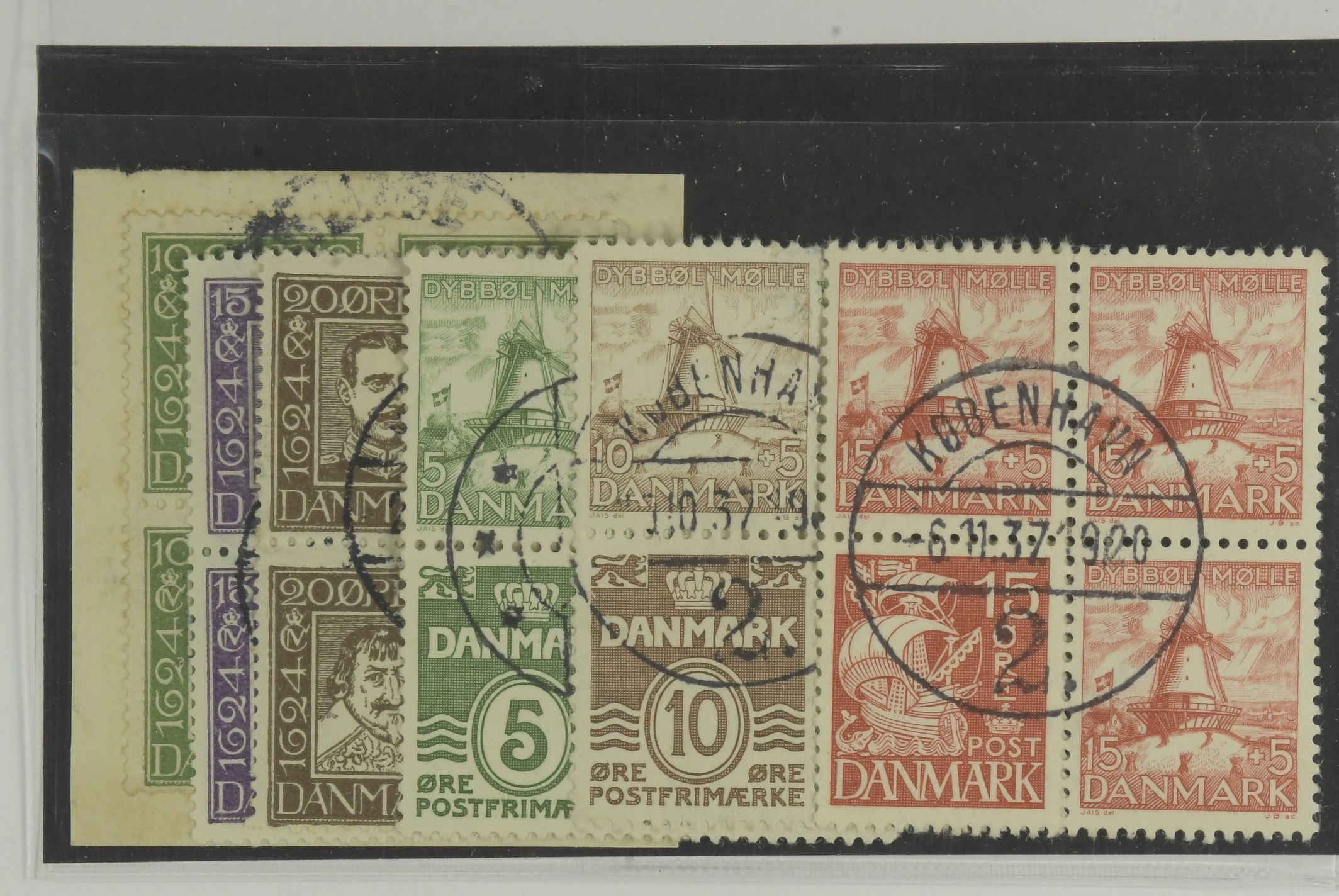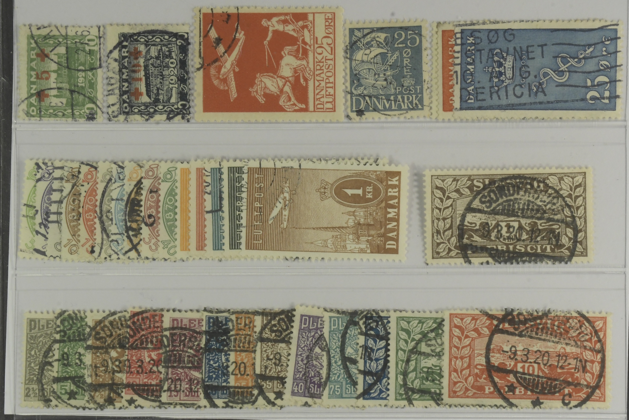 Denmark. Used 1921–34. All different, e.g. Mi 199-200, 201-12(3 sheets), 215, 231, 243-45, 246-53, 262-66, 278-80(3 sheets), Slesvig 1-14. Mostly good quality. F SEK 6.500 (42)