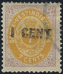 Danish West Indies. Facit 23 used, "1 Cent" Surcharge on 7 Cents deep yellow/lilac. SEK 3000