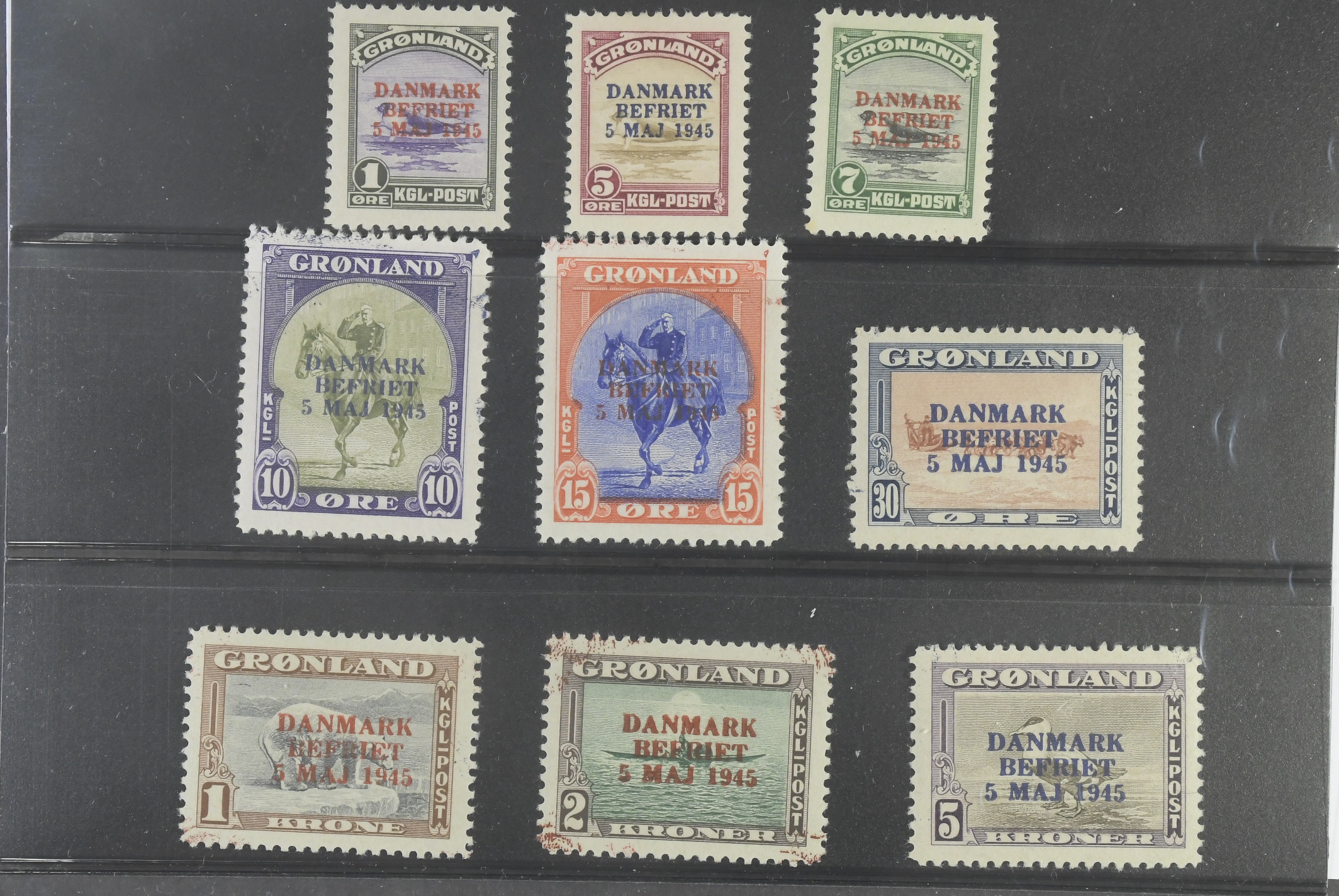 Greenland. Facit 19–27 ★, 1945 Overprint "Danmark Befriet 5 Maj 1945" SET most usual overprint (9). Mostly light hinged. Signed H.W. SEK 6500