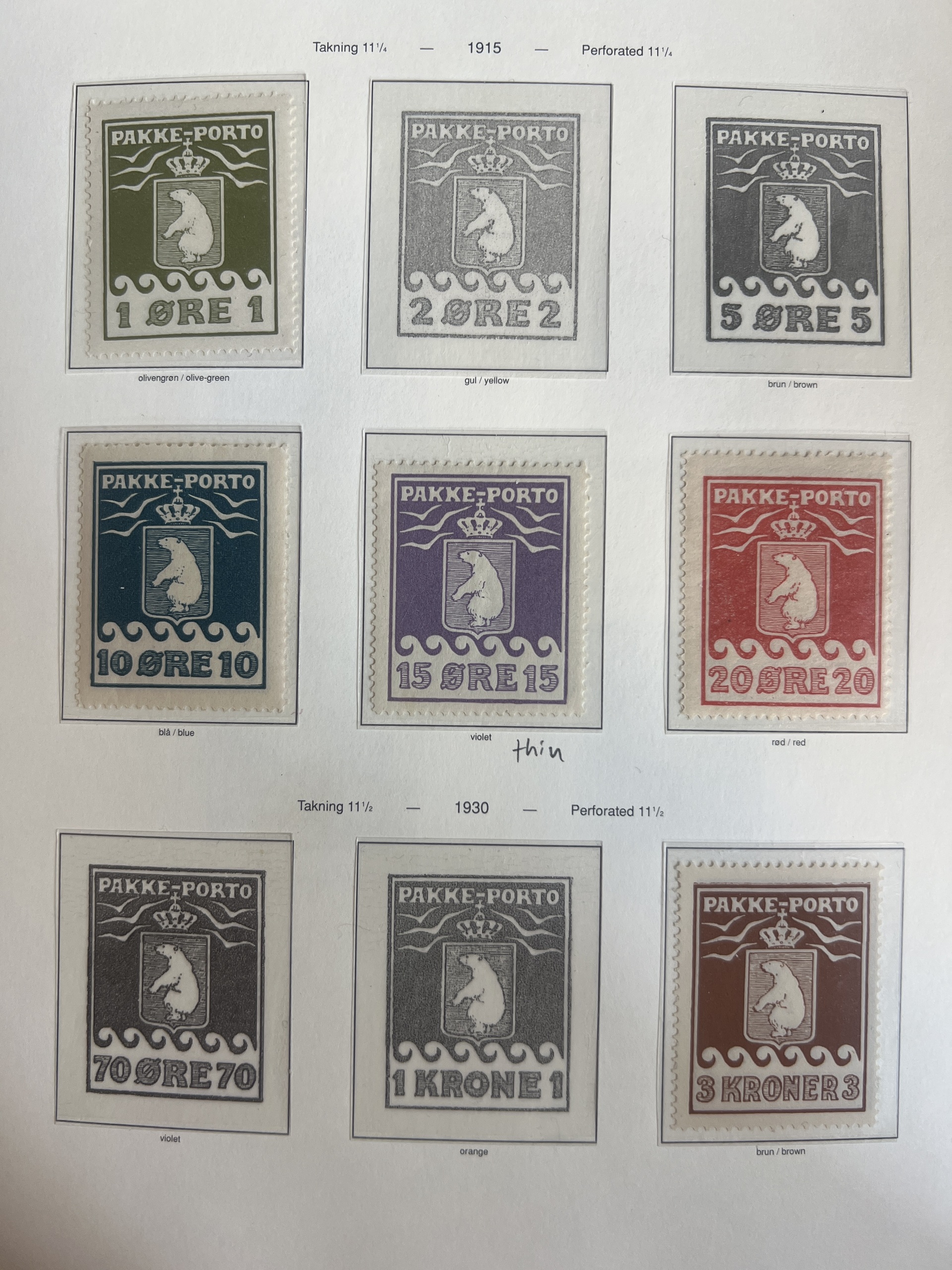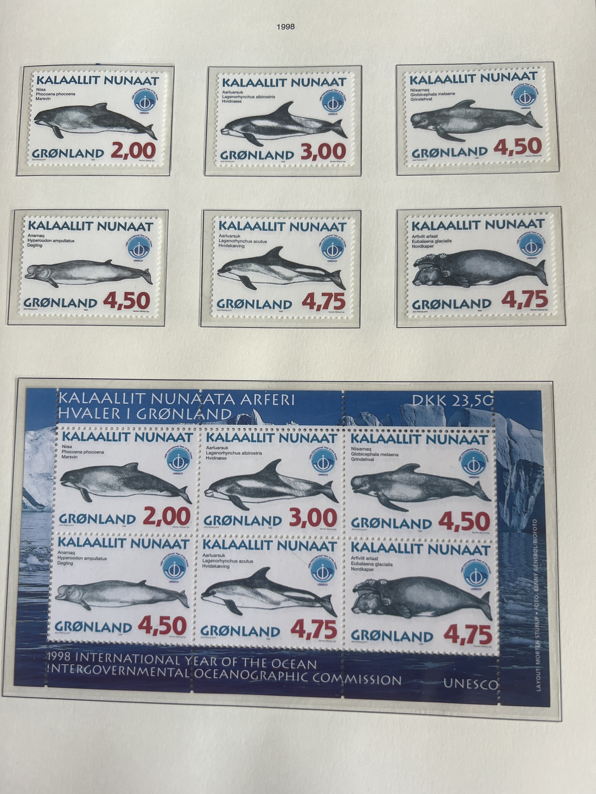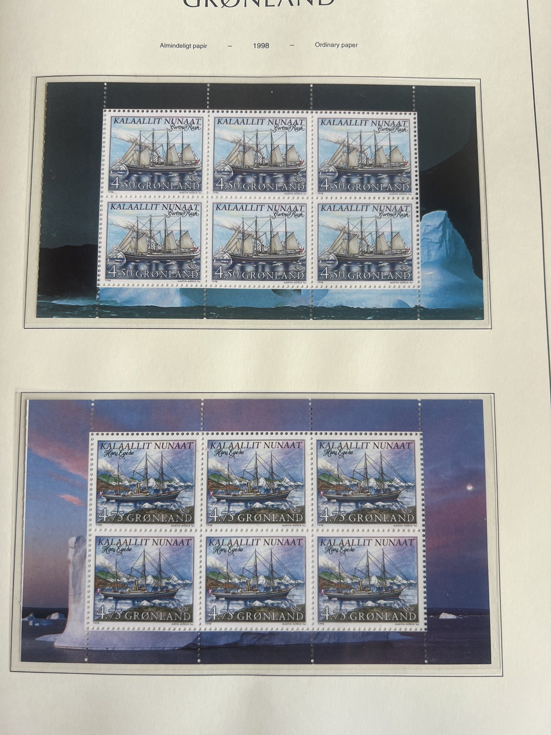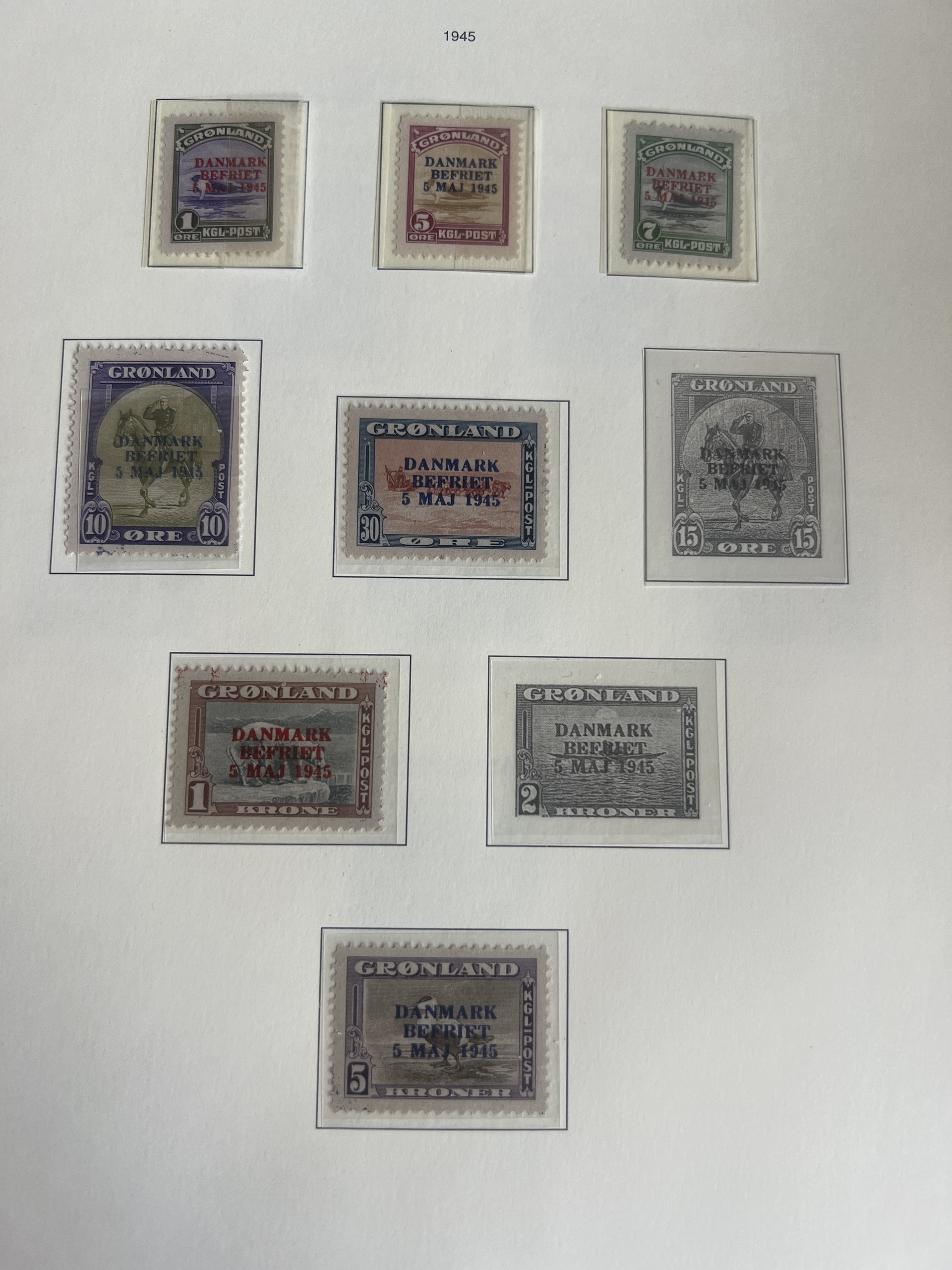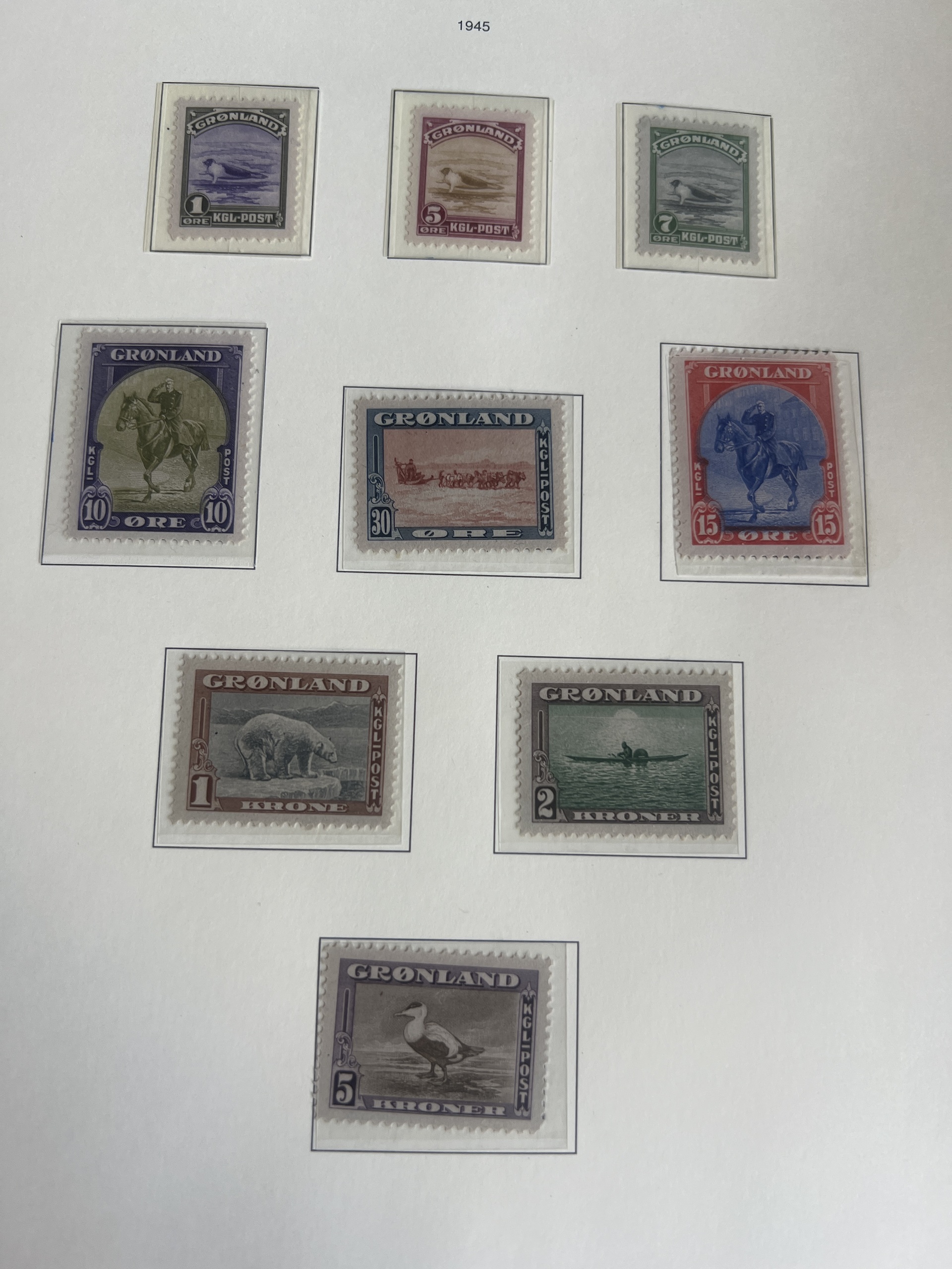 Greenland. Collection ★★/★ 1915–1999 in Leuchtturm album with stamp mounts. With 11 Pakke–Porto, American issue mint and short set Danmark Befriet all mint hinged. Complete from 1950 and NH from 1970 incl. booklet sheetlets. Please see a selection of scans at www.philea.se. Mostly fine quality. (300+)