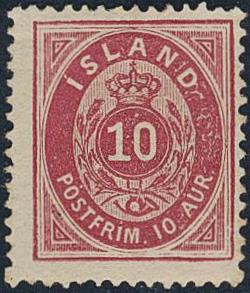 Iceland. Facit 12 ★, 1876 Aur values 10 aur carmine, perf 14 × 13½. Small black paper remains on back side. SEK 2000