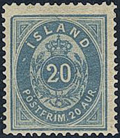 Iceland. Facit 15 ★★, 1882 Aur values 20 aur blue, perf 14 × 13½ partly dried gum. SEK 9000