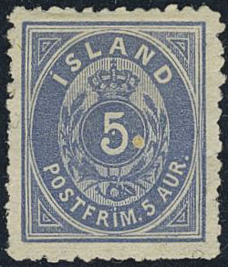 Iceland. Facit 23 (★), 1876 Aur values 5 aur blue-grey, rough perf 12¾. No gum, uneven perforation as always. Good centering. SEK 3500