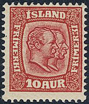 Iceland. Facit 81 ★★, 1907 Two Kings 10 aur red, watermark crown. Almost off-centered. SEK 4400