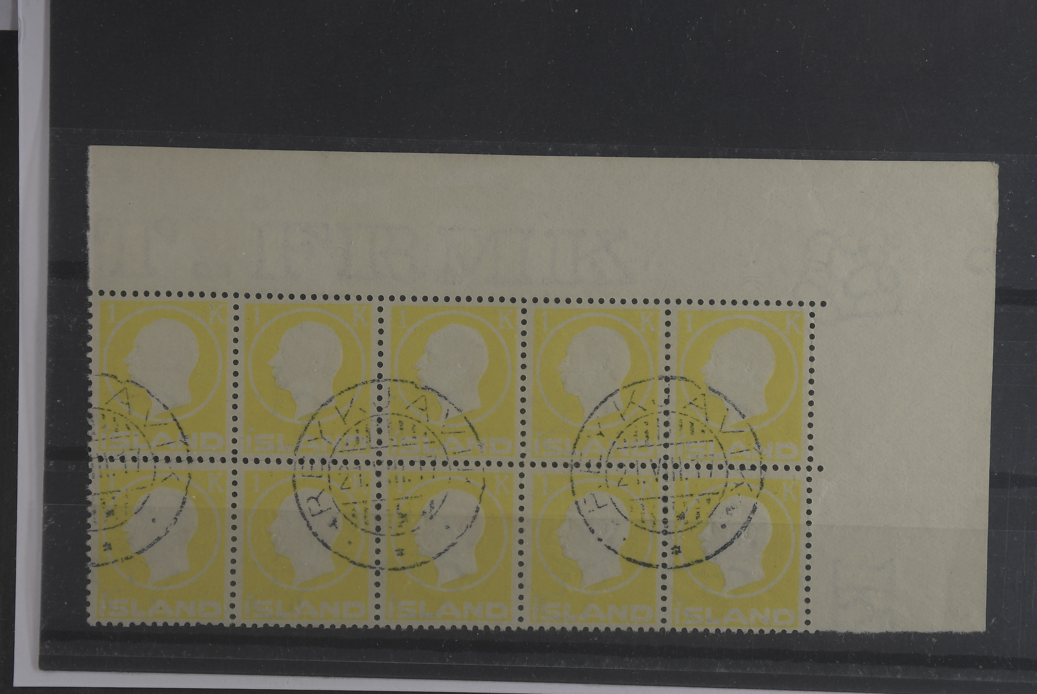 Iceland. Facit 118 used, 1912 King Frederik VIII 1 Kr yellow in block-of-ten (some split perf). Canc. REYKJAVIK 21.8.17. SEK 6500