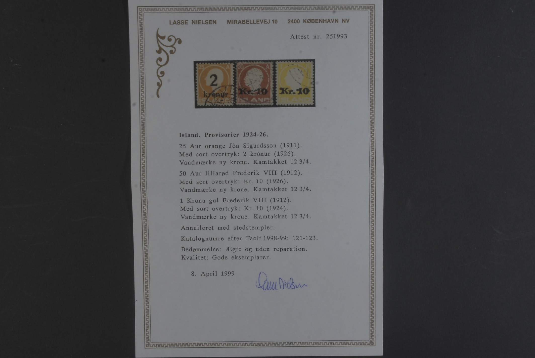 Iceland. Facit 121–23 used, 1924 Surcharge SET (3). Certificate Lasse Nielsen. SEK 11200