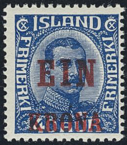 Iceland. Facit 159 ★★, 1926 New value overprint EIN KRONA / 40 aur blue. SEK 5000