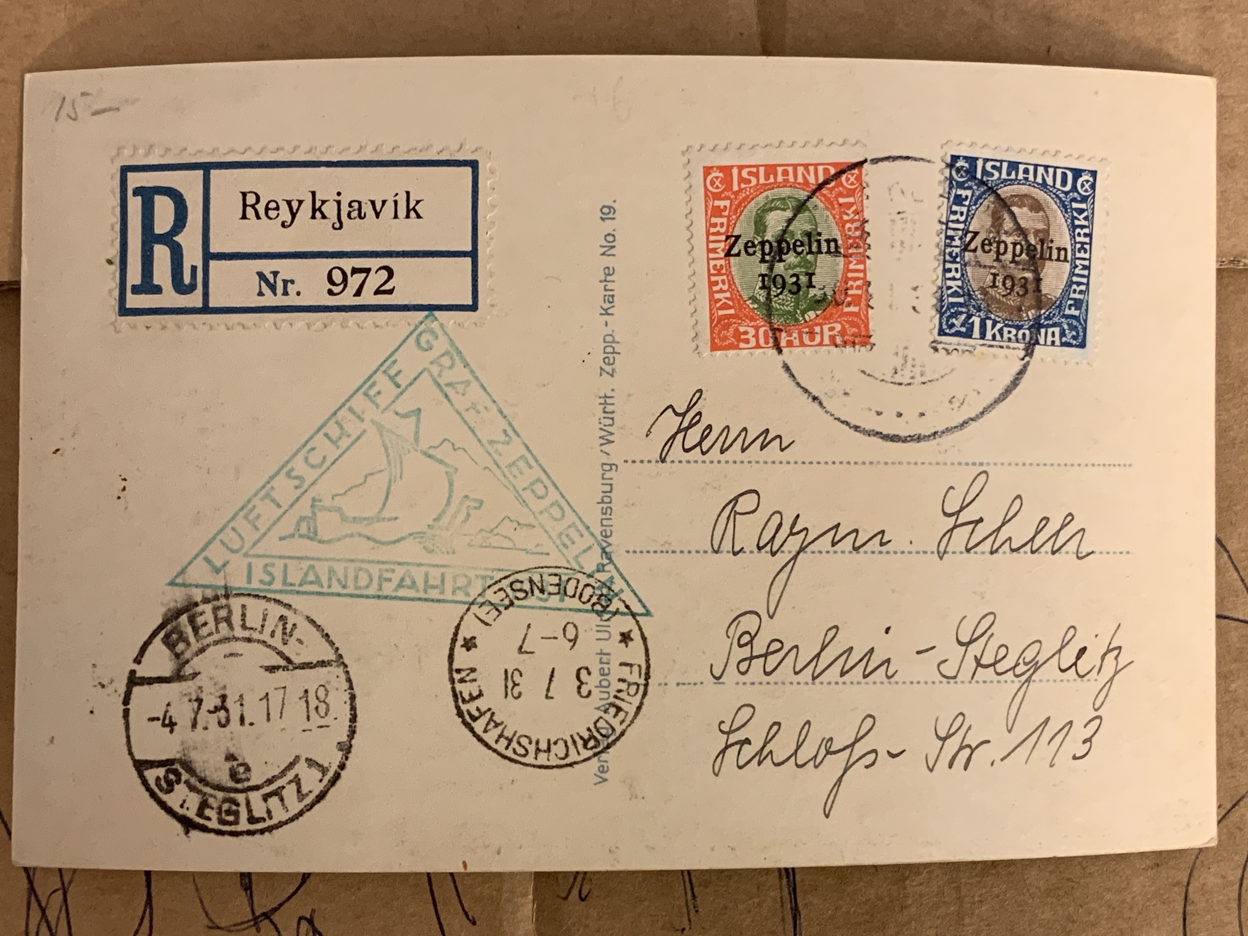 Iceland. Facit 162, 167 on cover, 1931 "Zeppelin 1931" overprint 30 aur green/red and 1 kr brown/blue on registered postcard to Berlin. Correct postage.