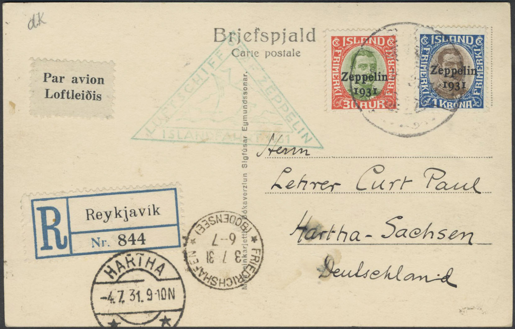 Iceland. Facit 162, 167 on cover, 1931 "Zeppelin 1931" overprint 30 aur green/red and 1 kr brown/blue on registered postcard to Germany. Correct postage.