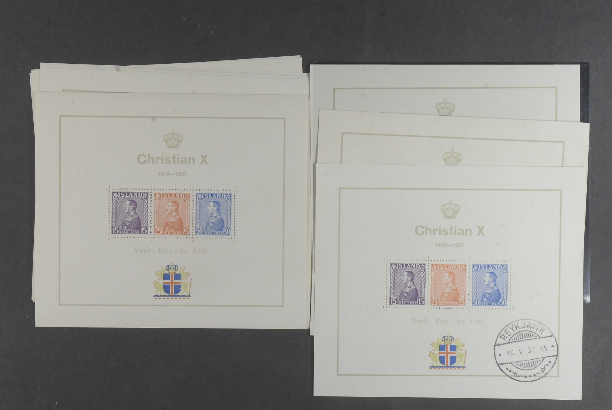 Iceland. Facit 221–23 used, 1937 Christian X, 25th anniversary as regent souvenir sheet 1 (1). 3 used and 8 ** copies. SEK 13500