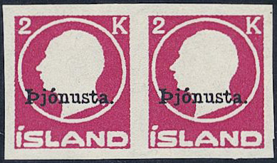 Iceland. Official Facit Tj53 I (★), 1922 Surcharge Þjonusta 2 Kr red, smaller type and with stop after a. Imperf, somewhat larger size on white paper, in pair. Proof?