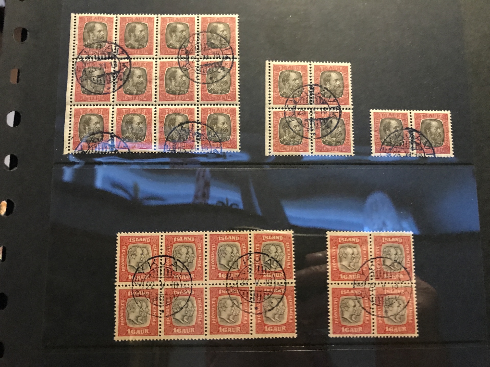 Iceland. ★★/★/⊙. OFFICIAL STAMPS. Interesting lot 1876–1936 on seven visir leaves incl. e.g. Tj4 **, Tj21 in ** pair with inverted overprint, two ** copies each Tj57–58, 68x Tj30 and 28x Tj38 in used units, 47–52 *, etc. High catalouge value. (370)