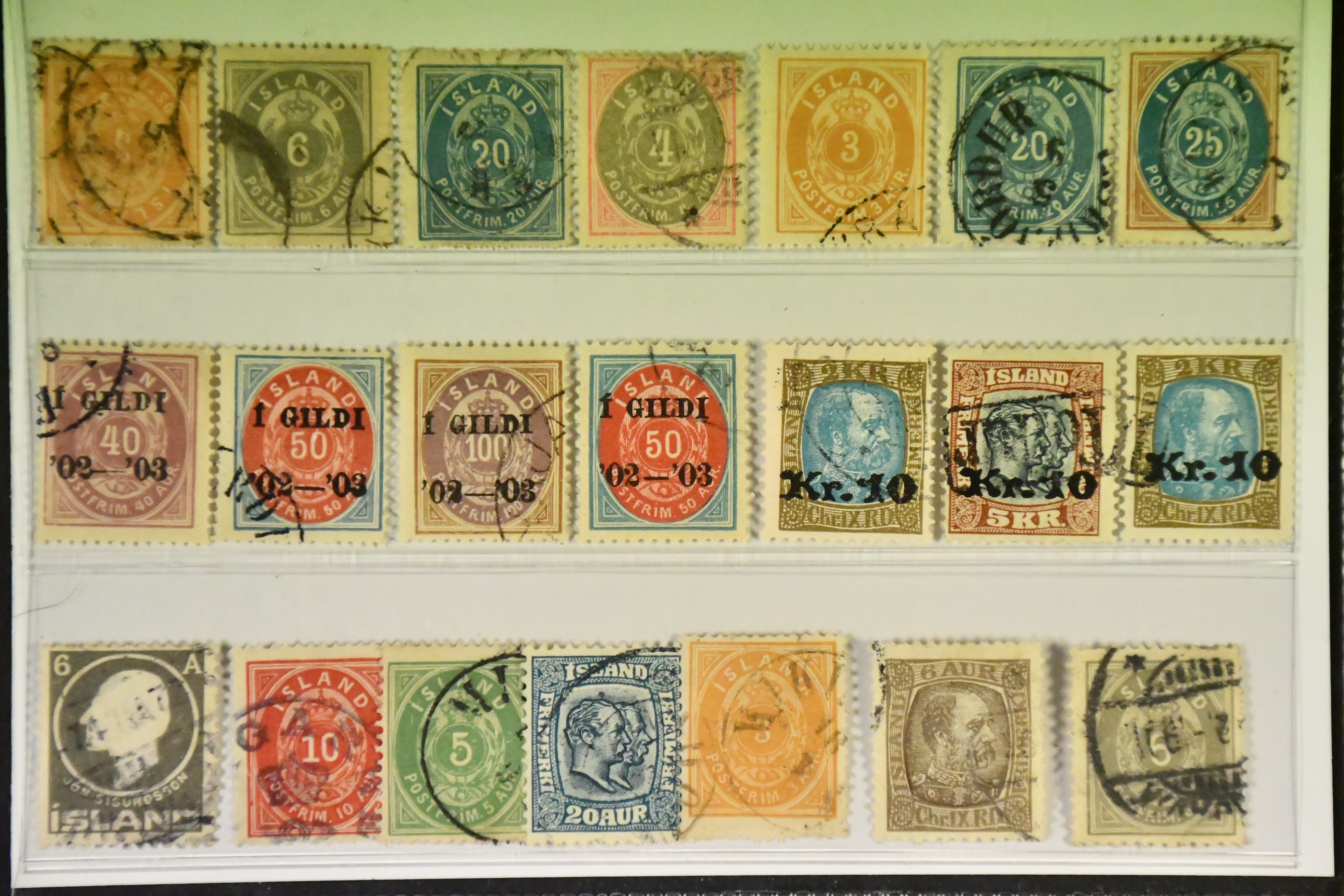 Iceland. Used 1876–1911. All different, e.g. F 8, 11, 15, 21–22, 28–29, 42–44, 58, 103, 107v, 111. Mostly good quality. F SEK 6785 (21)