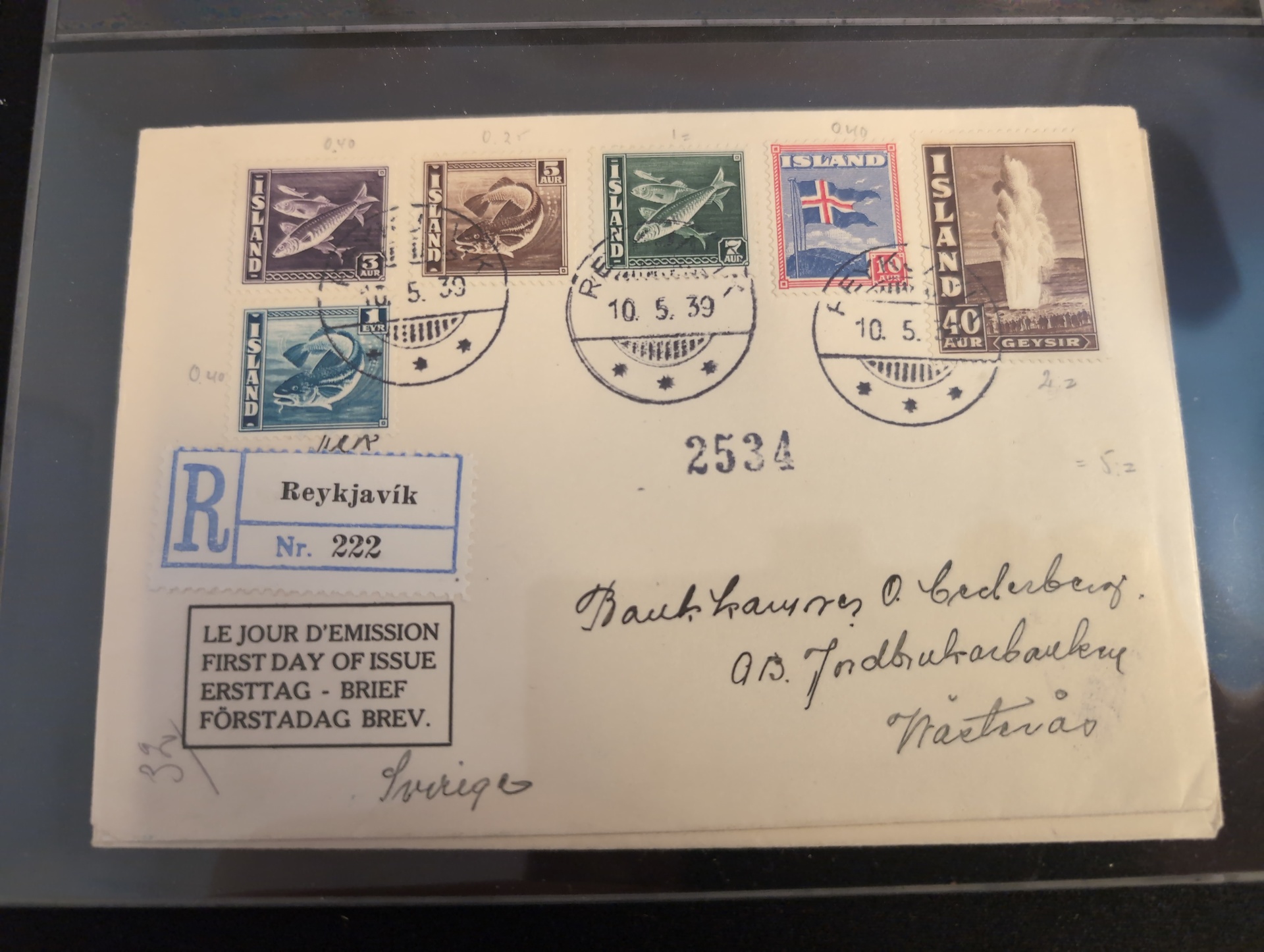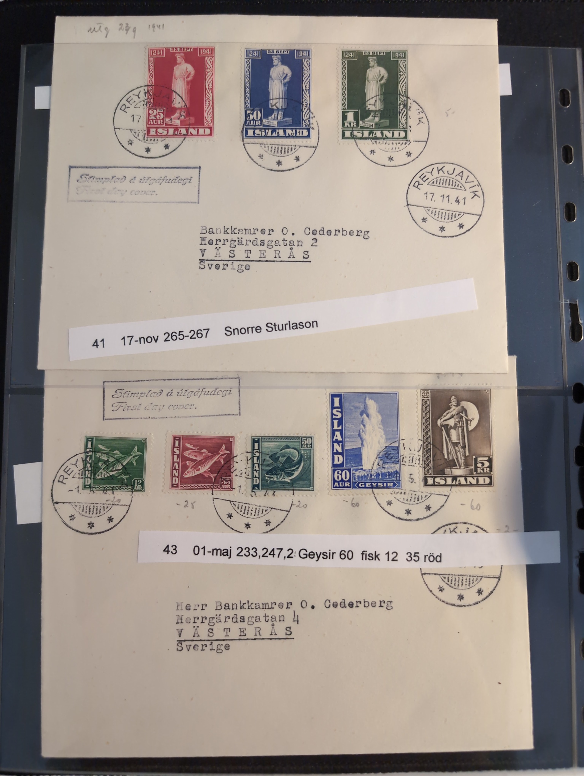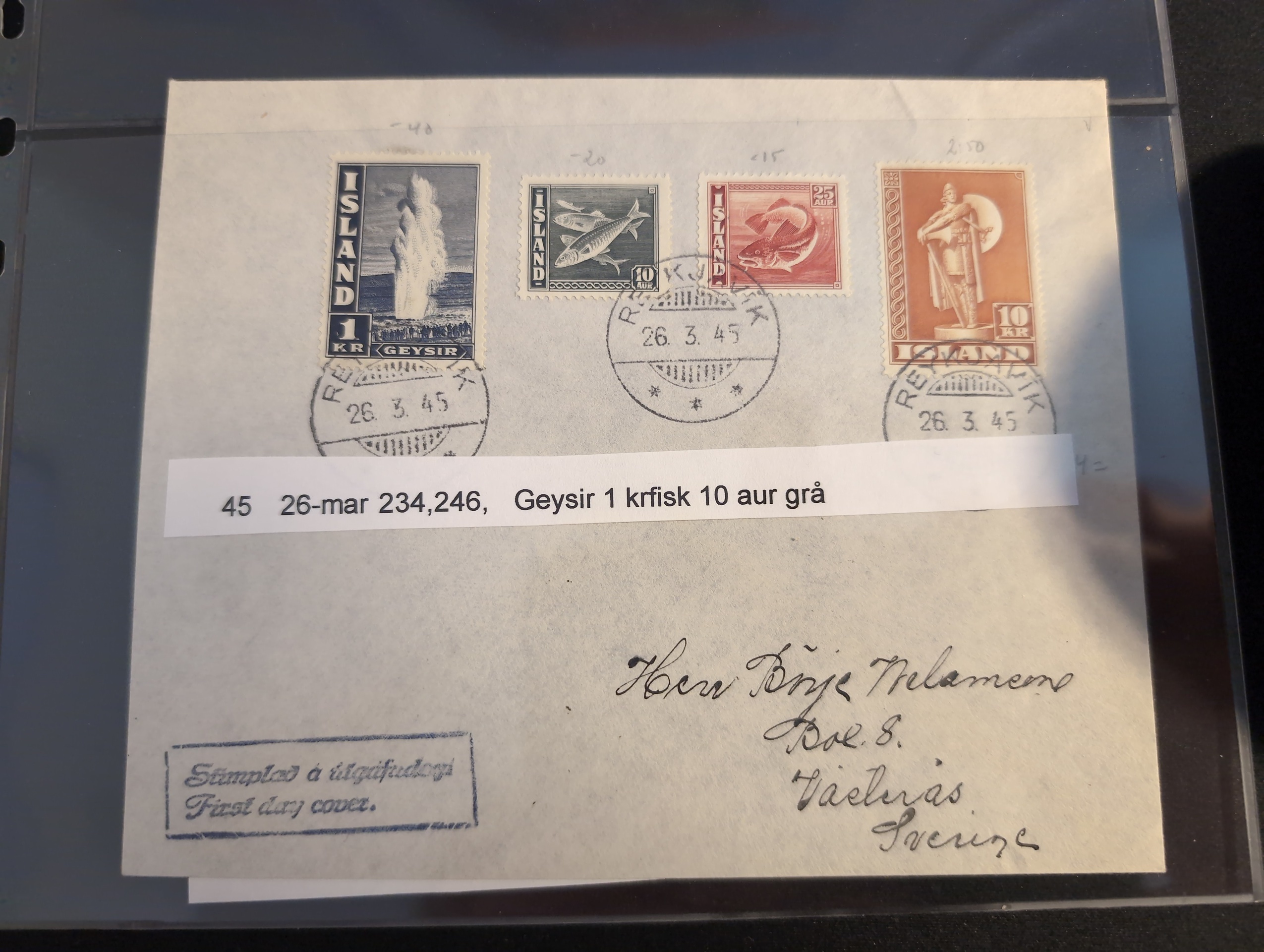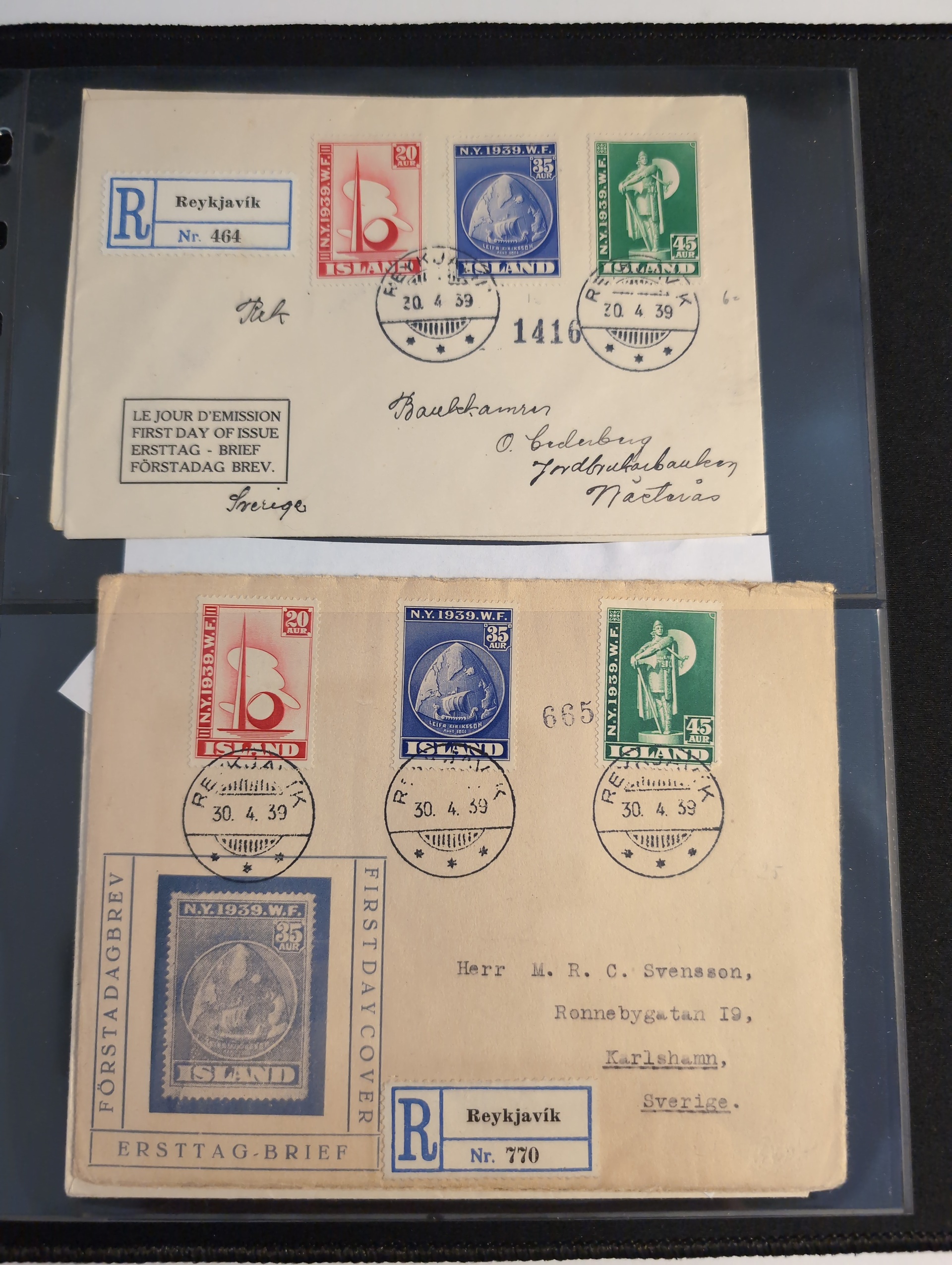 Iceland. FDCs, collection 1938–1979 in album. With 1.8.53better dates e.g. 10.5.39, 30.6.39, 6.1.40, 1.5.43, 26.3.45, 1,4.52, 1.9.52 and 1.8.53 looks complete from 16.9.63. Please see a selection of scans at www.philea.se.