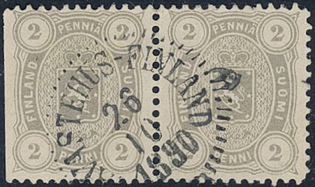 Finland. Facit 12Lv7 used, 1882 Coat of Arms m/75, Stamp Office Printing 2 p grey, perf 12½ imperf at left in pair with normal. Cancelled AVISTEHUS-FINLAND 26.10.1890. SEK 1500