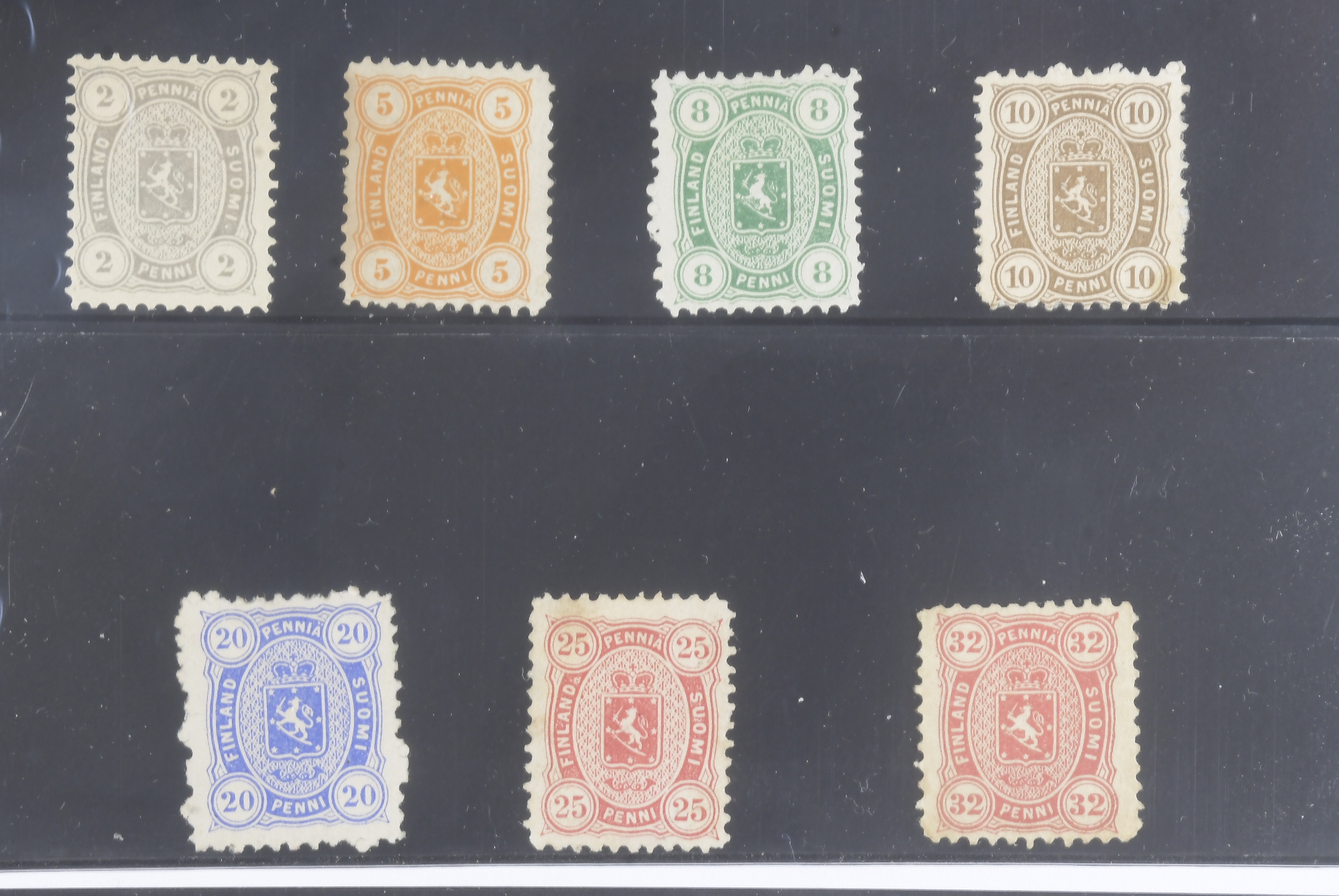 Finland. Facit 12s ★, 1875 Coat of Arms m/75, Senate printing. Complete set perf. 11 – 8 p and 25 p without gum, 10 p with disturbed gum and thin. SEK 5000