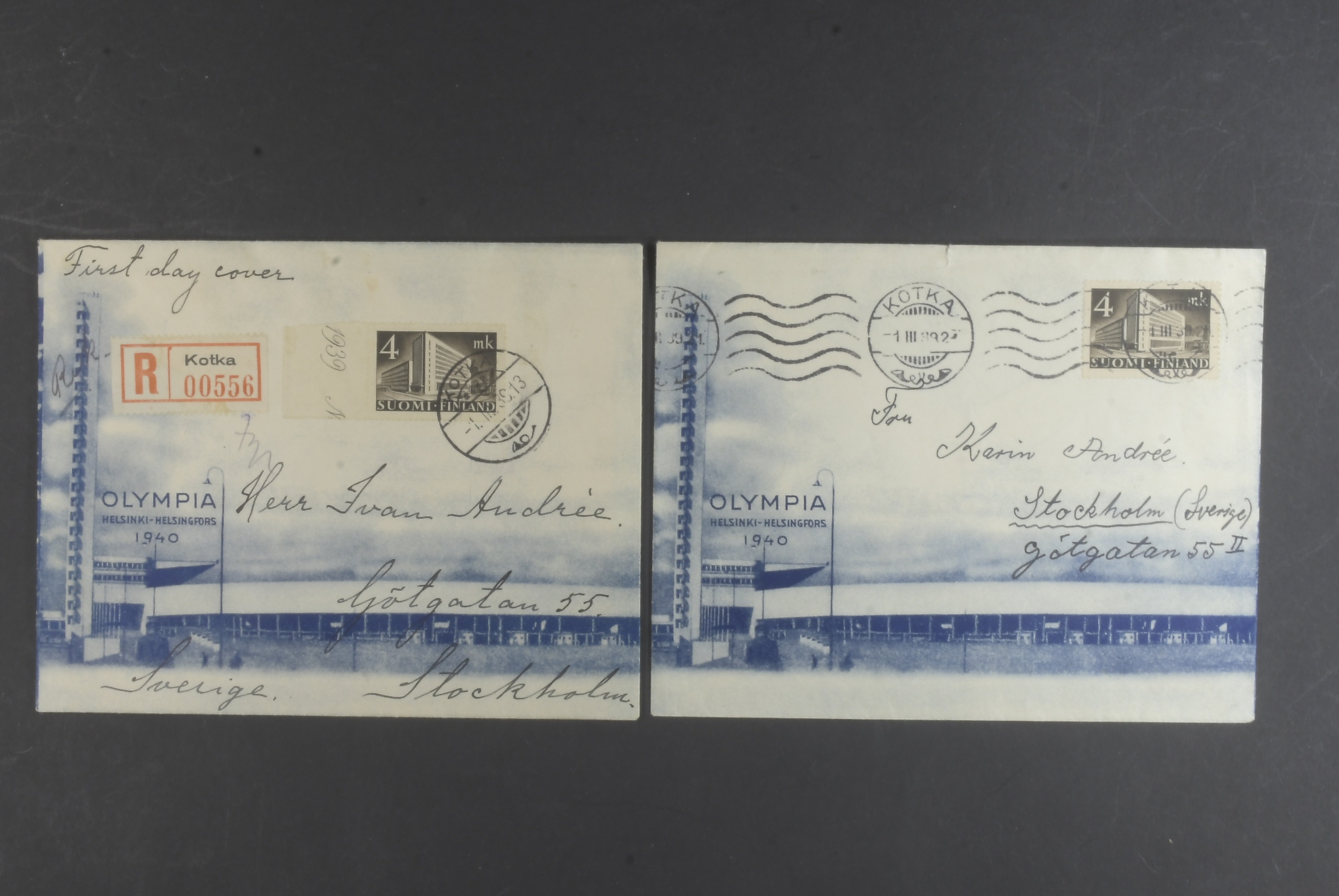 Finland. Facit 225, 230 on FDC, Three FDC's on special olympic games covers. F225 cancelled in Kotka one with handstamp (Registered) and one with machine cancel. F230 cancelled in Pori and censored.