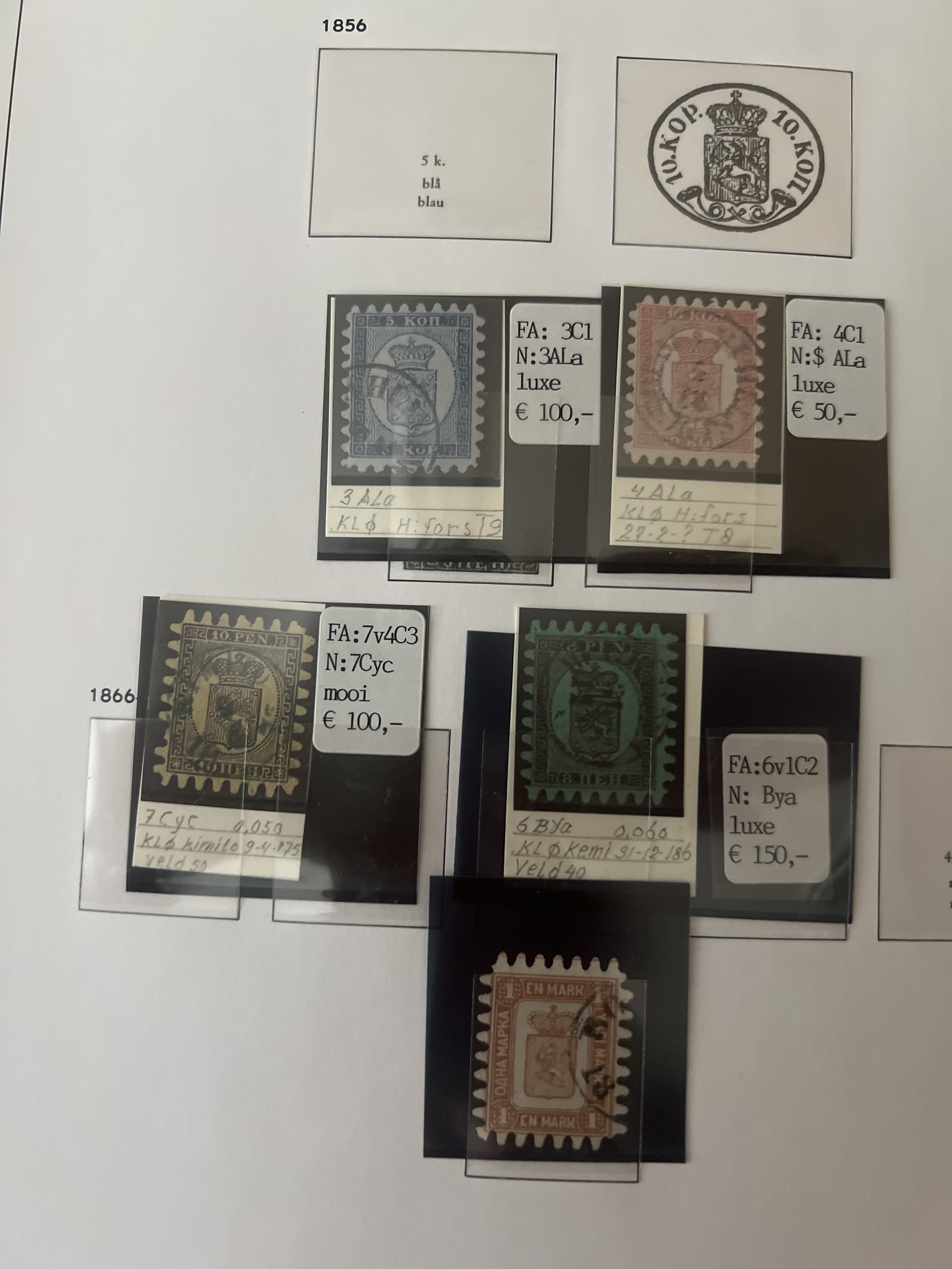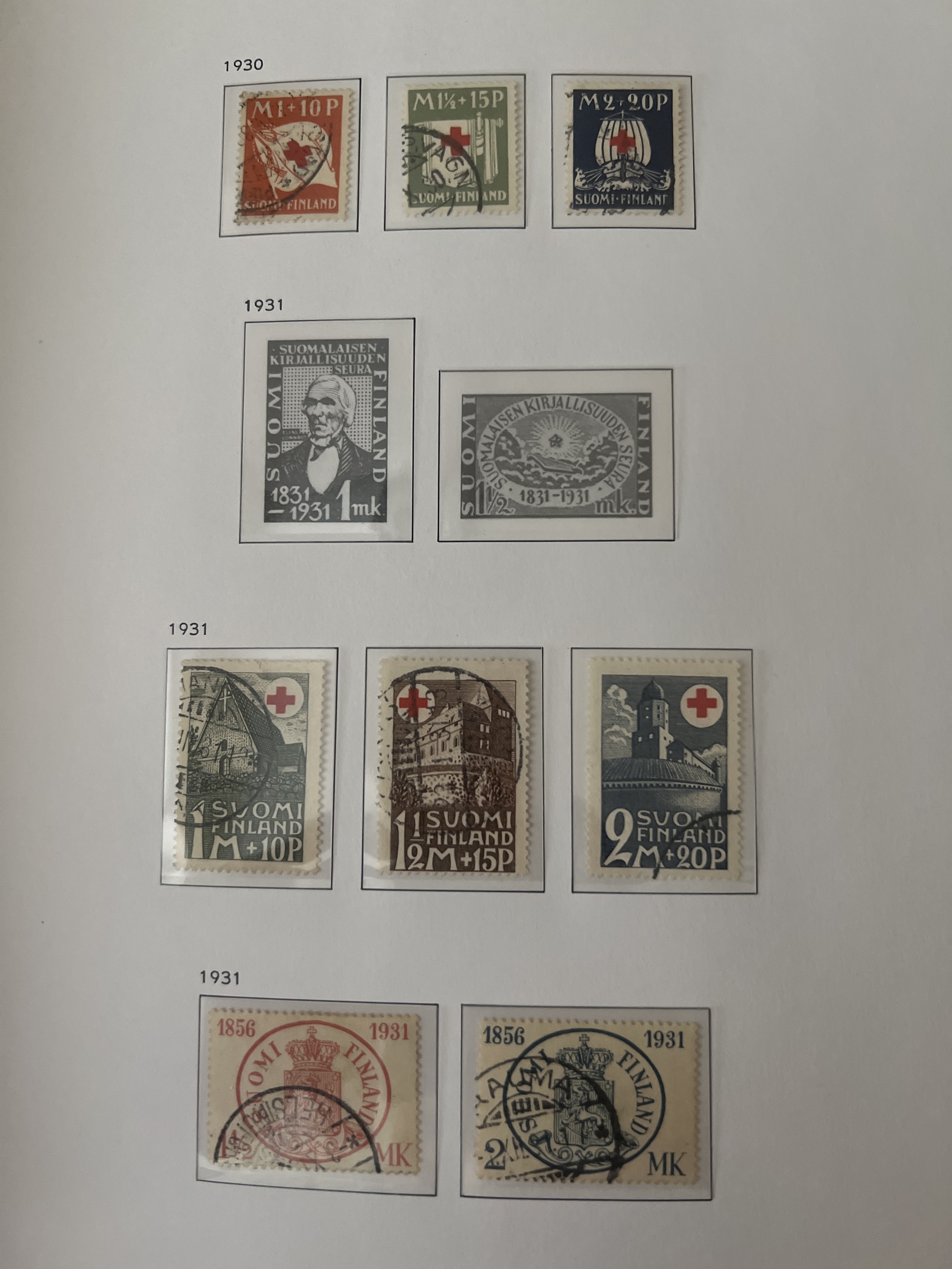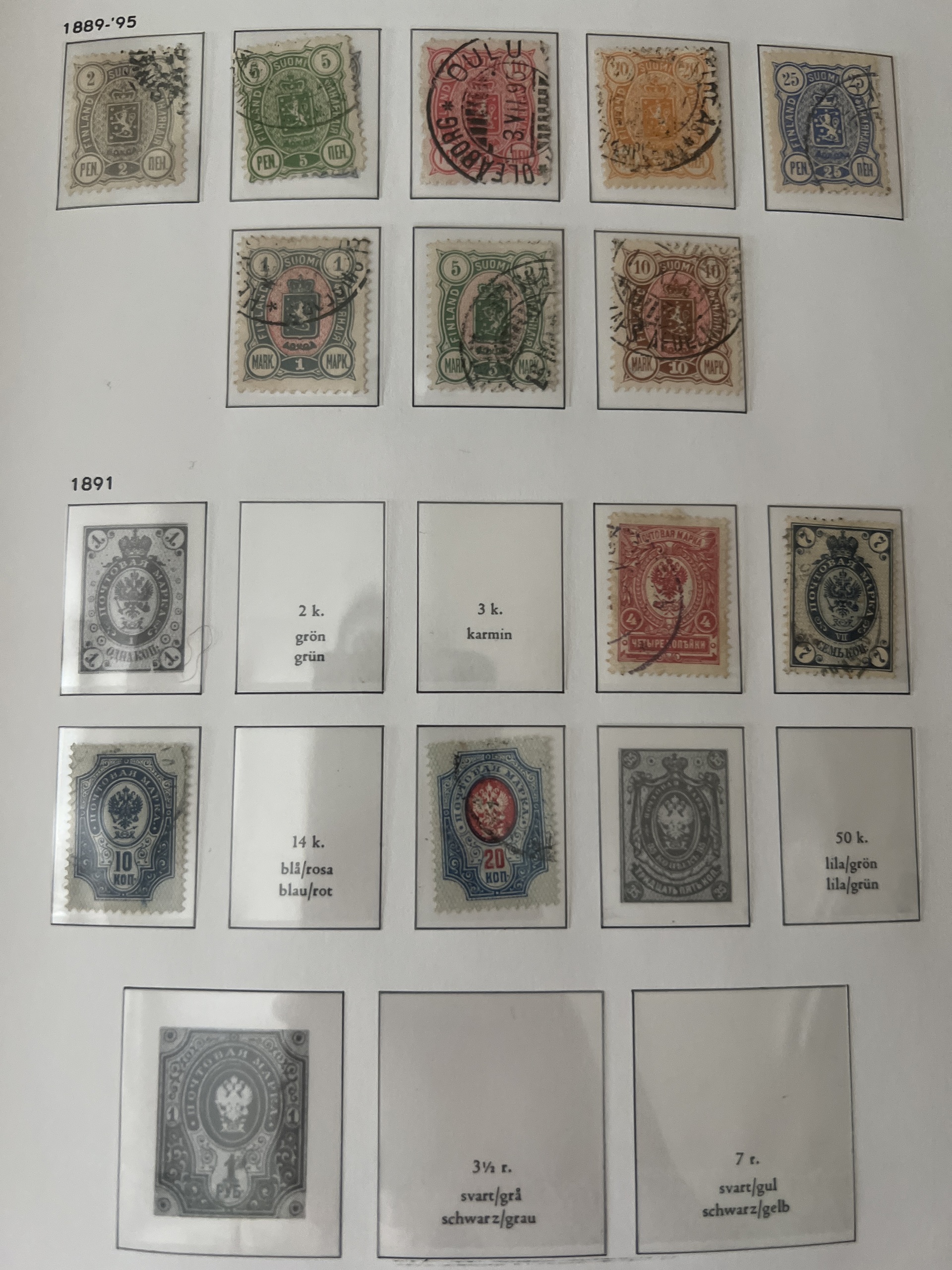 Finland. Collection/accumulation ★★/★/⊙ 1860–1999 in two albums. First album is a Davo album with 5 serpentines incl. 1mk all very fine. Then some better four numbered and three numbered issues. 1930s with some better sets and Zeppelin, also some back of the book. Stockbook with mint stamps incl. some early reprints and better stamps incl 1r and 3.50R with rings. Please see a selection of scans at www.philea.se. Mostly fine quality. (1000+)