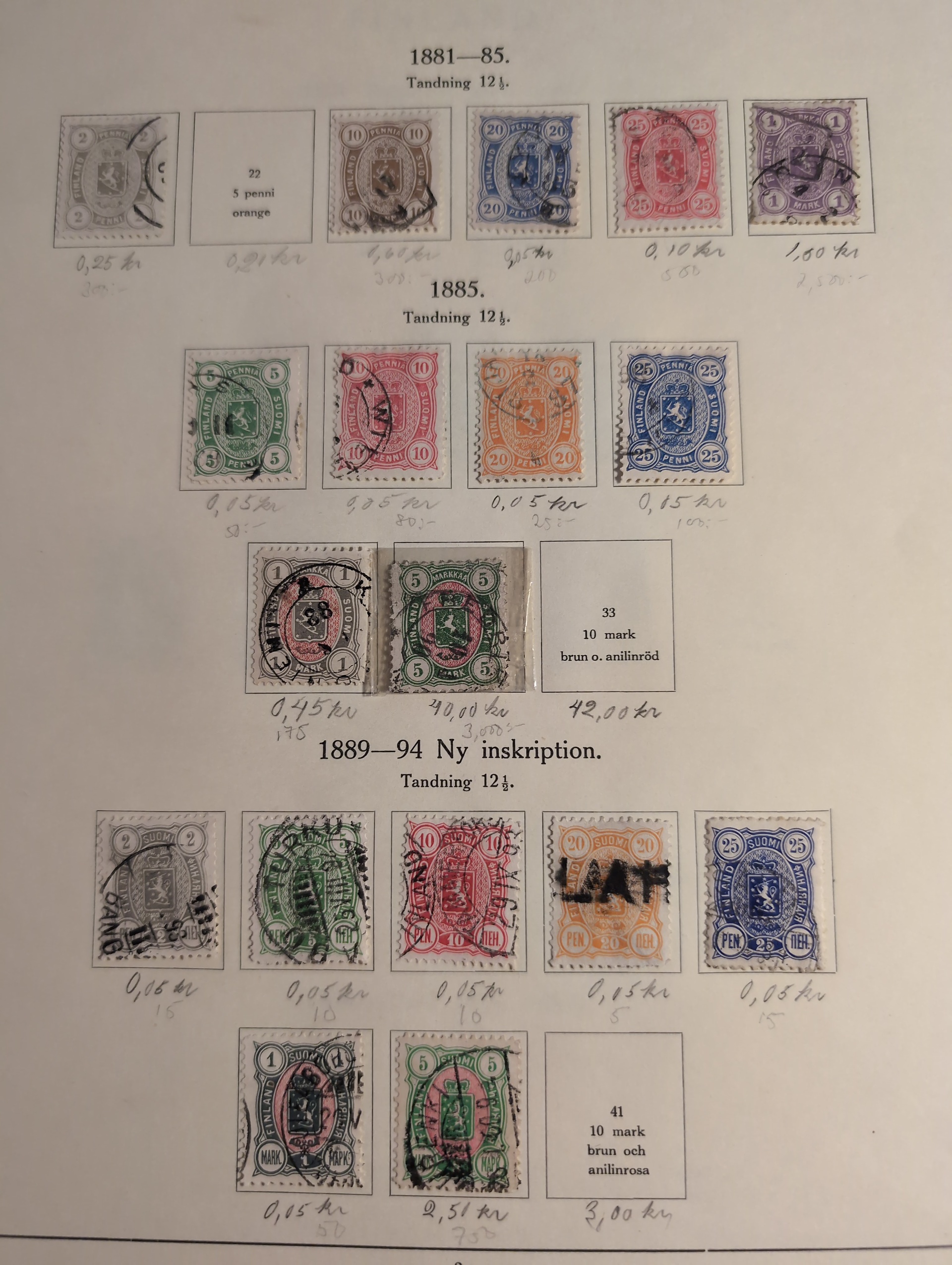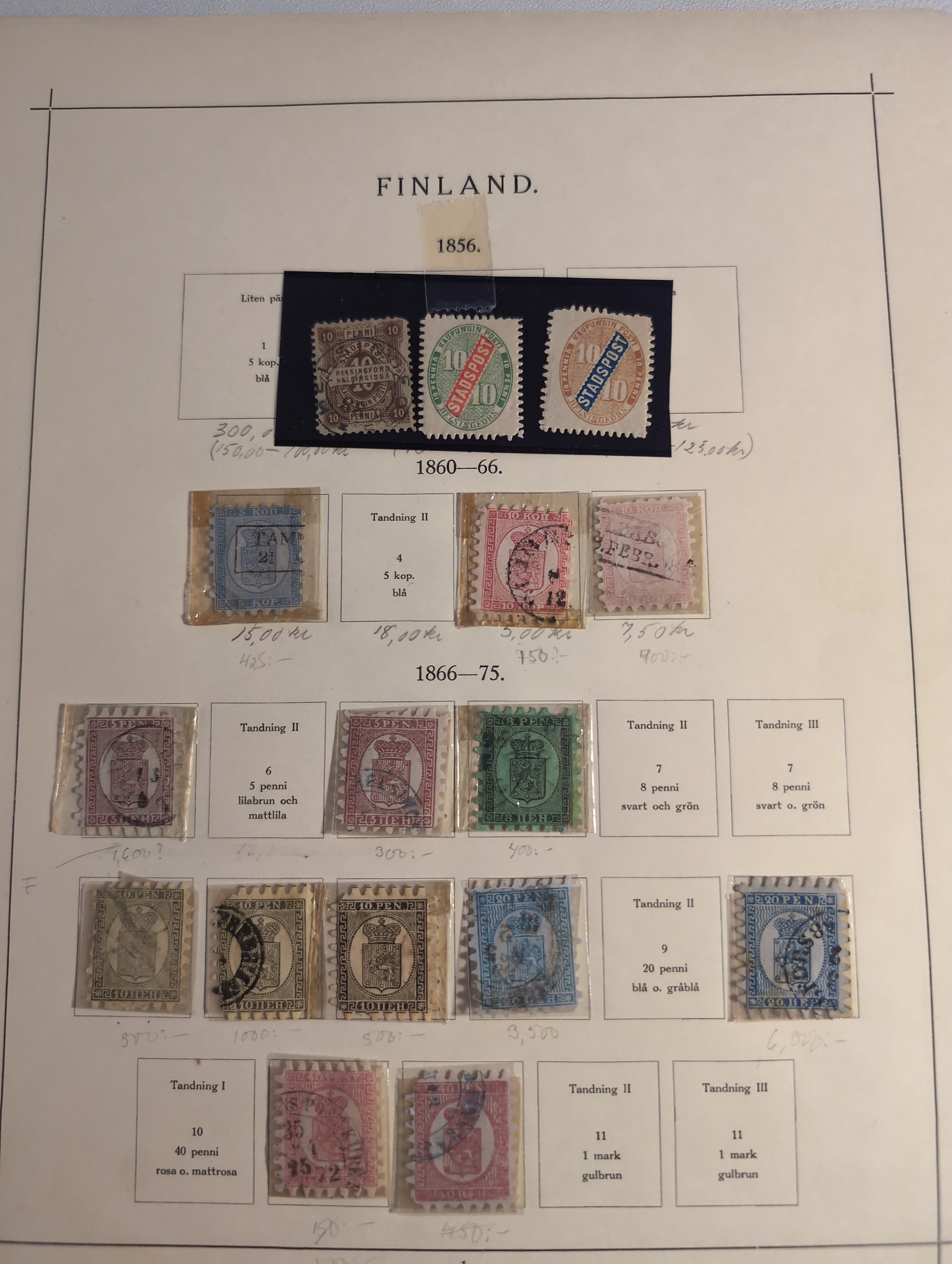Finland. Collection used 1860–1927 on leaves. Serpentines (13) in mixed condition, and some other better stamps e.g. F25 "Four numbered" 5Mk .Please see a selection of scans at www.philea.se. Mixed quality. (100+)