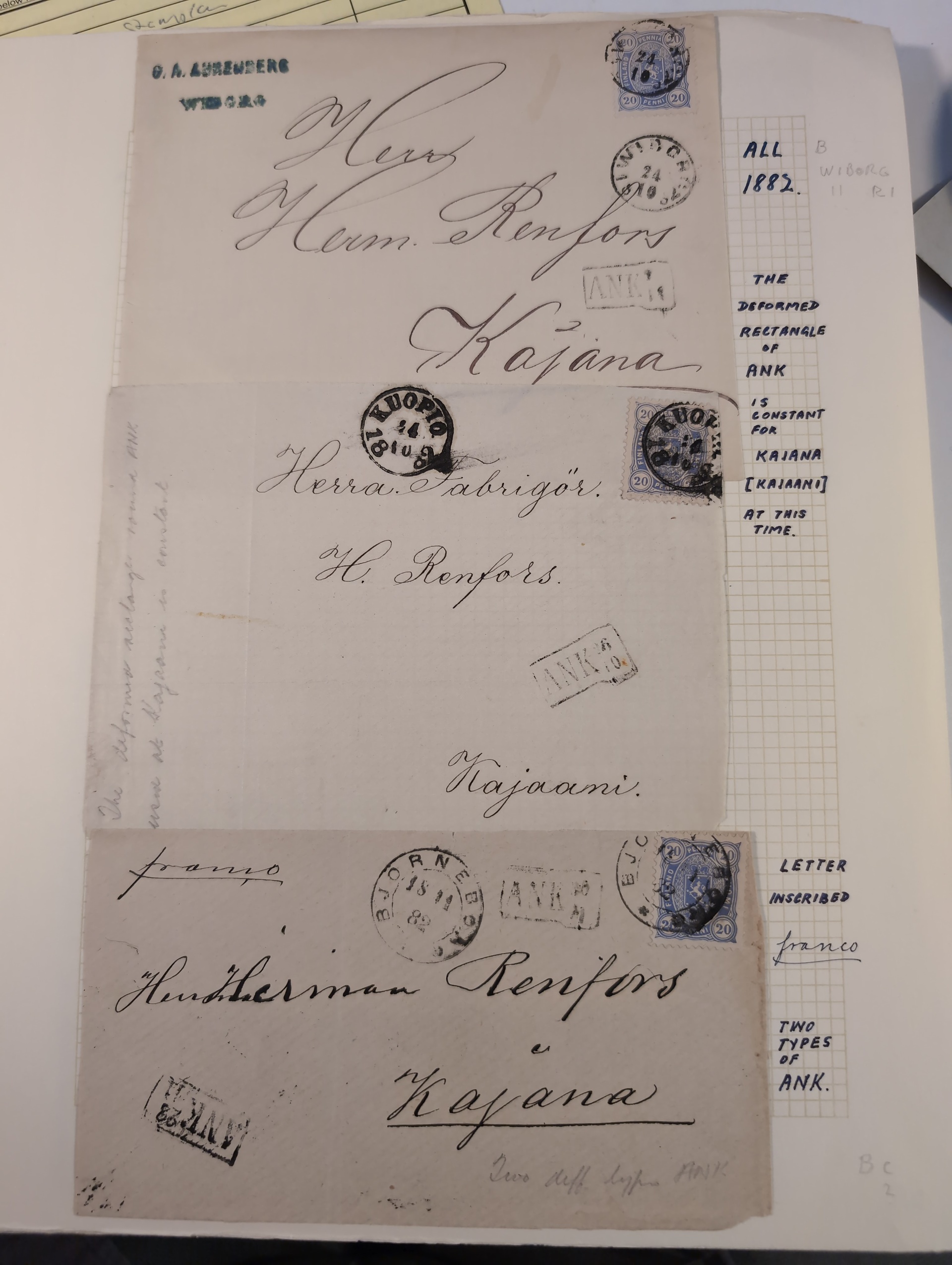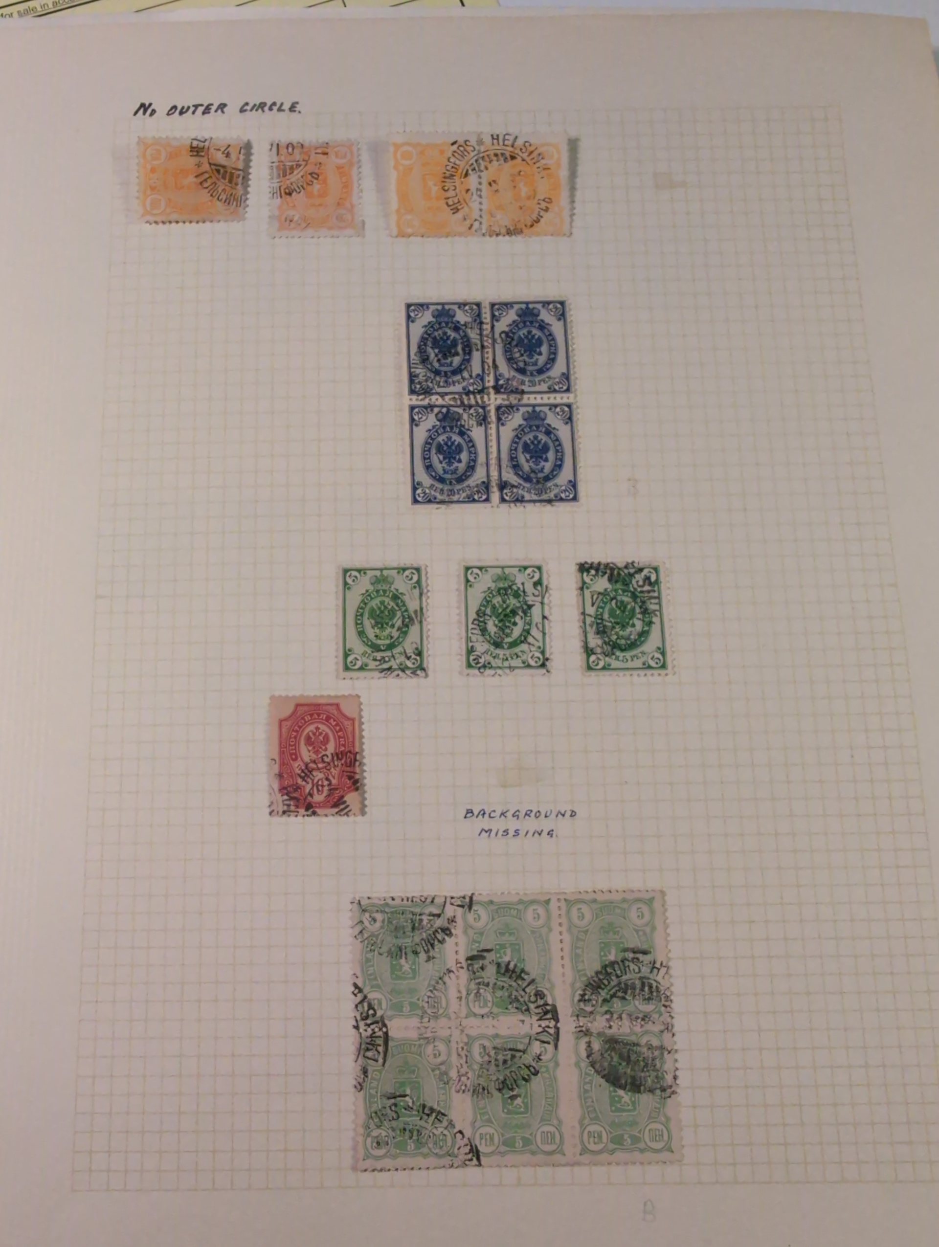 Finland. Cancellations, accumulation 1870s-1920s on leaves and club books. One small stack of album pages, four club books. Incl. about 75 covers and cards. With an wide array of cancels. The club books with 2 ring cancels A–Ö, on the album pages with many different types incl. Swedish ANK. Interesting lot with many nice cancels. Please see a selection of scans at www.philea.se. Mostly fine quality. (1000+)
