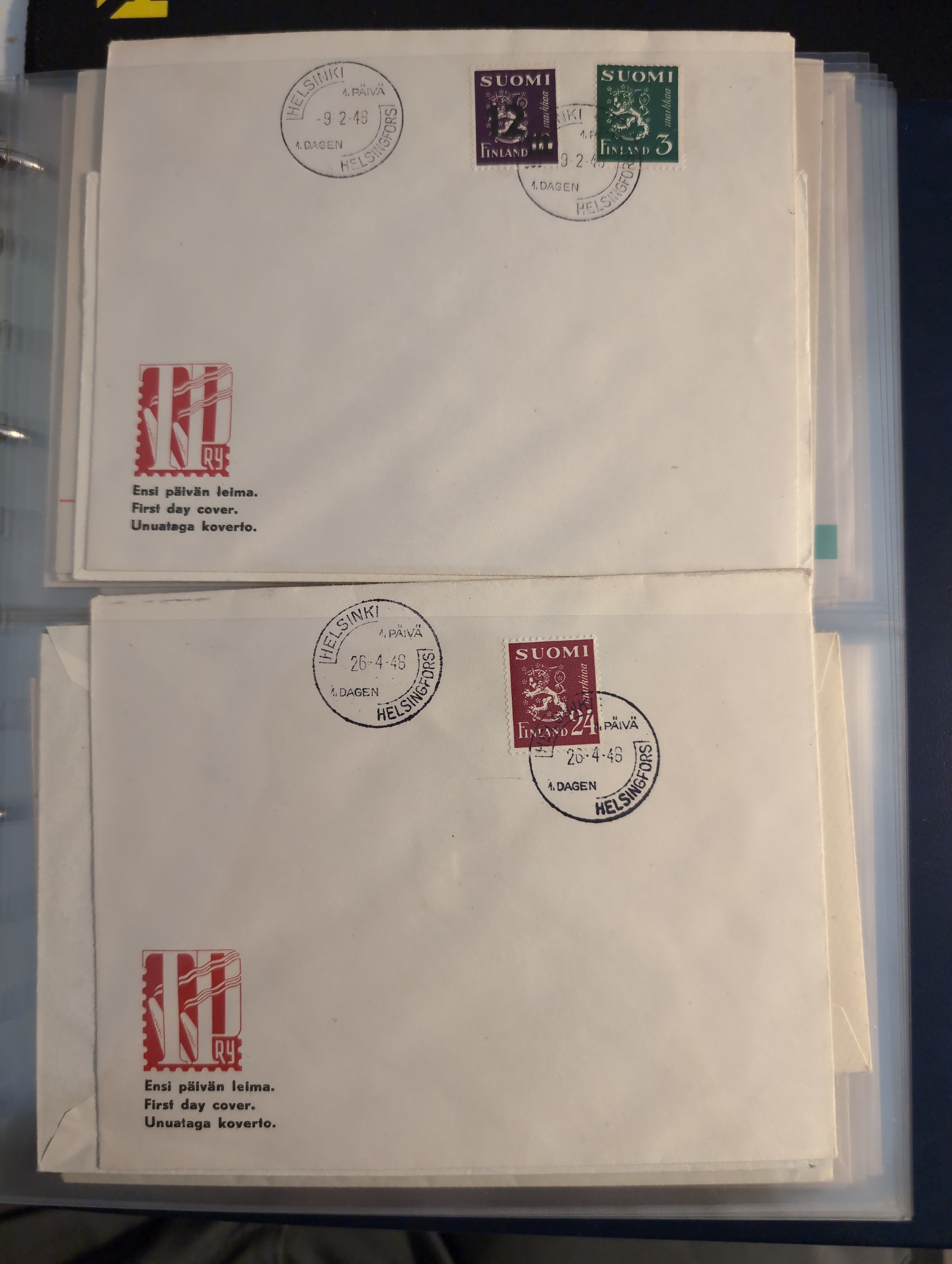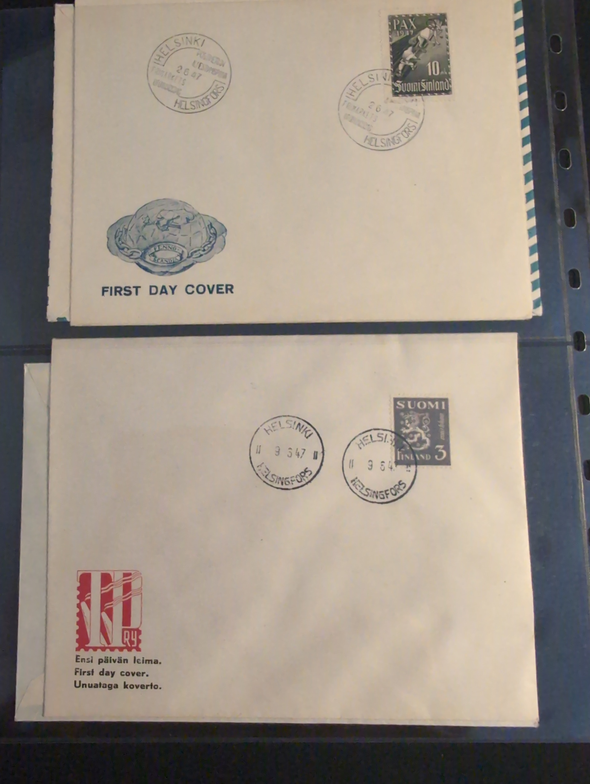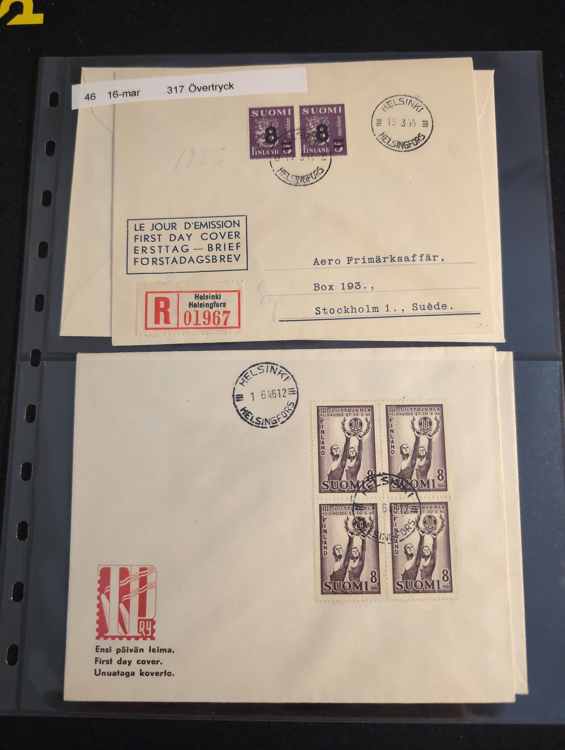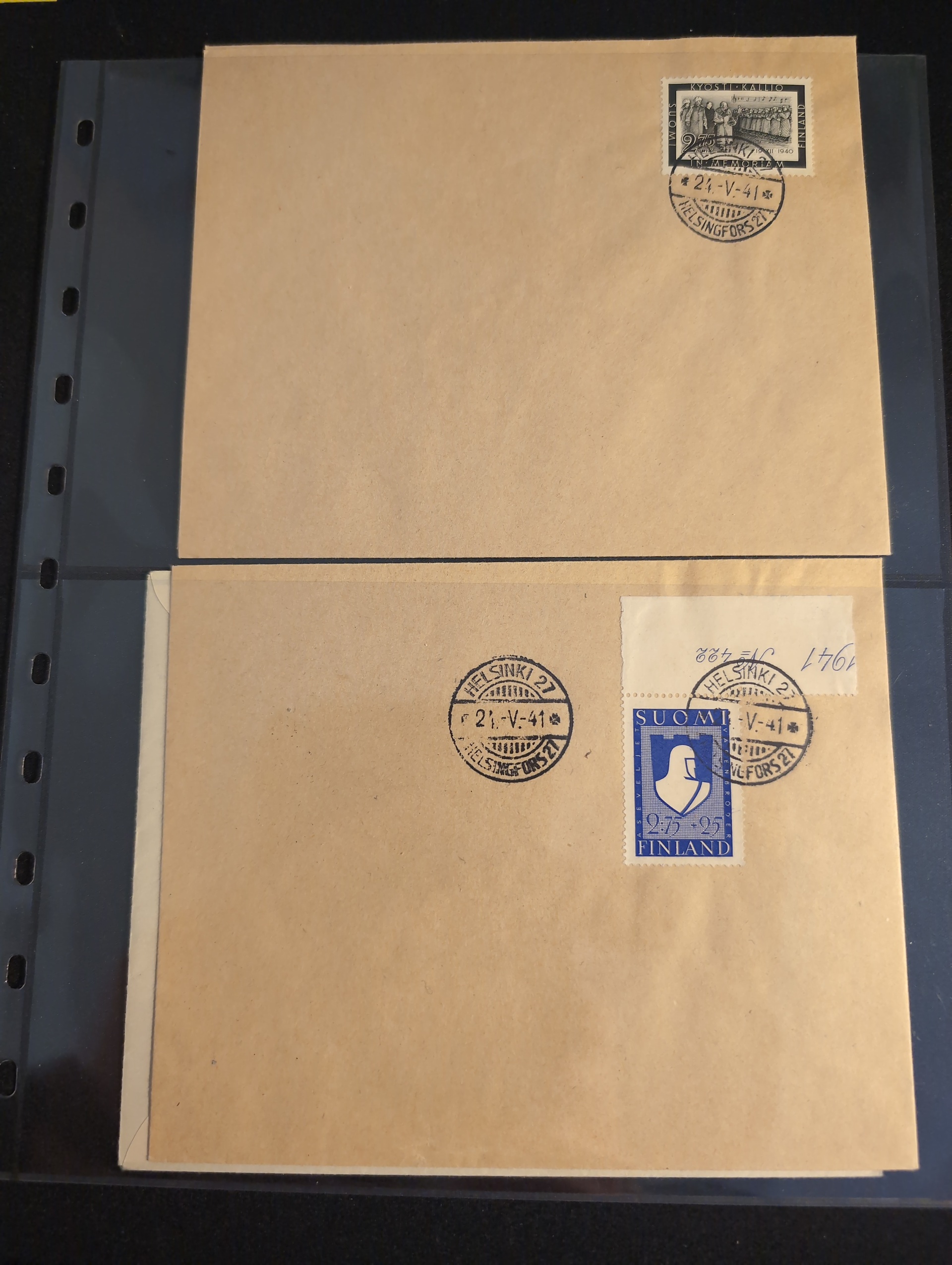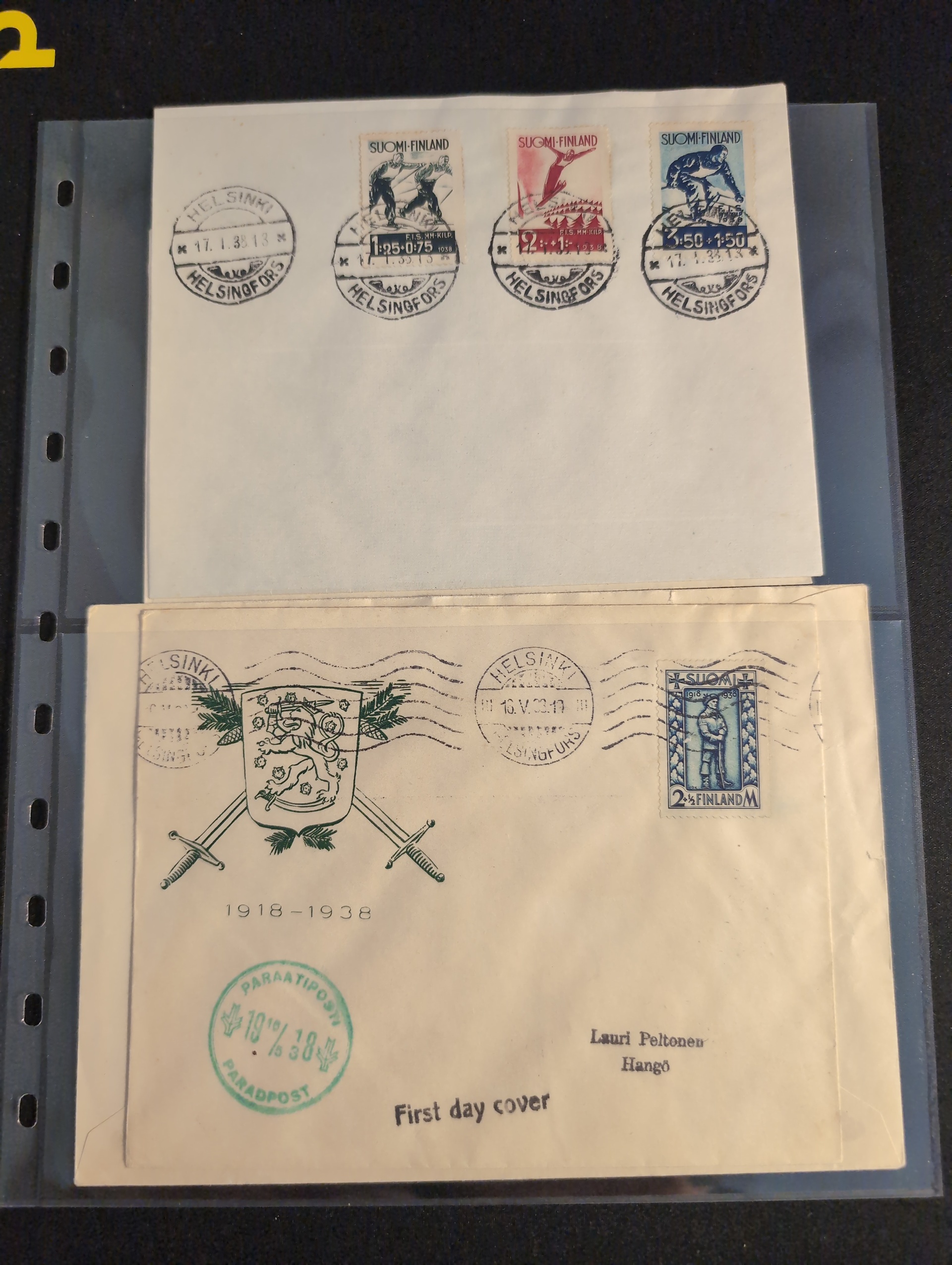 Finland. FDCs, collection 1928–1970 in box. Three album with extensive collection incl. many better e.g. 10.11.1928, 10.10.34 (pair), 28.2.35, 17.1.38, 2.1.39, 26.1.40, 15.2.40, 24.V.41 (both), 2.1.42, 2.1.43, 2.1.44, 24.1.46, 16.3.46 (pair), 9.6.47 and many more. The collection looks complete from 1946. Please see a selection of scans at www.philea.se. Mostly fine quality. (several 100s)