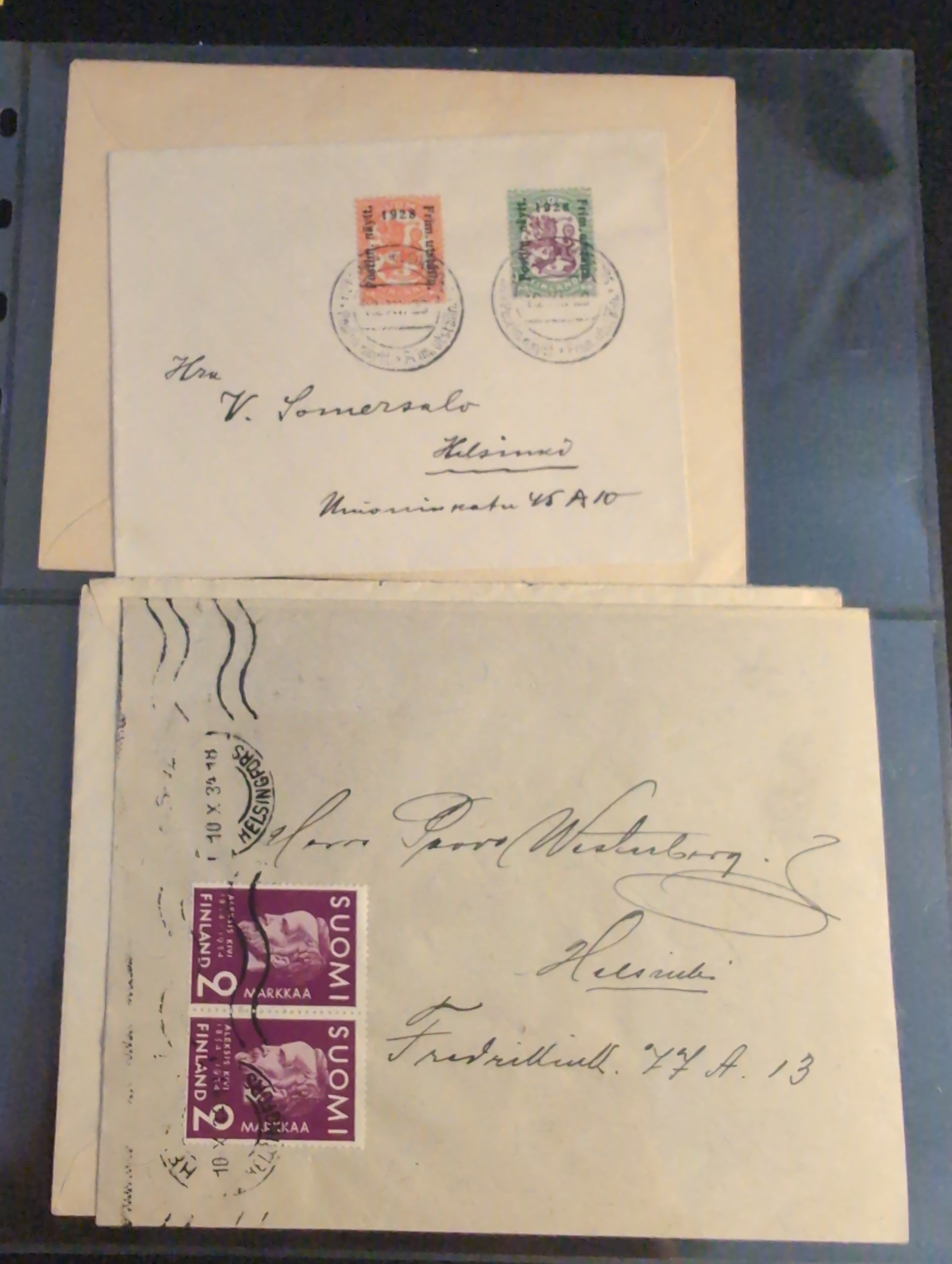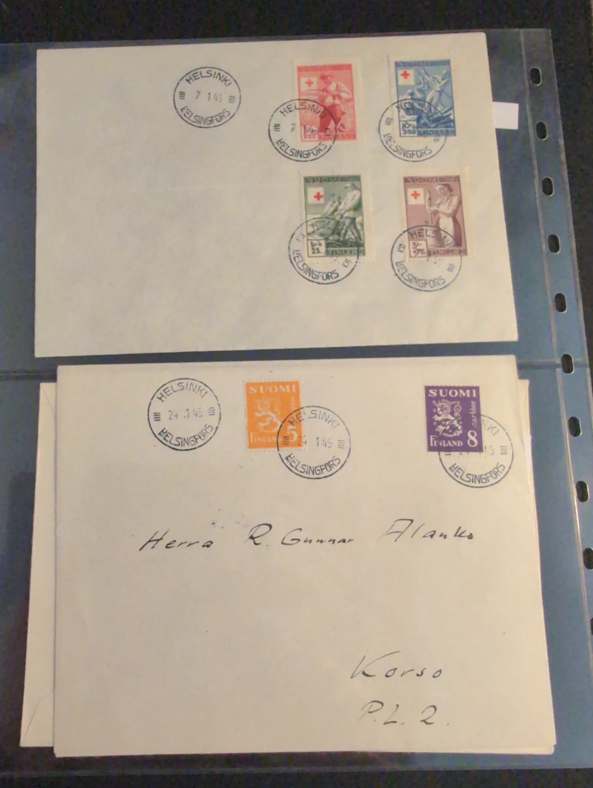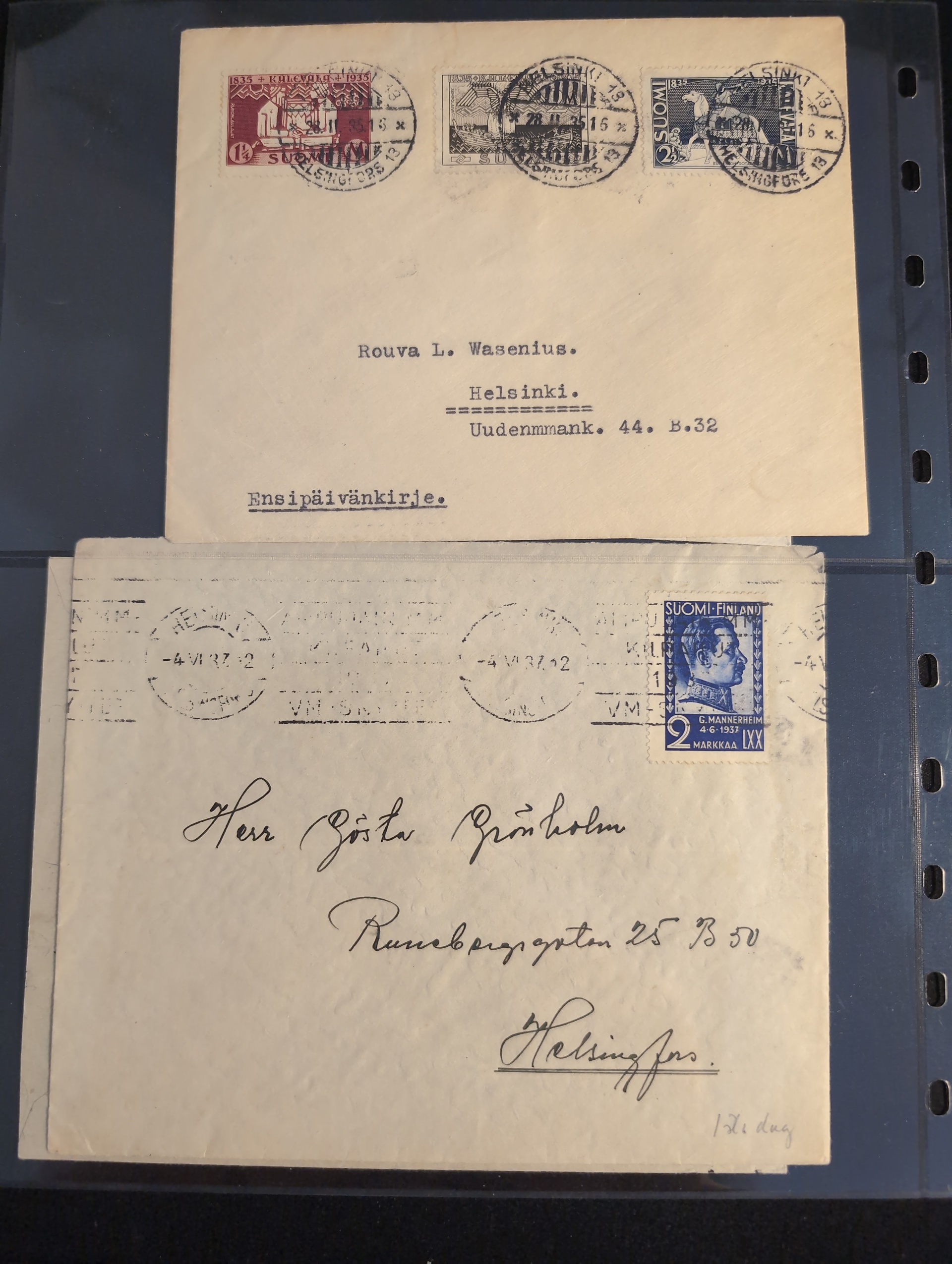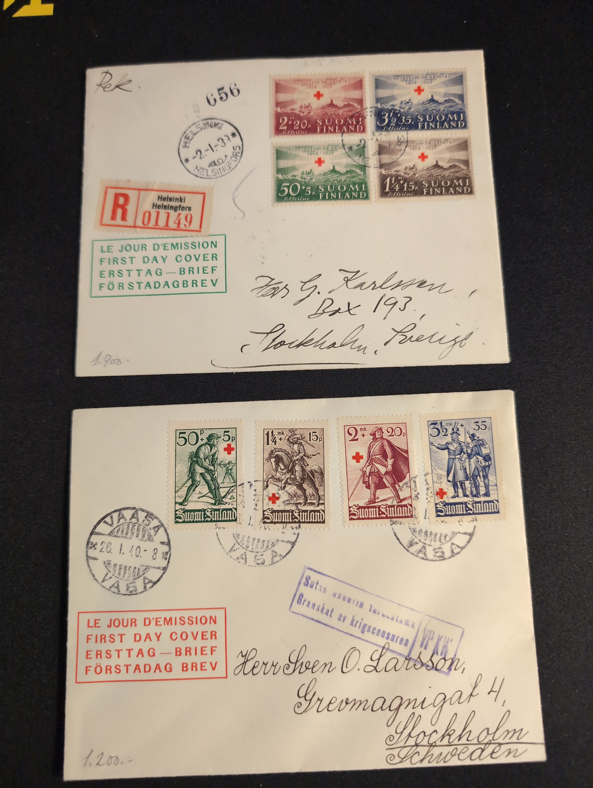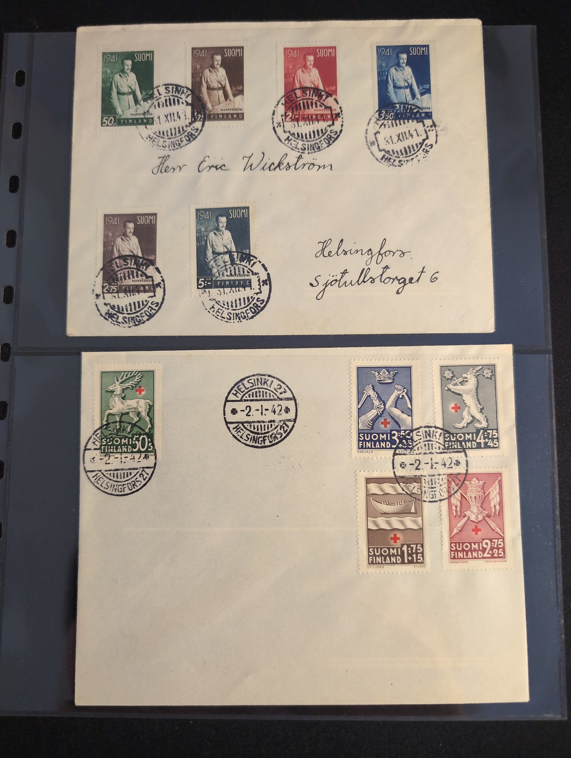 Finland. FDCs, collection 1928–1970 in box. Three album with extensive collection incl. many better e.g. 10.11.1928, 10.10.34 (pair), 28.2.35, 17.1.38, 2.1.39, 26.1.40, 15.2.40, 24.V.41 (both), 2.1.42, 2.1.43, 2.1.44, 24.1.46, 16.3.46 (pair), 9.6.47 and many more. The collection looks complete from 1946. Please see a selection of scans at www.philea.se. Mostly fine quality. (several 100s)
