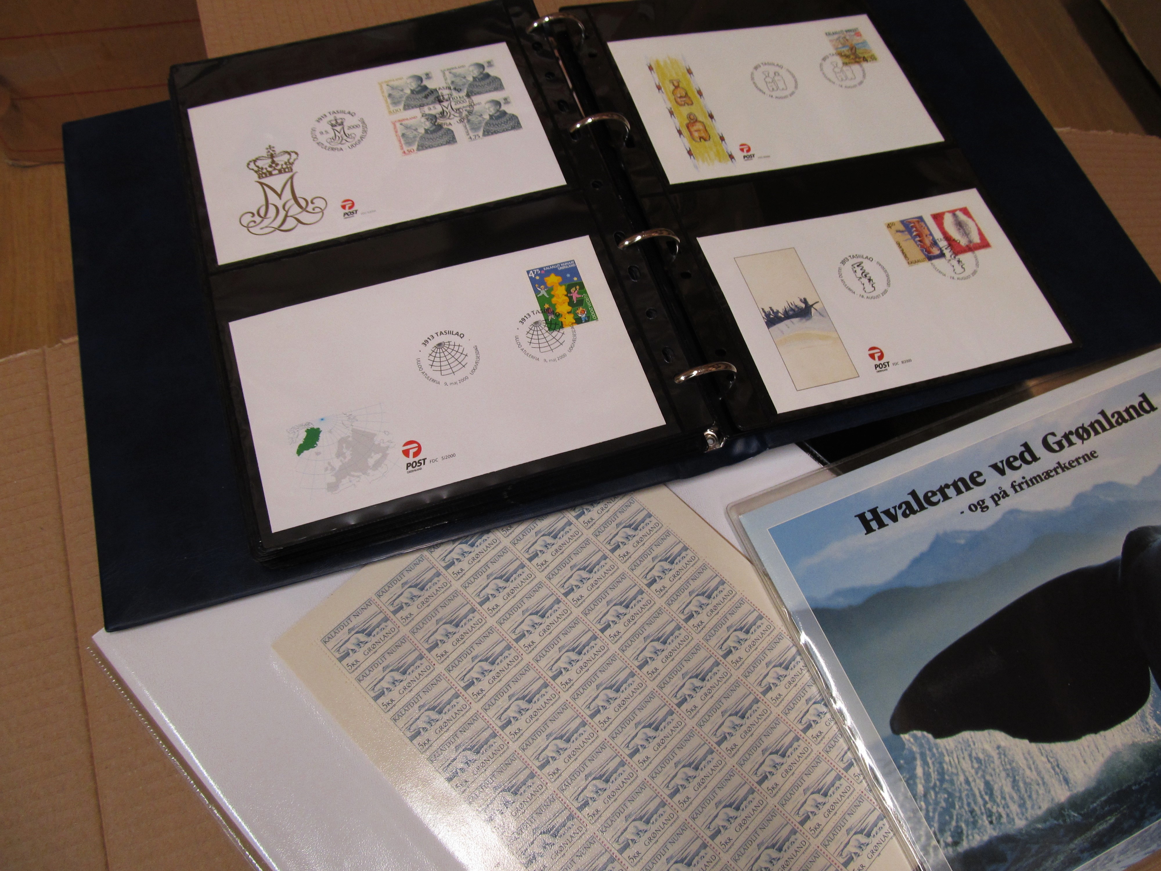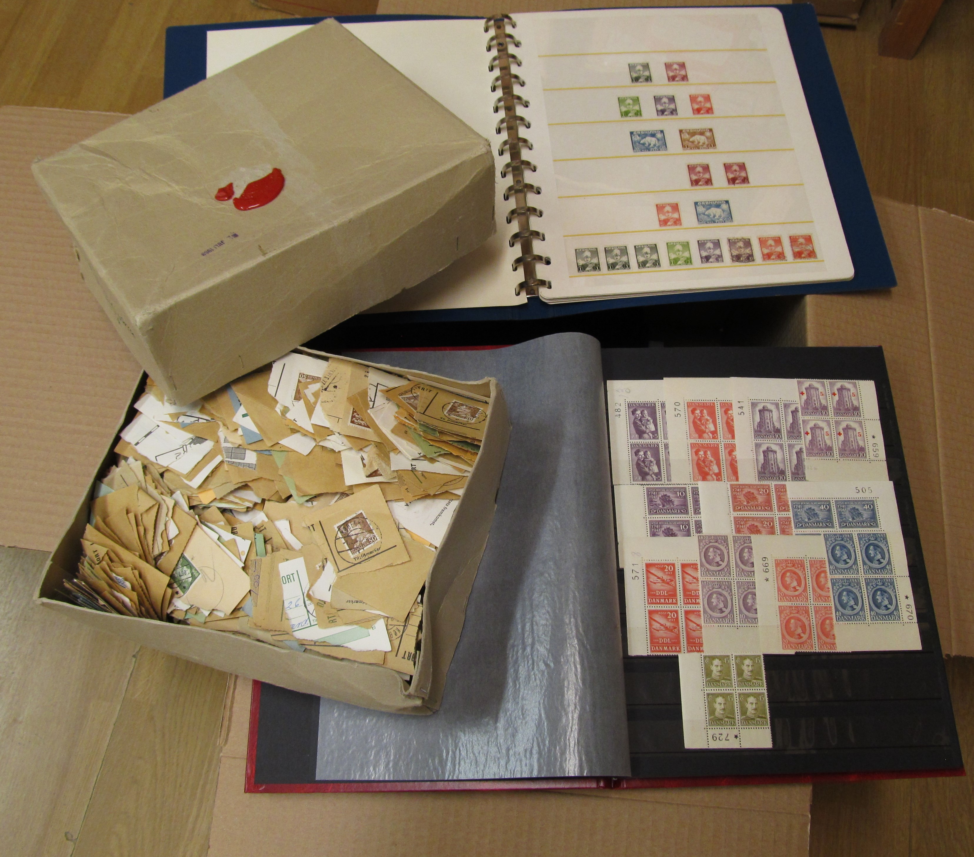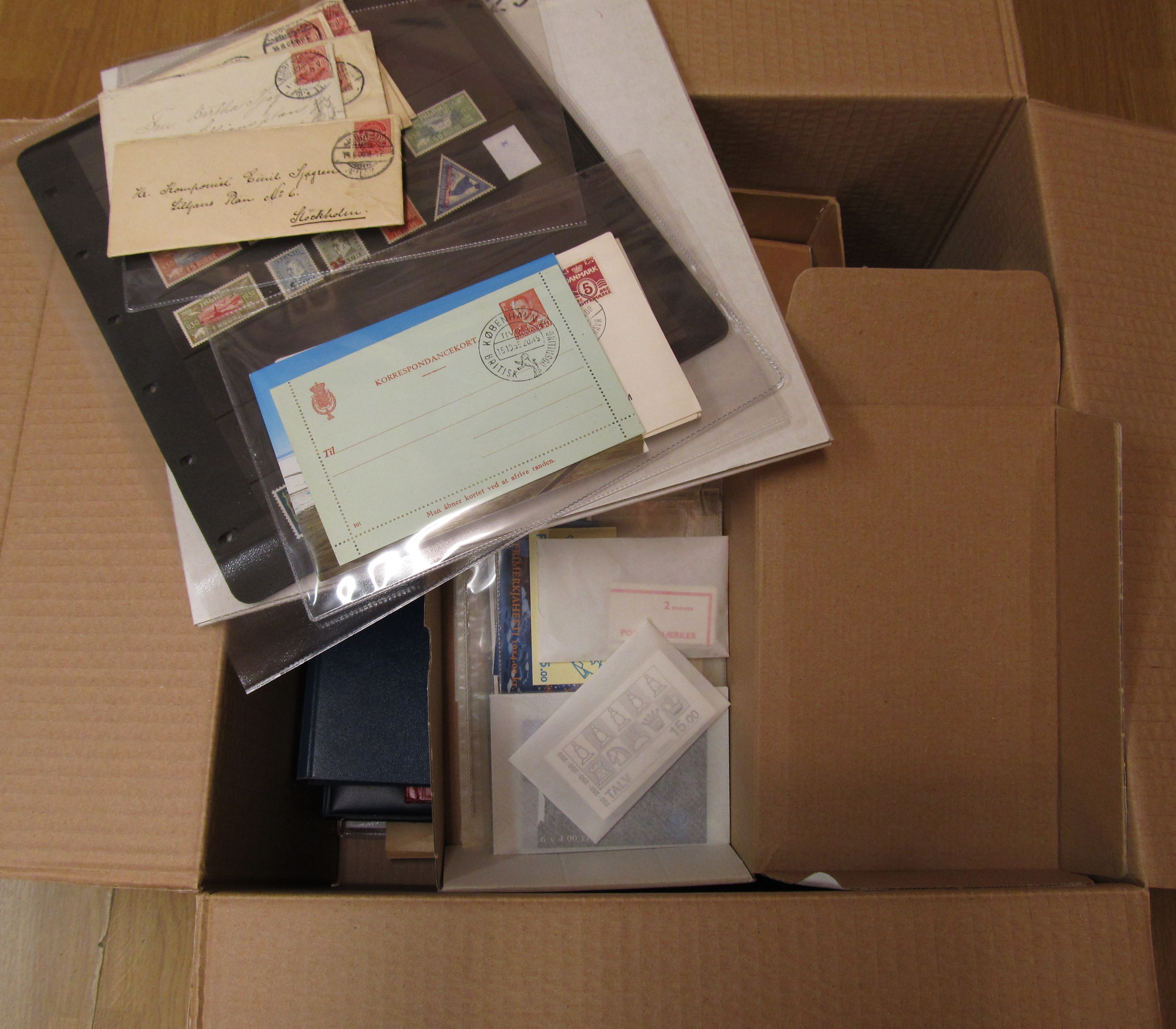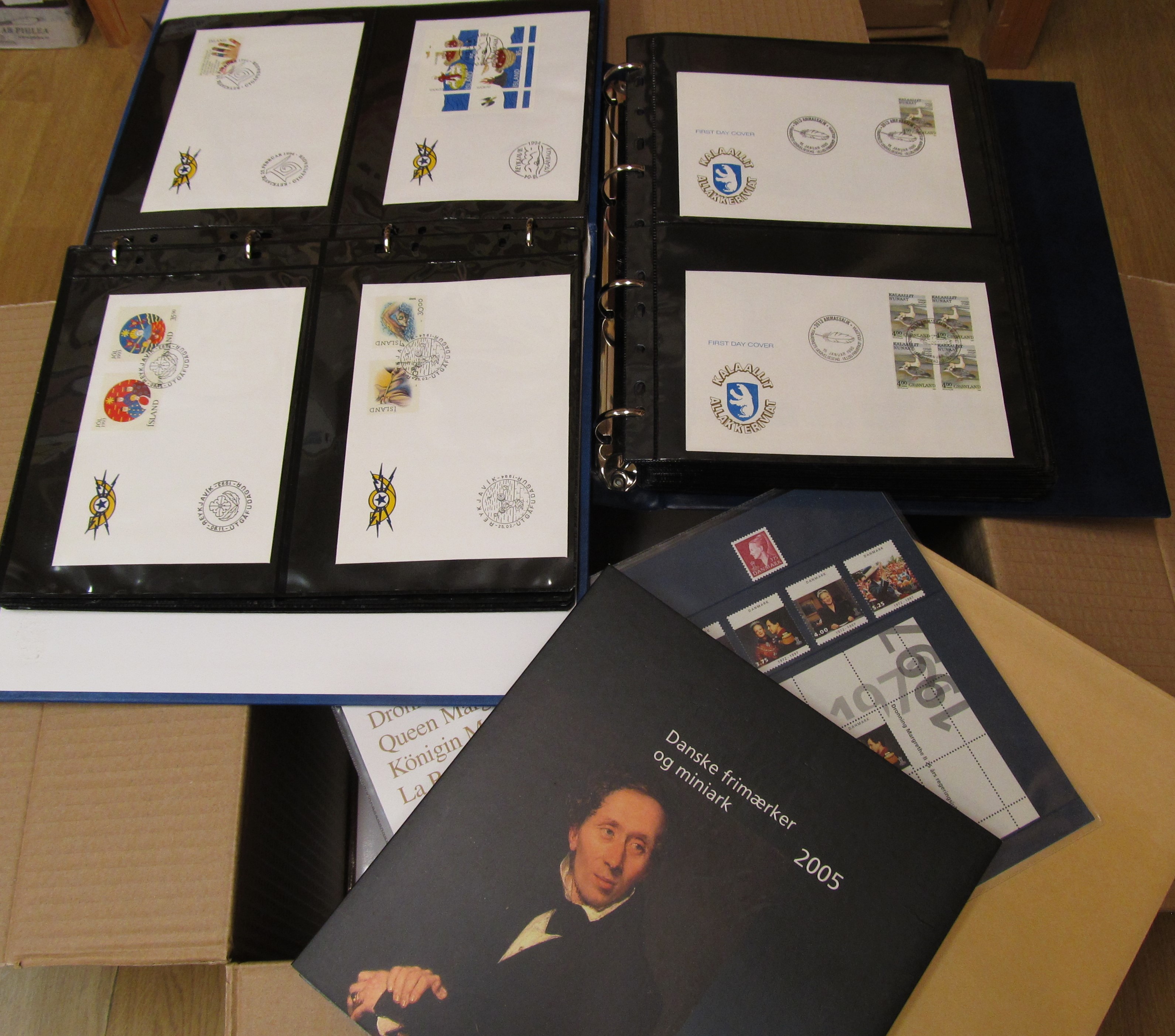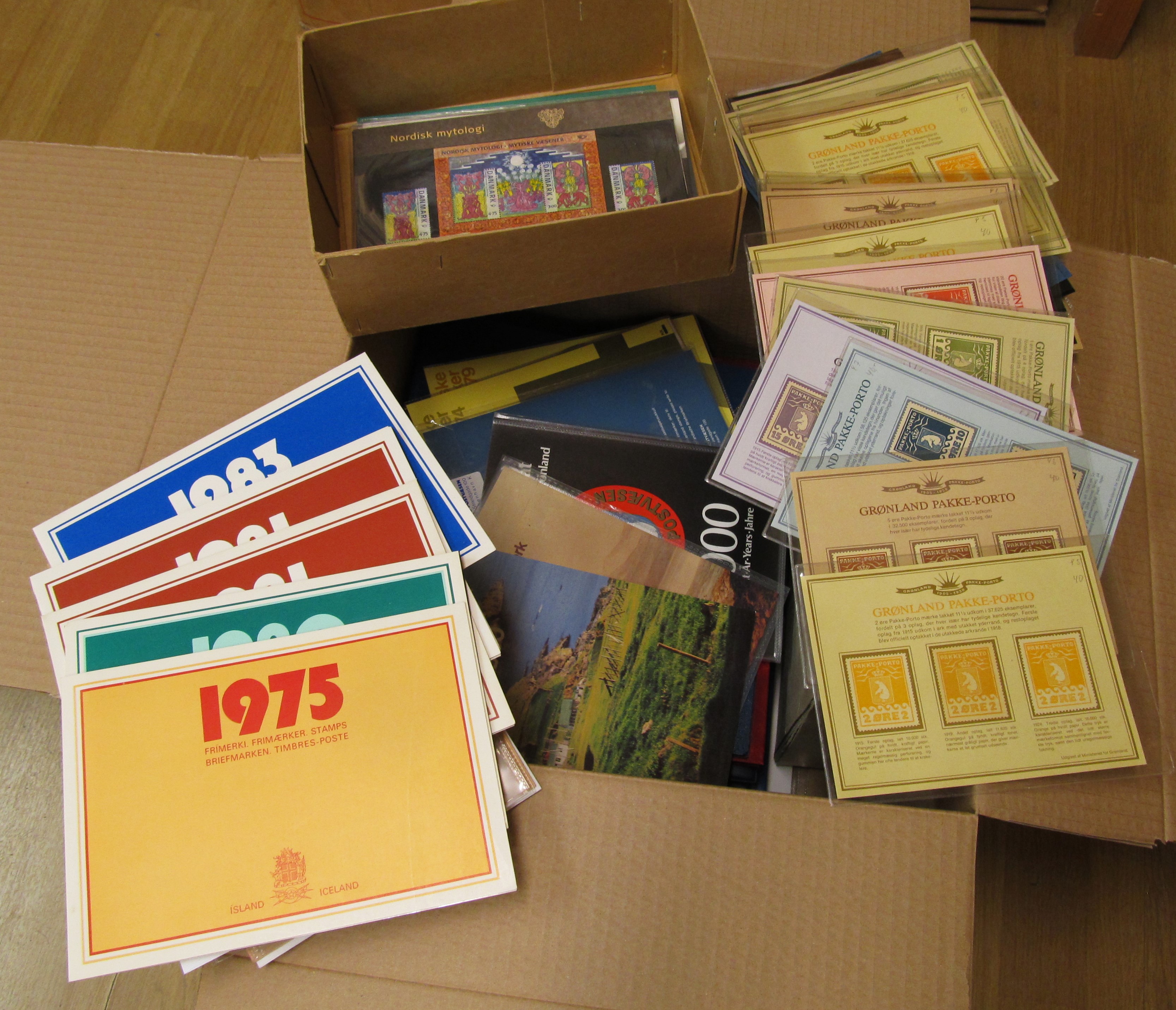 NORDIC COUNTRIES. Collection/accumulation ★★/★/⊙ 1890s-1990s in box. Denmark MNH in absolute majority, eg year sets, presentation packs. Faroe year sets and FDC´s. Greenland MNH collection, some full sheets and year sets. Iceland on Hagners and FDC in album. Also a sparsely filled collection DVI on leaves. Some scans are presented at www.philea.se. Approx. 9 kg.