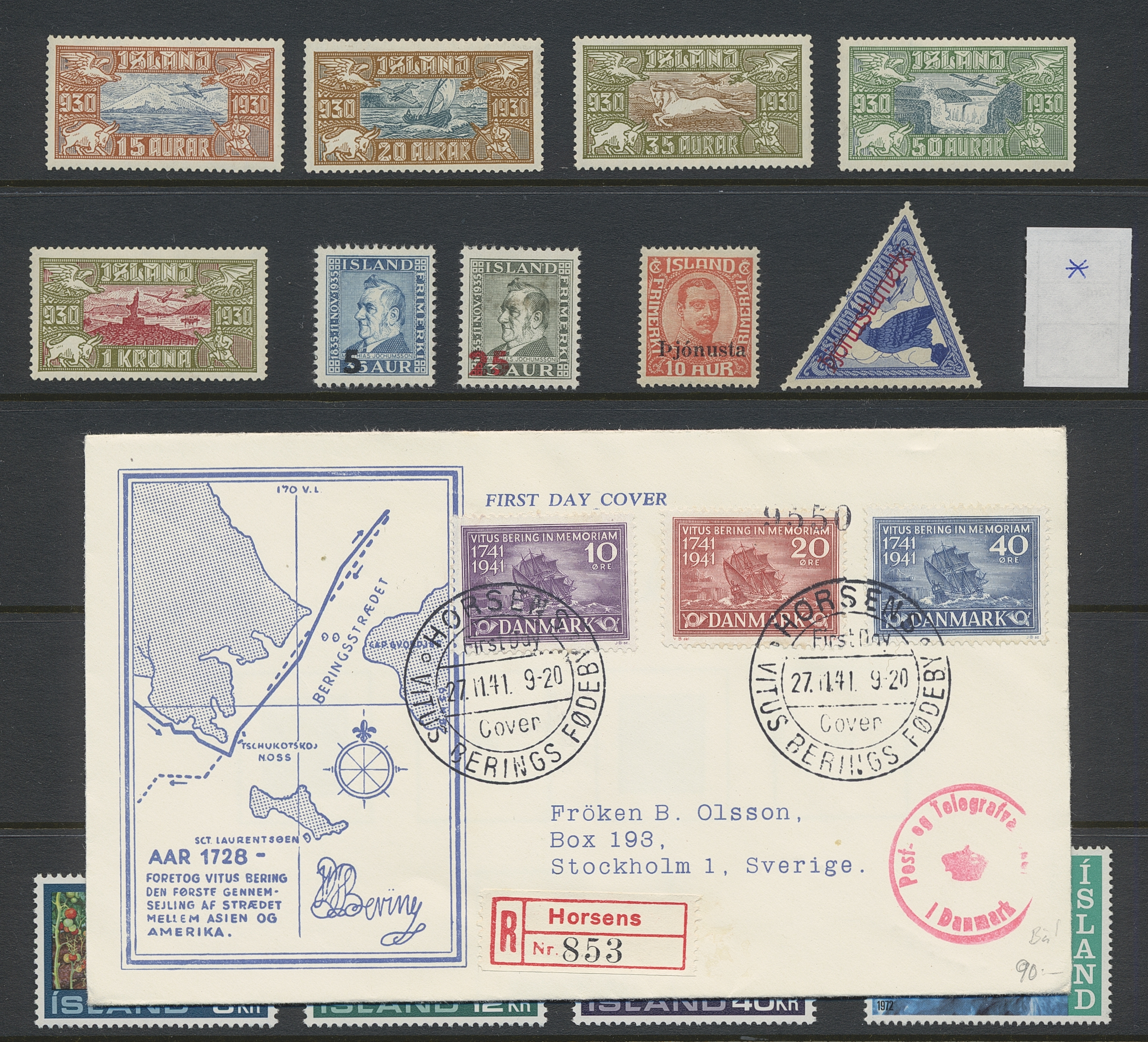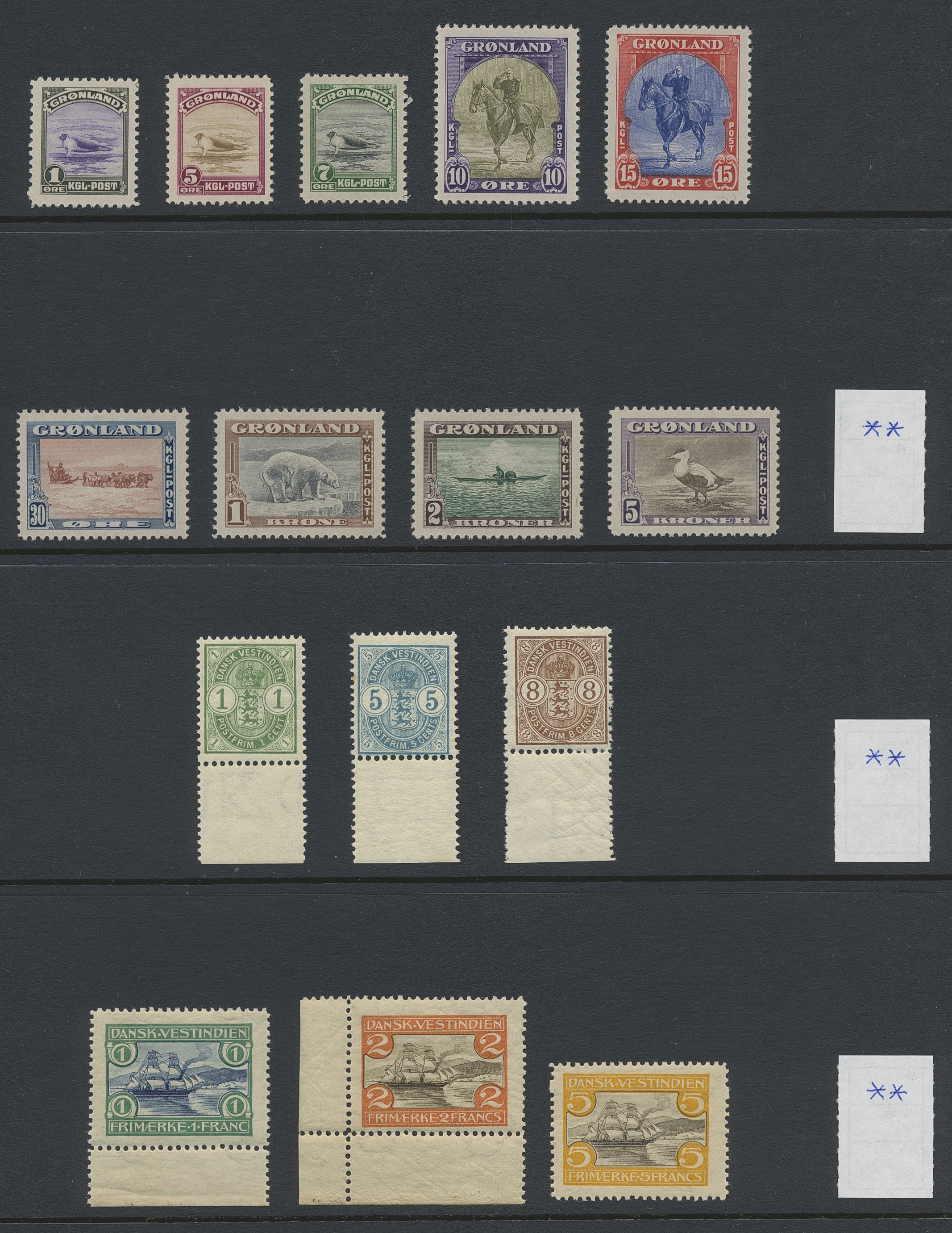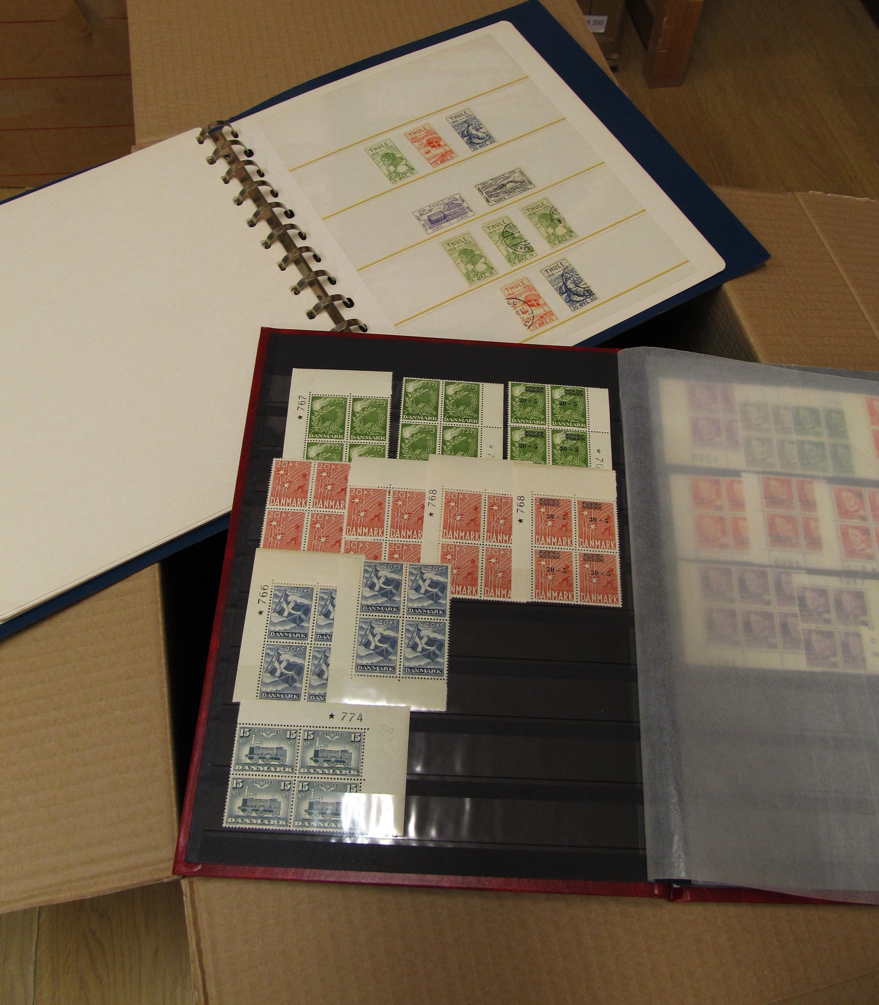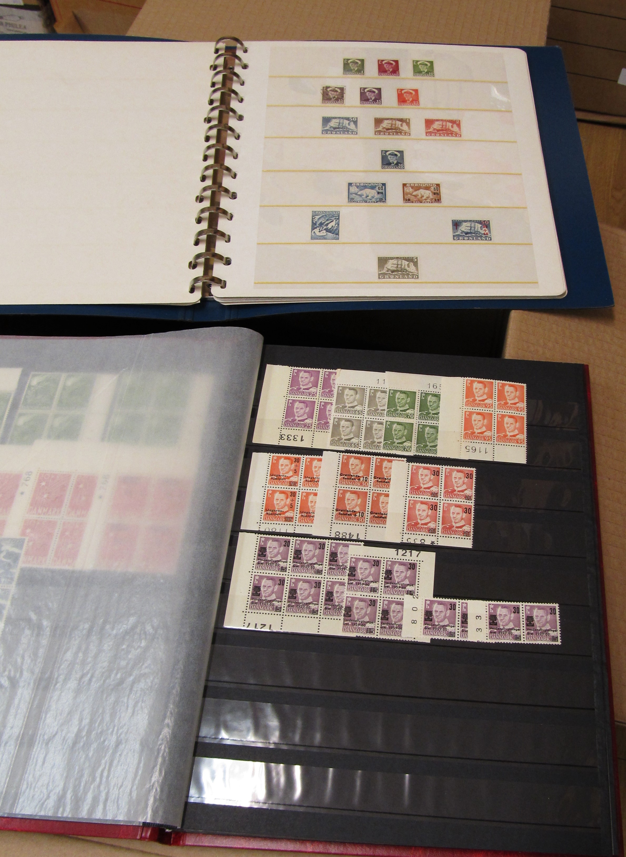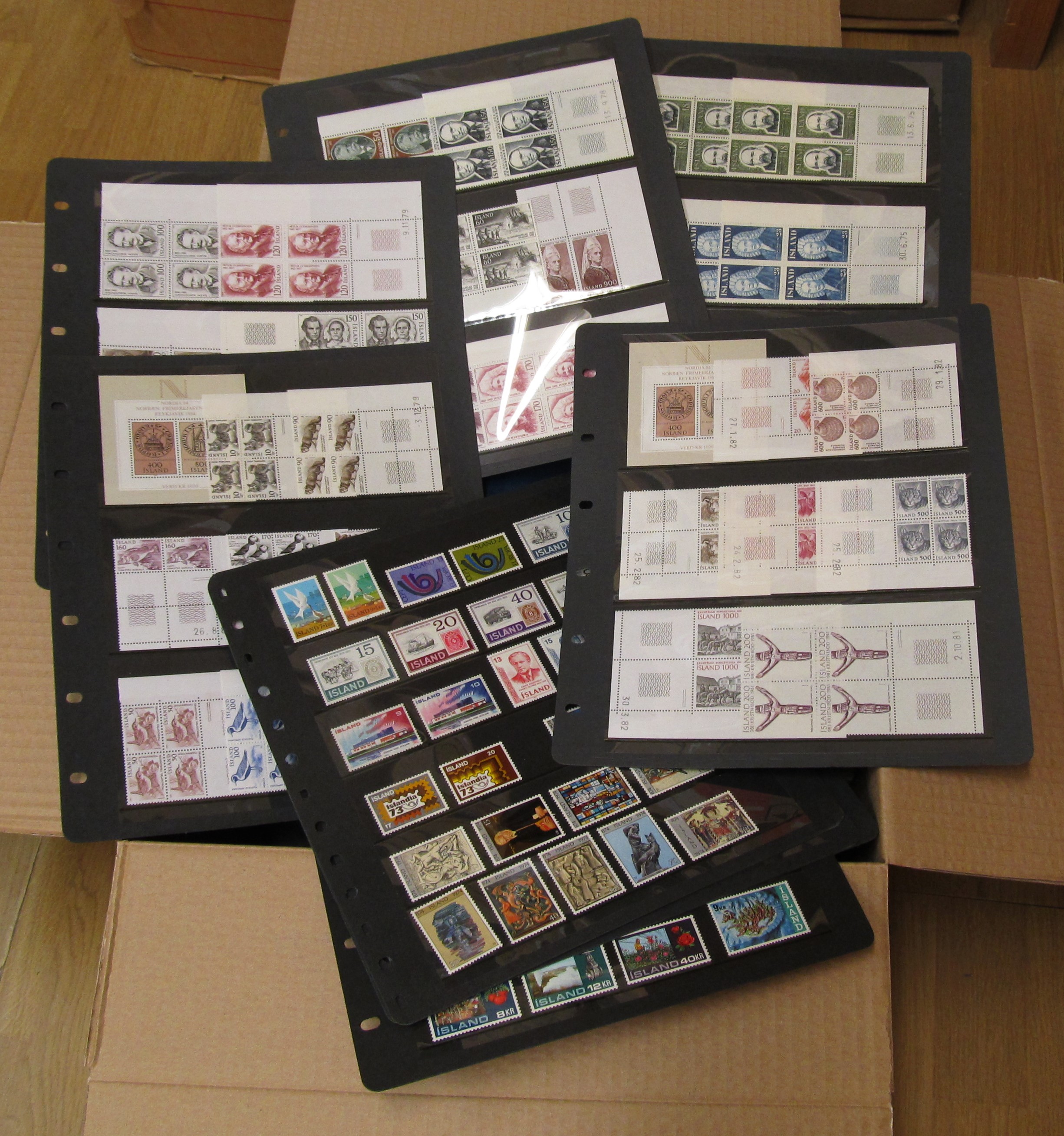 NORDIC COUNTRIES. Collection/accumulation ★★/★/⊙ 1890s-1990s in box. Denmark MNH in absolute majority, eg year sets, presentation packs. Faroe year sets and FDC´s. Greenland MNH collection, some full sheets and year sets. Iceland on Hagners and FDC in album. Also a sparsely filled collection DVI on leaves. Some scans are presented at www.philea.se. Approx. 9 kg.
