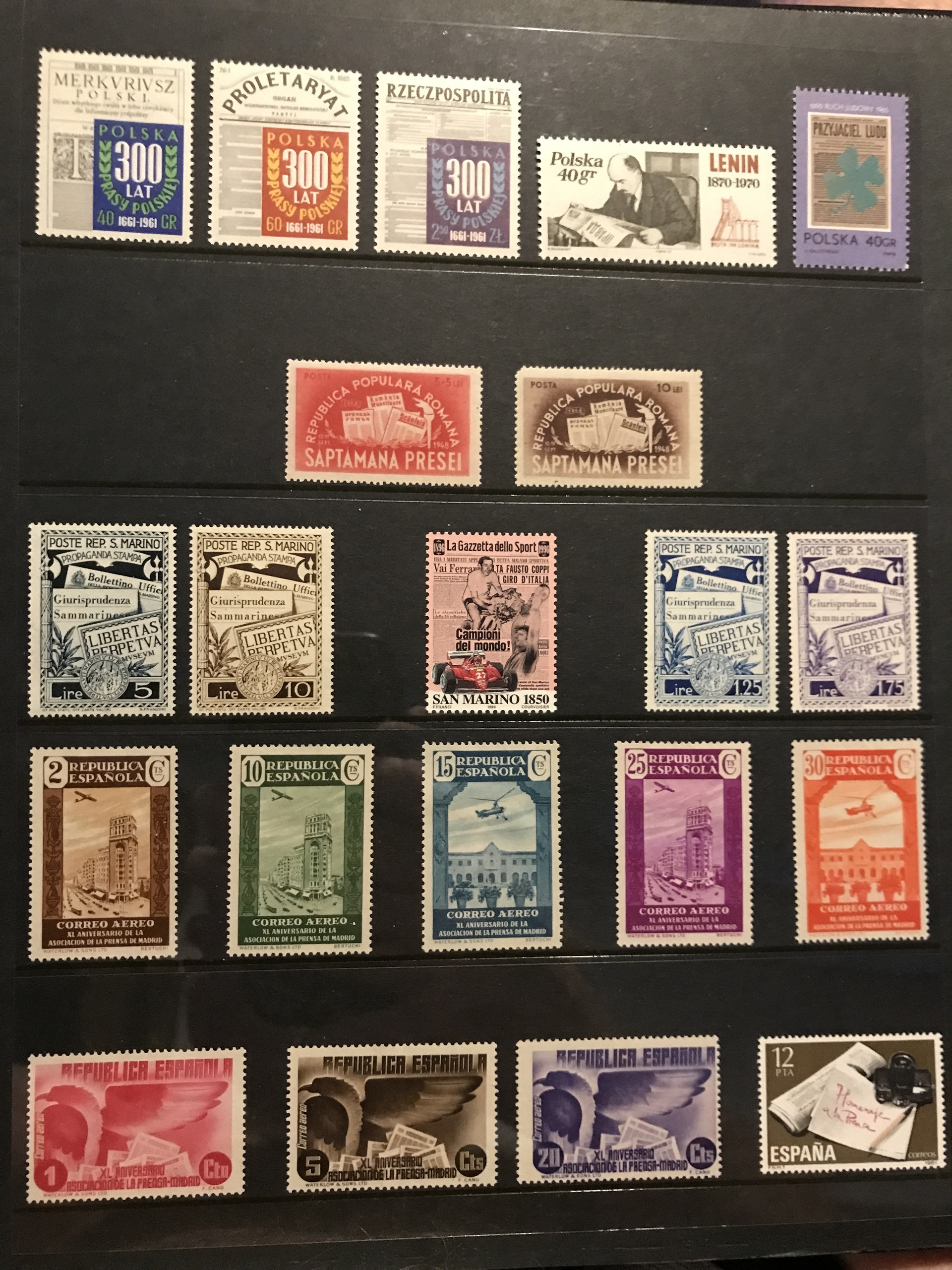 ALL WORLD. Mostly ★★. Collection USA ** 1942–1982 in Visir binder + Visir binder with thematic stamps mainly printing- and journalism, etc. incl. some souvenir sheets and covers, etc. Please see a selection of scans at www.philea.se. (2000)