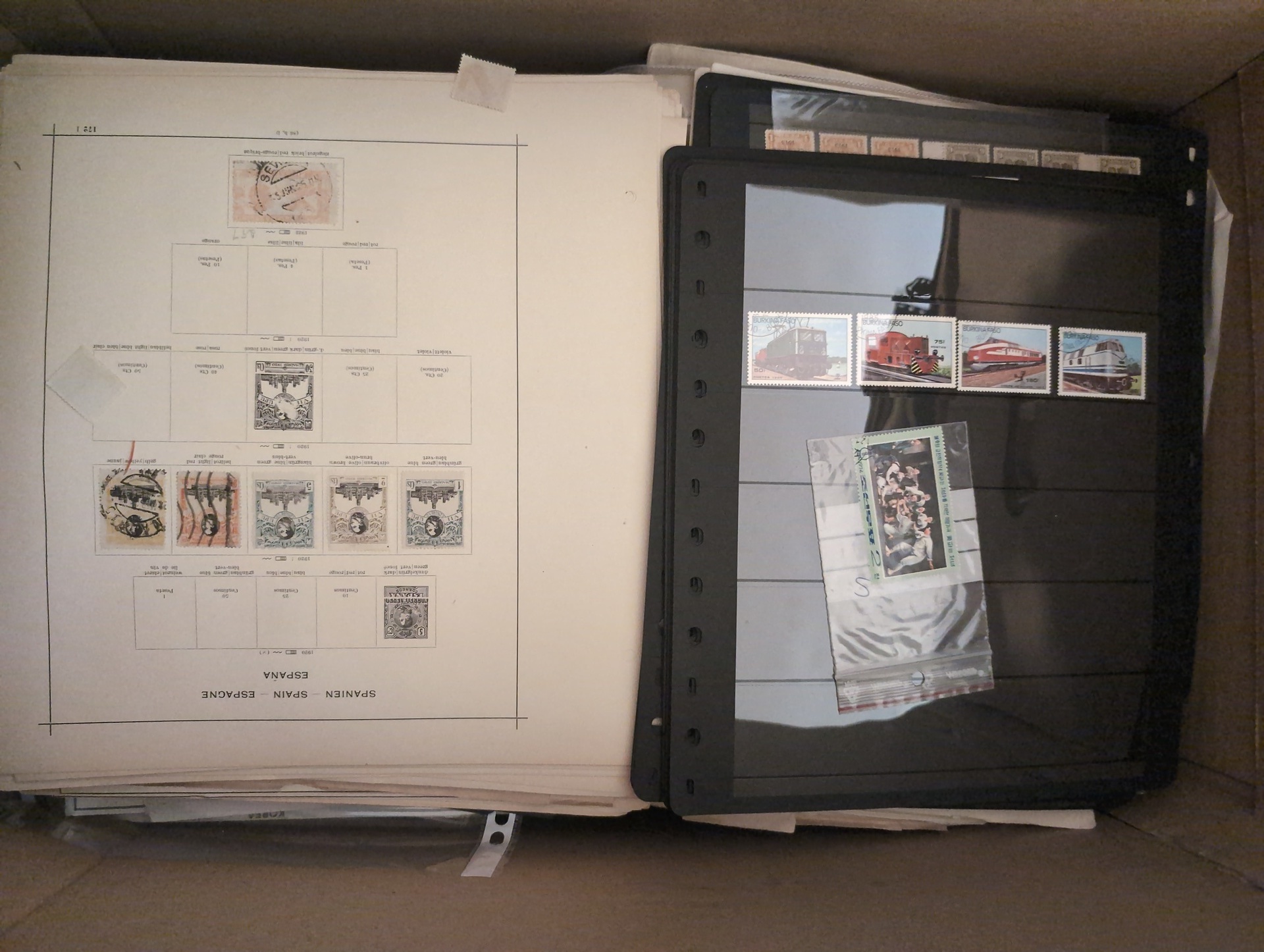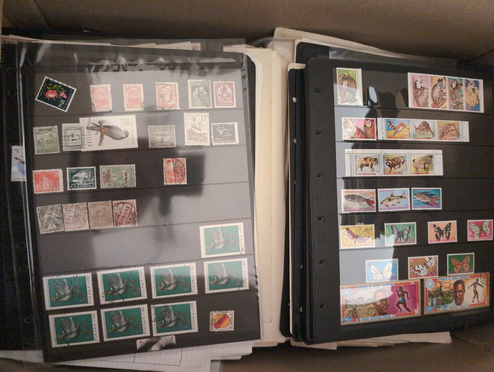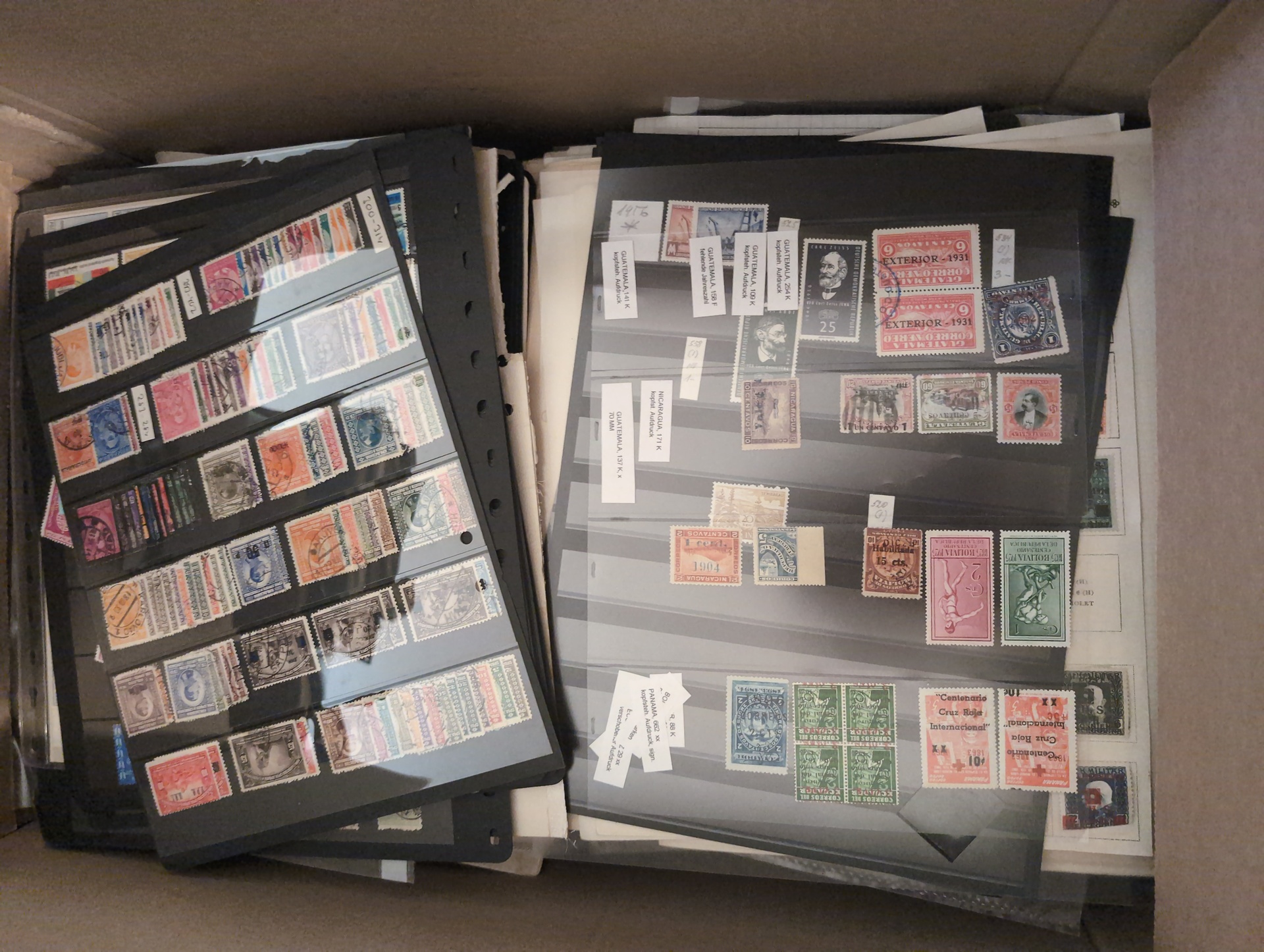 ALL WORLD. Accumulation ★★/★/⊙ 1870s–1980s in removal box. Filled with album leaves (mostly) and visir leaves. From many different countries with a wide range of stamps. Please see a selection of scans at www.philea.se. Somewhat mixed quality. Approx. 20 kg. (1000s)