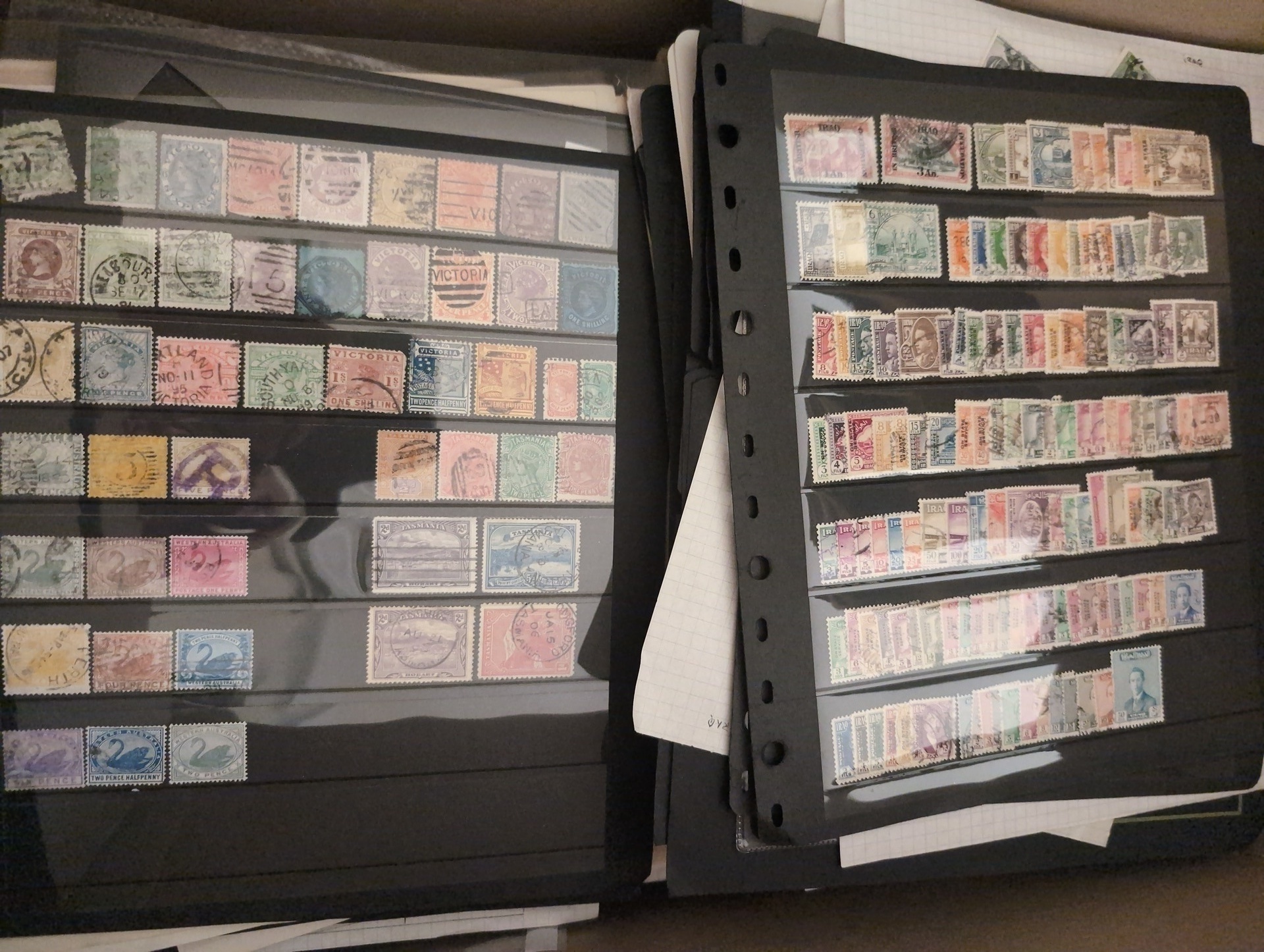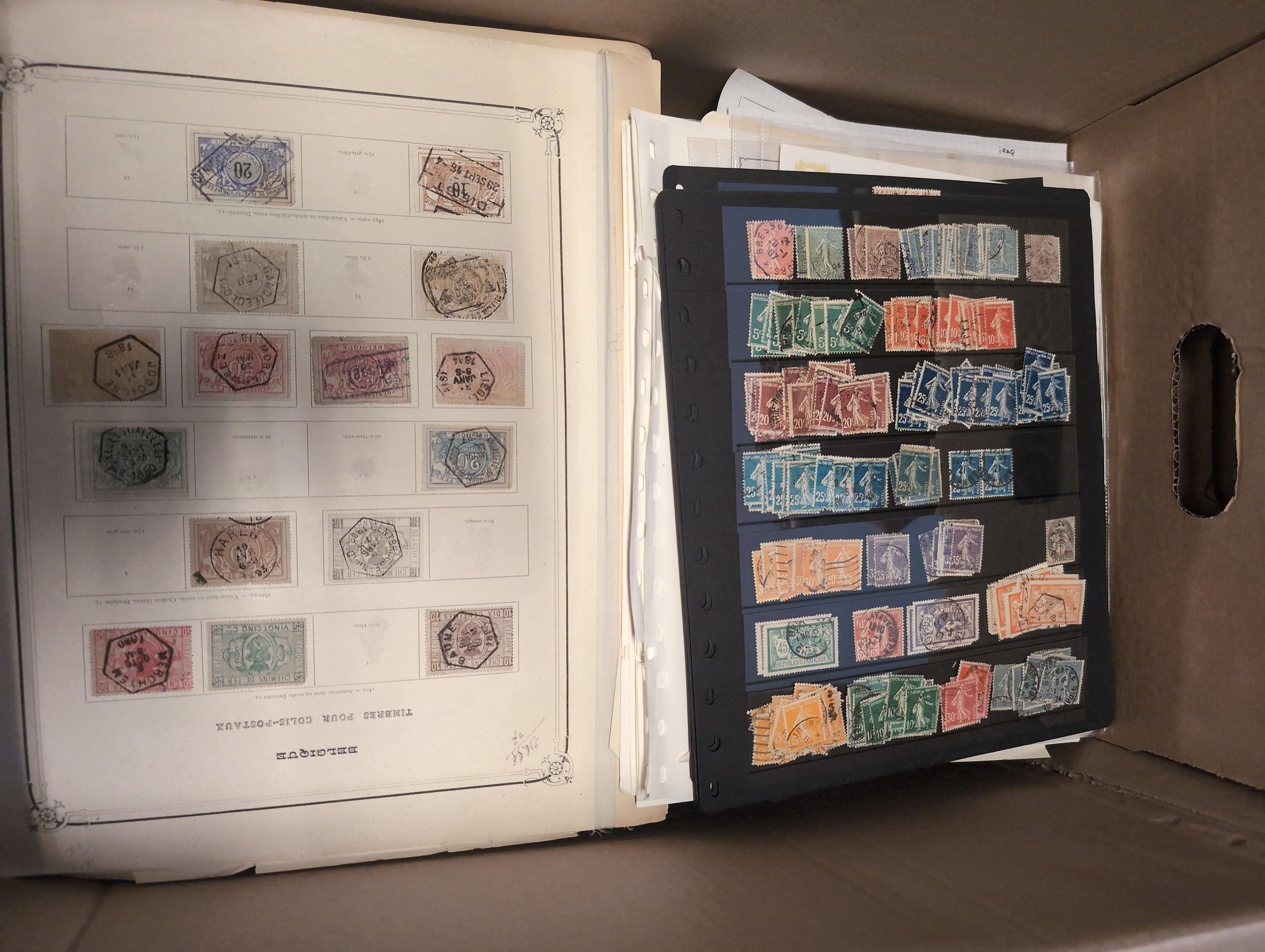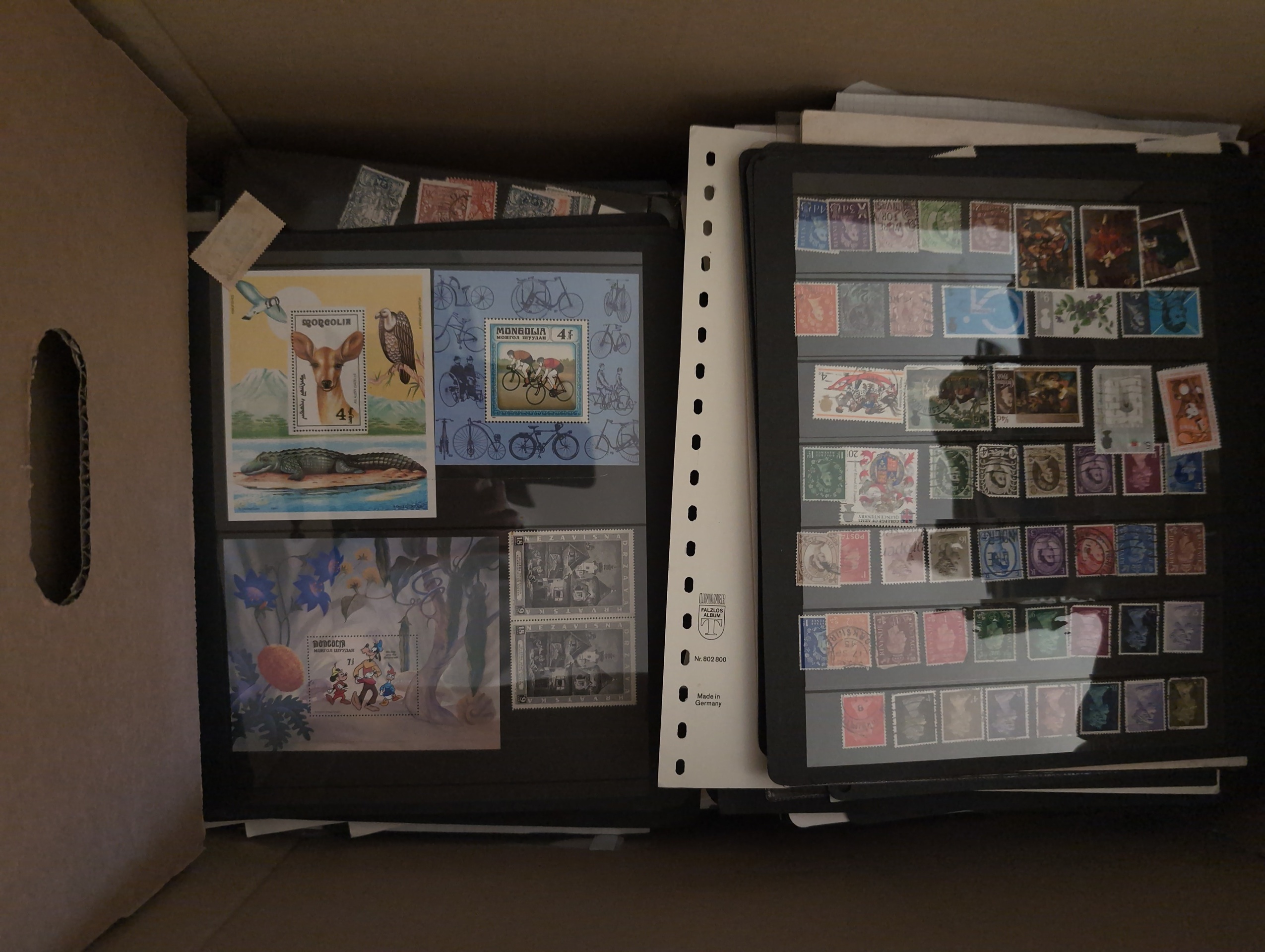 ALL WORLD. Accumulation ★★/★/⊙ 1870s–1980s in removal box. Filled with album leaves (mostly) and visir leaves. From many different countries with a wide range of stamps. Please see a selection of scans at www.philea.se. Somewhat mixed quality. Approx. 20 kg. (1000s)